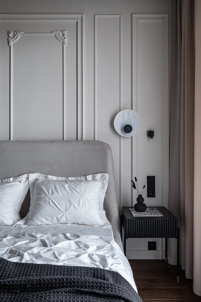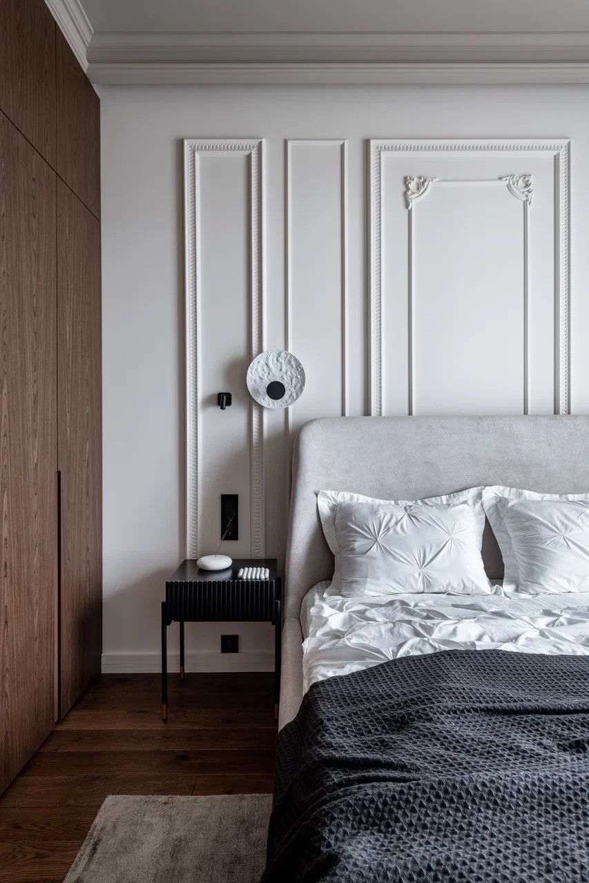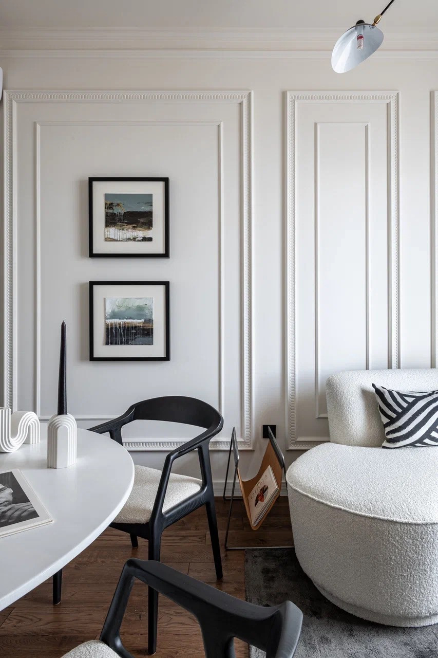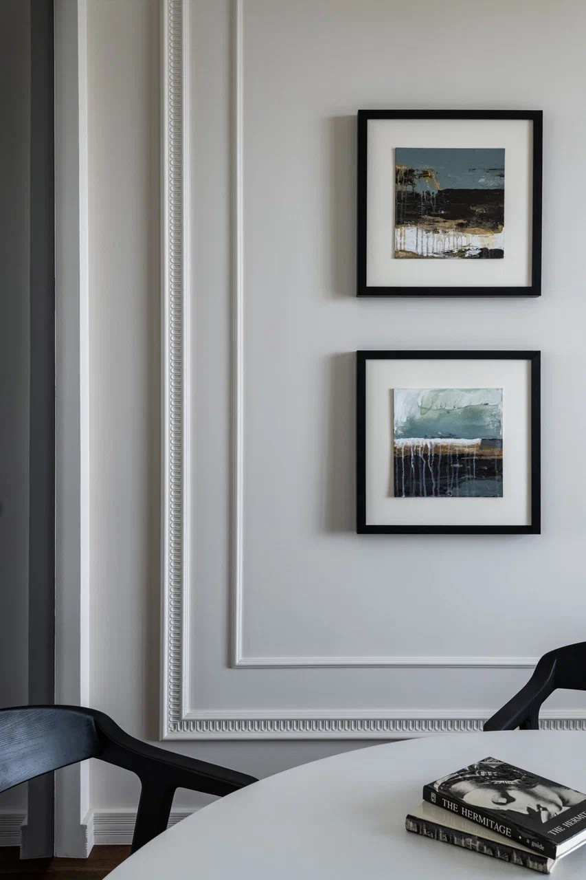 - Стены покрашены и декорированы молдингами и лепниной, что придаёт особую выразительность интерьеру