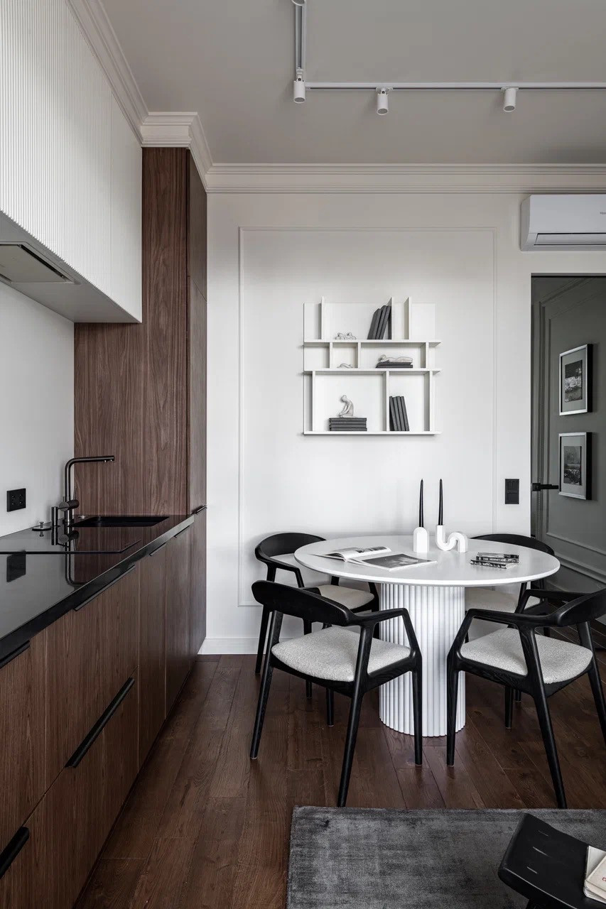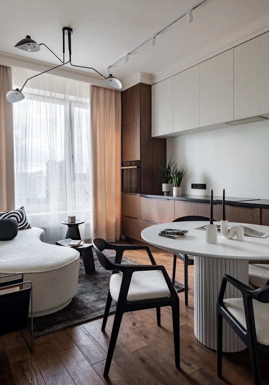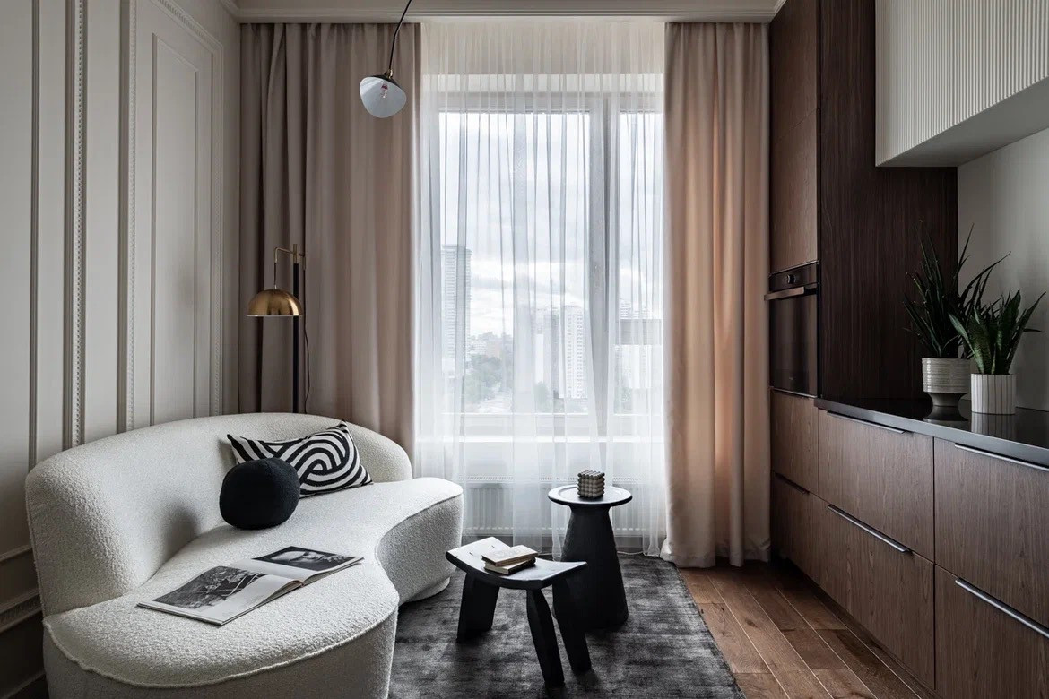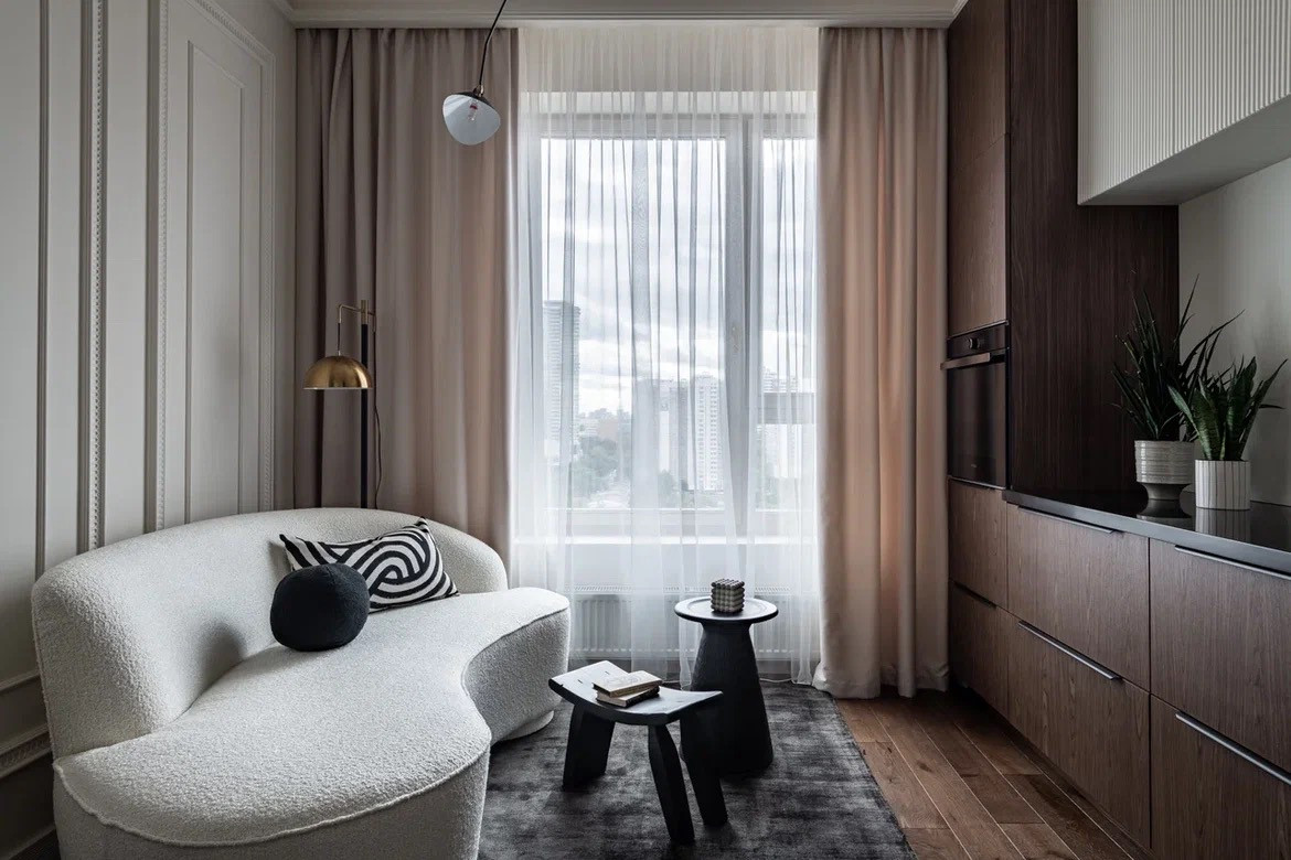 Планировка: кухня-гостиная, спальня, гардеробная, с/у с системой хранения.
