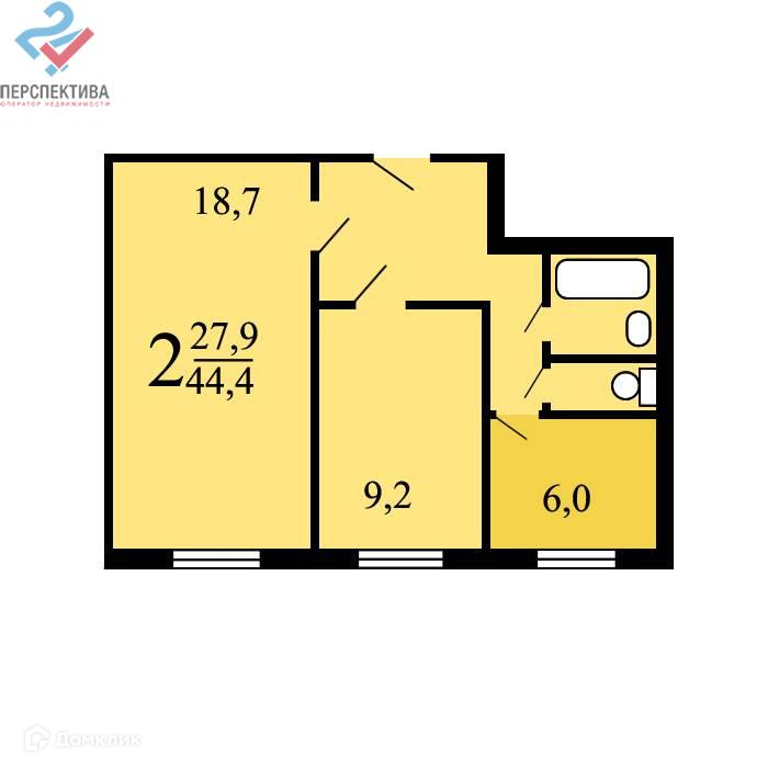 Общая площадь 44.4 м2