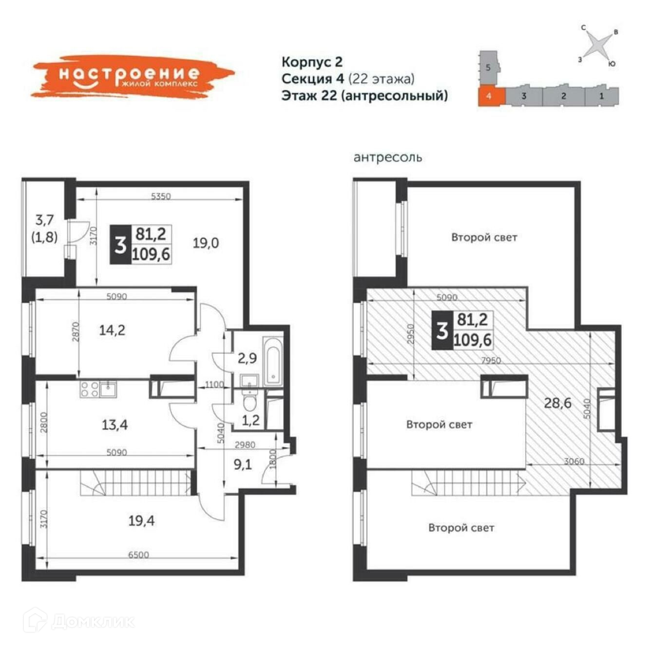 Номер лота: 60733. КЛЮЧИ НА РУКАХ. Оперативный показ. Предлагается видовая 4-комнатная квартира свободной планировки, с антресолью, без отделки, площадью 109,6 м² на 22-м этаже 22-этажного монолитного сданного дома в жилом комплексе «Настроение» (Корпус 2).