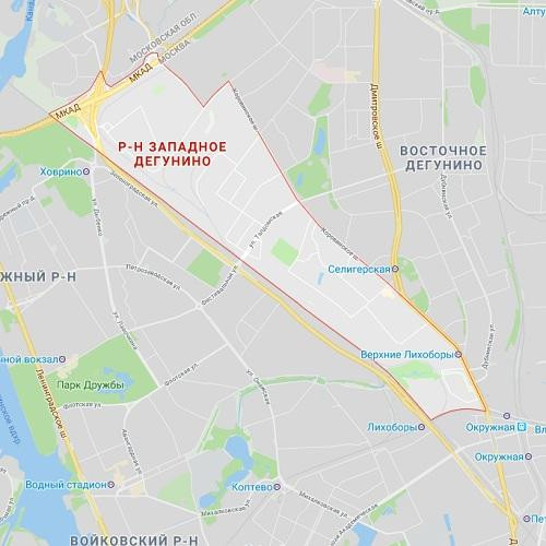 р-н Дегунино Западное— район с развитой медицинской и транспортной инфраструктурой. На территории расположены несколько медицинских центров. Кроме того, за последние два года здесь открылись четыре станции метро, две станции МЦК и запущена пятиуровневая Бусиновская развязка — одна из самых больших в мире.