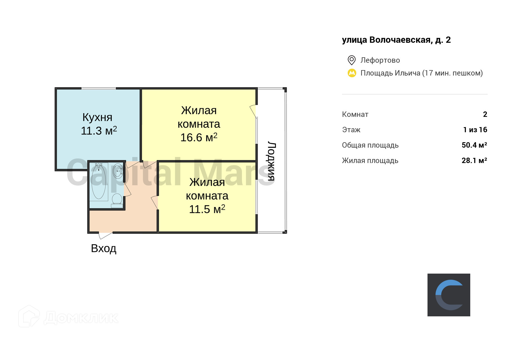2-комнатная квартира, 50.4 м2, этаж 1 / 16, на продажу в Москве, Волочаевская улица, 2
