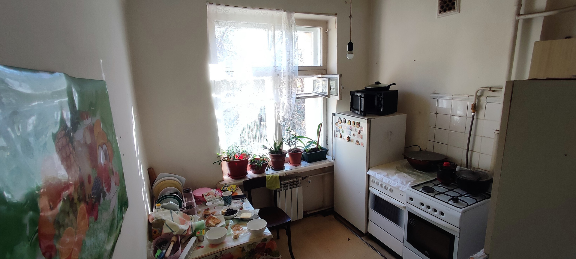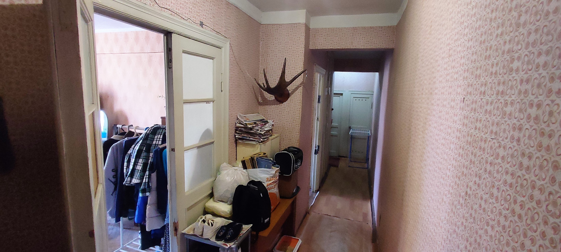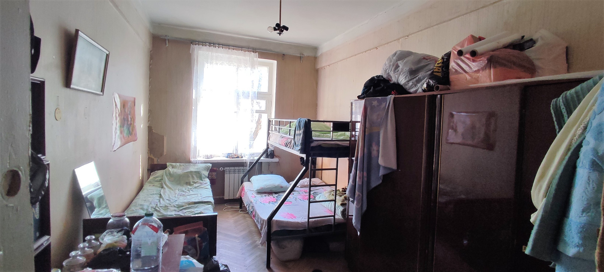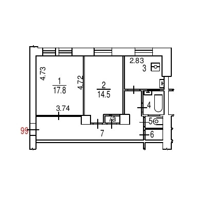 Общая площадь - 60.1 кв.м., изолированные комнаты 18 и 14 кв.м., кухня 7.5кв.м., раздельный санузел, кладовая, балкона/лоджии нет, все окна во двор, планировка "линейка", без ремонта.