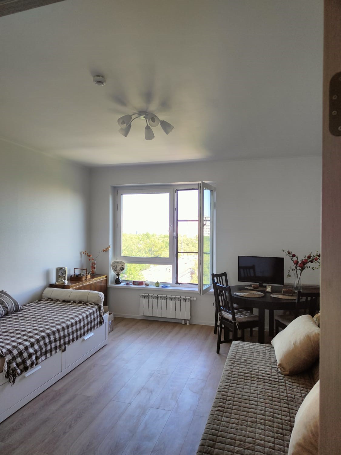 Квартира очень теплая, но за счет расположения окон на восток и юг легко проветривается и не перегревается во второй половине дня. Можно обойтись без кондиционера в жару.