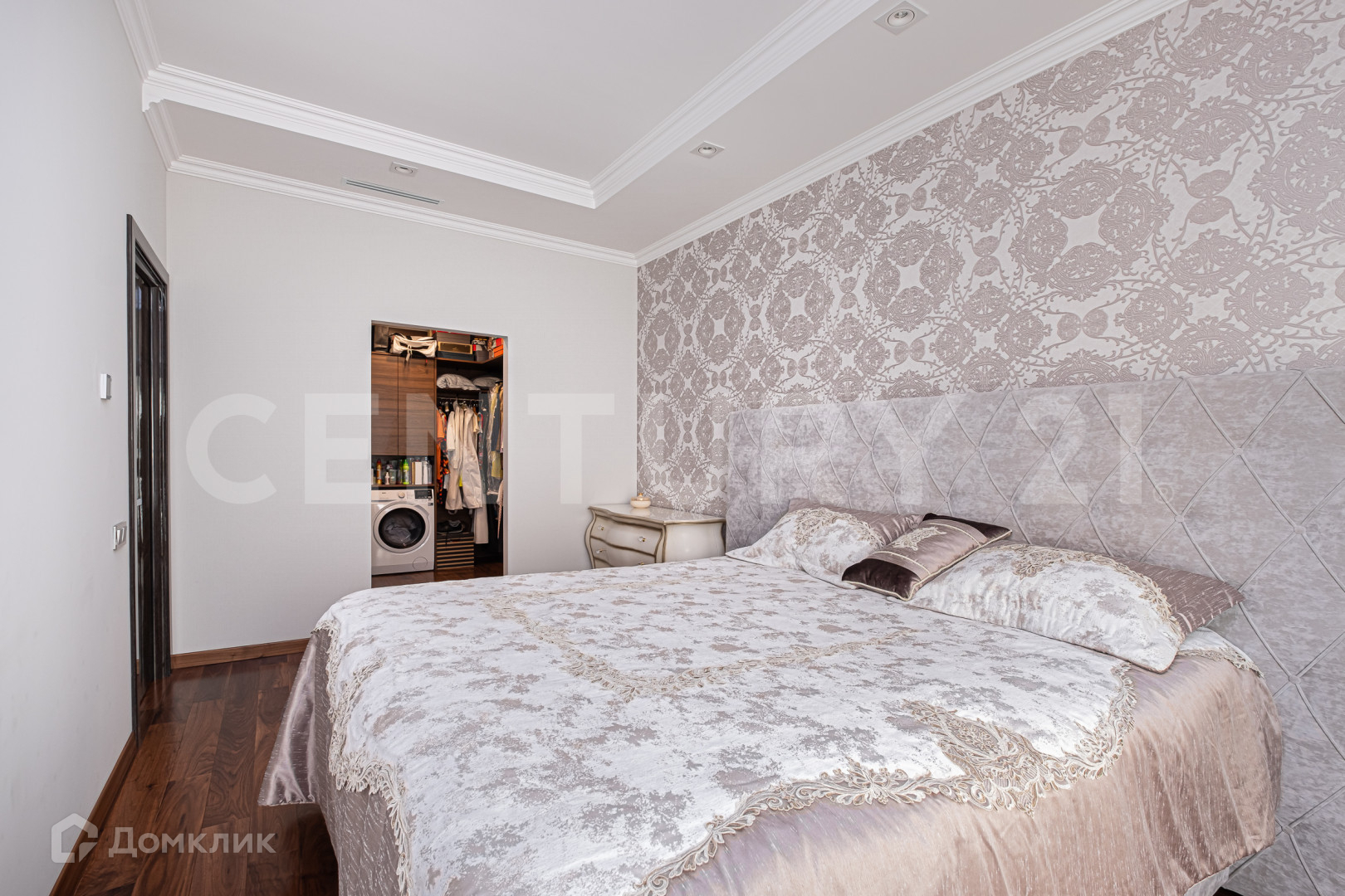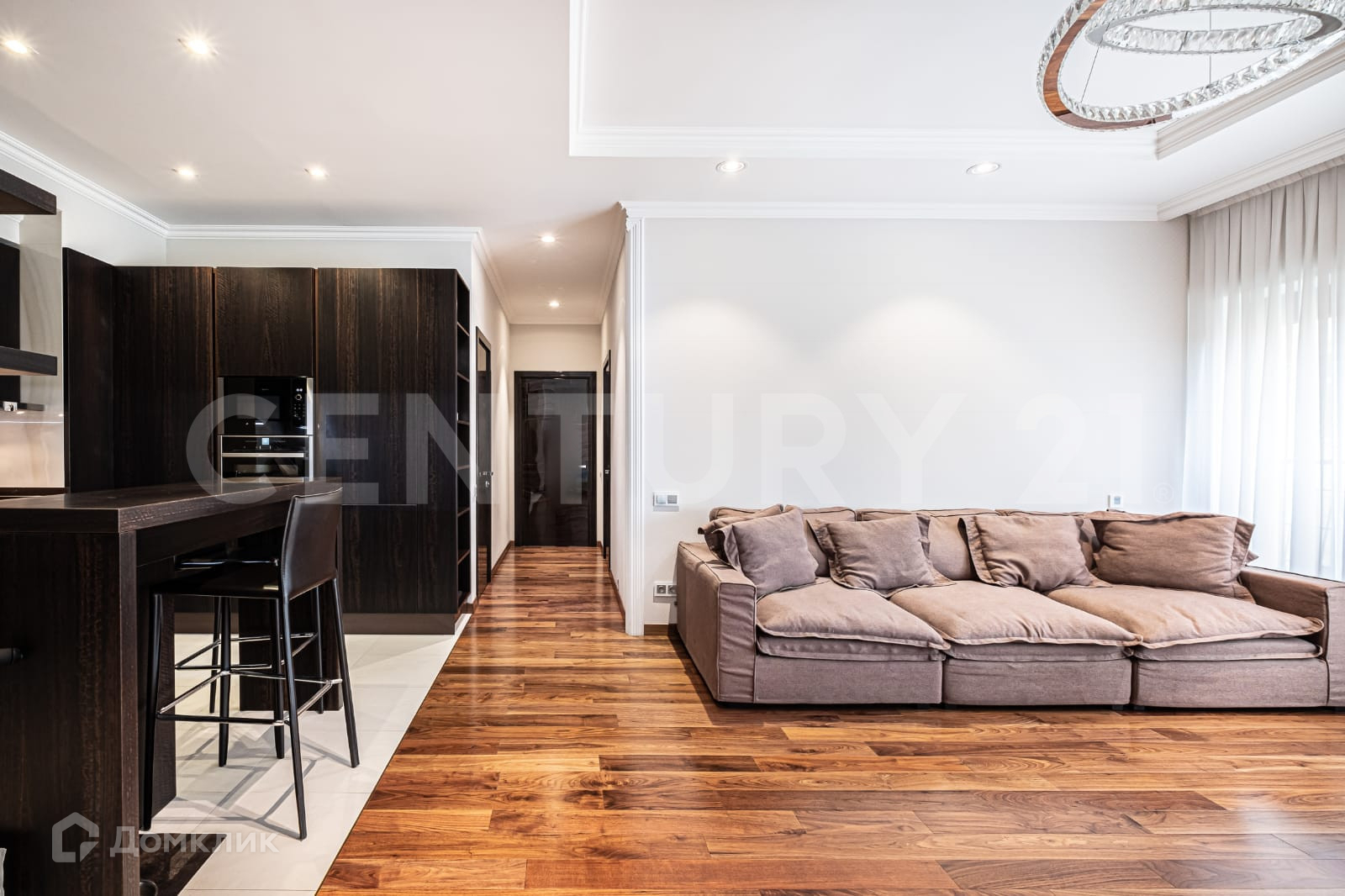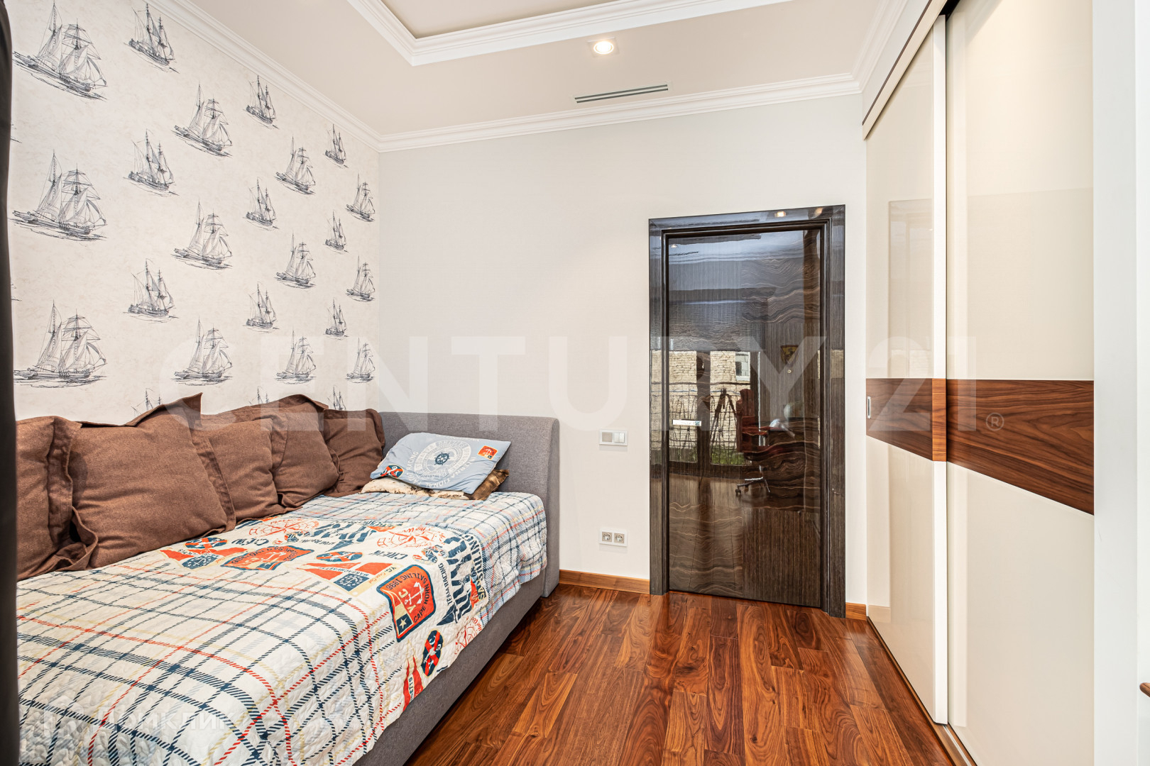 Две изолированные спальни, напротив каждой из спален свой санузел и на против родительской спальни своя гардеробная ,а так же просторная гостиная объединенная с кухней . Над дизайном работало одно из известных архитектурных бюро.