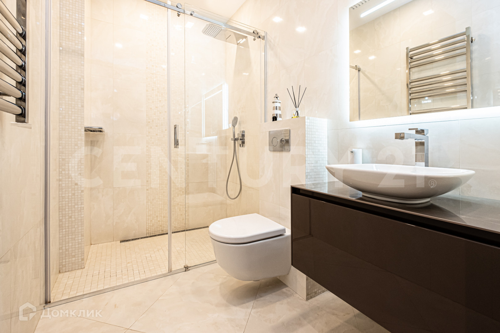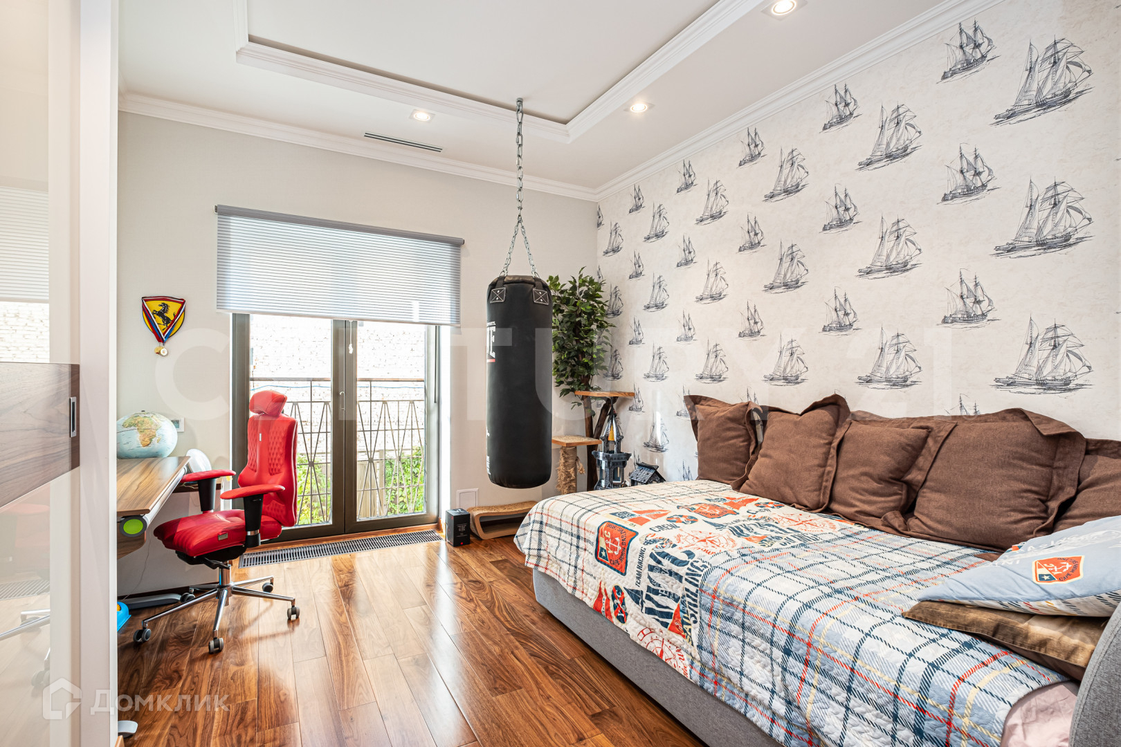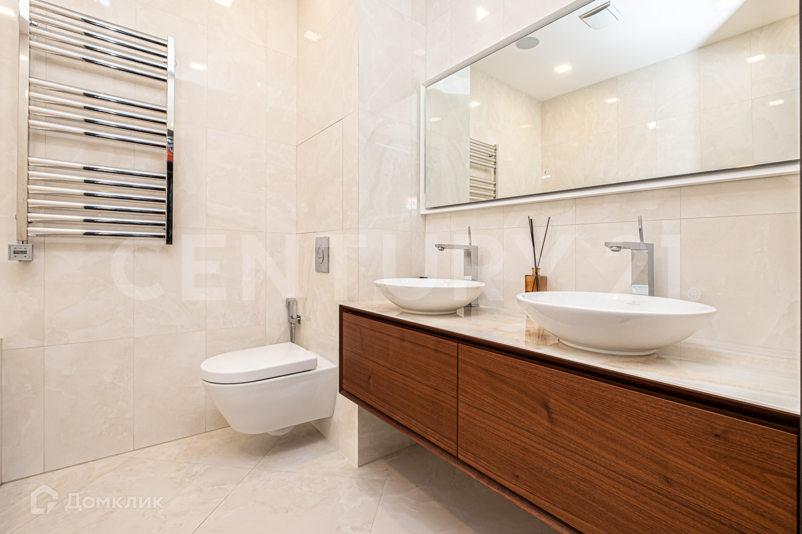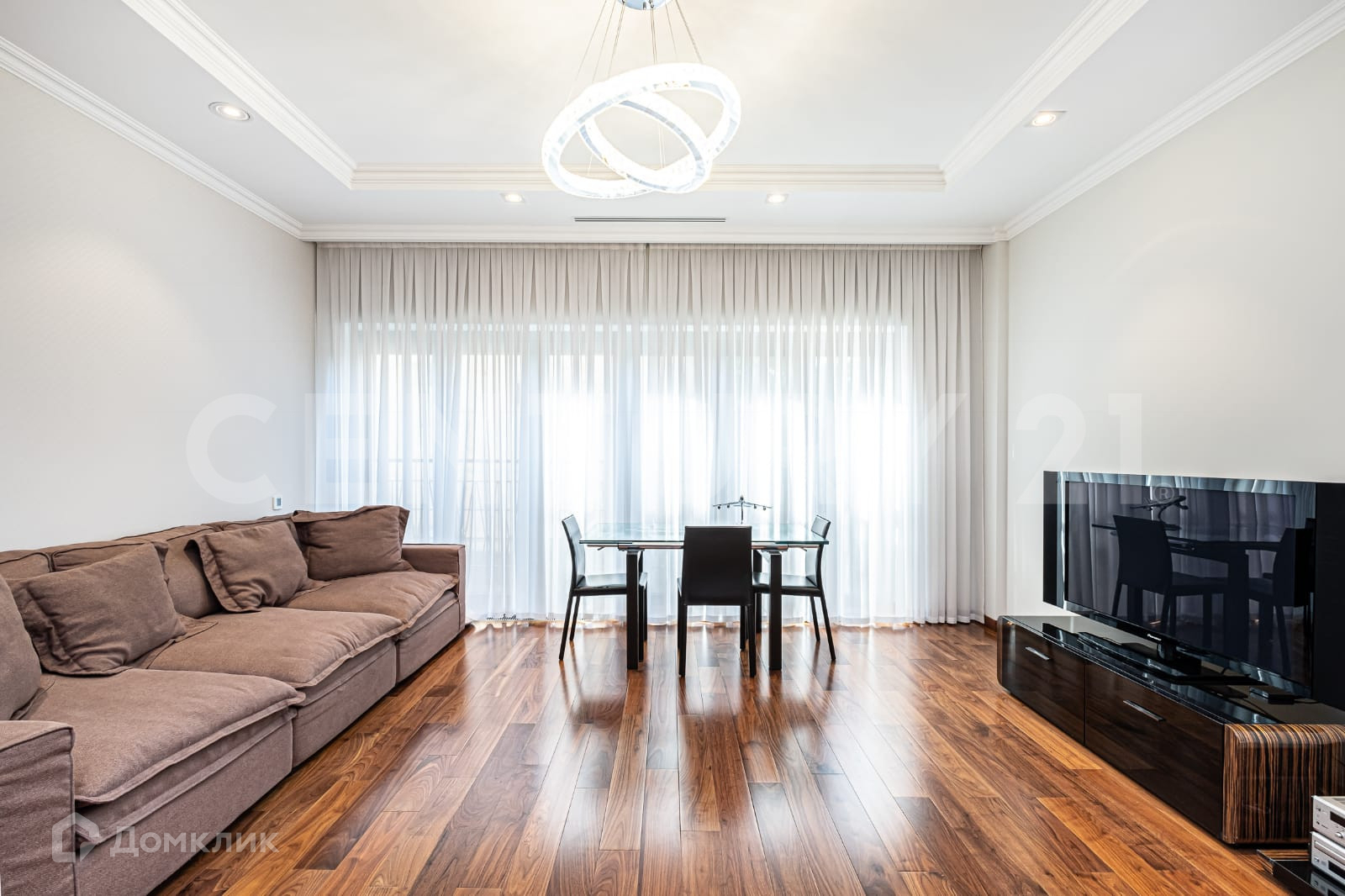 Две изолированные спальни, напротив каждой из спален свой санузел и на против родительской спальни своя гардеробная ,а так же просторная гостиная объединенная с кухней . Над дизайном работало одно из известных архитектурных бюро.
