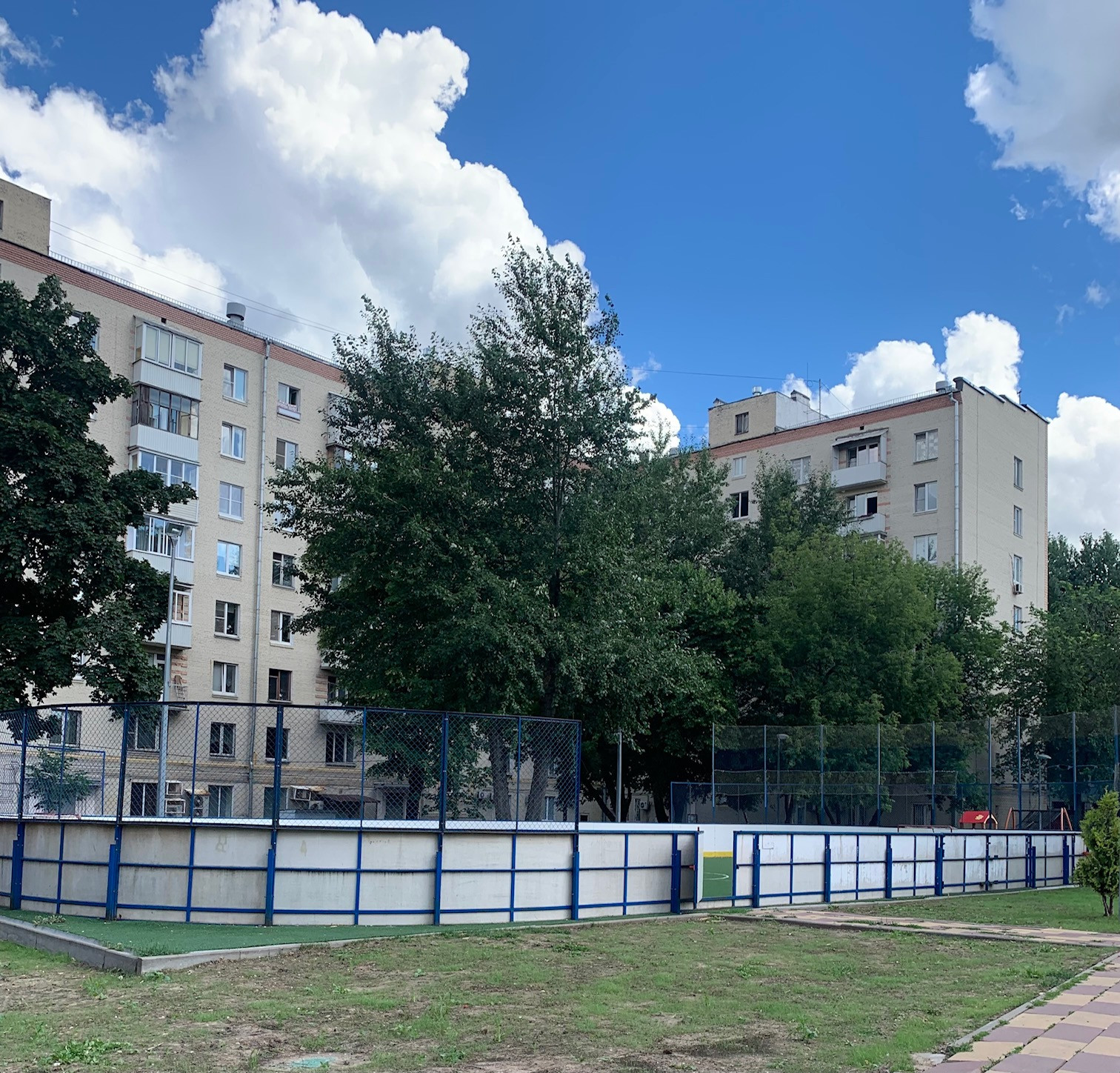во дворе дома разнообразные детские и спортивные площадки: каток,