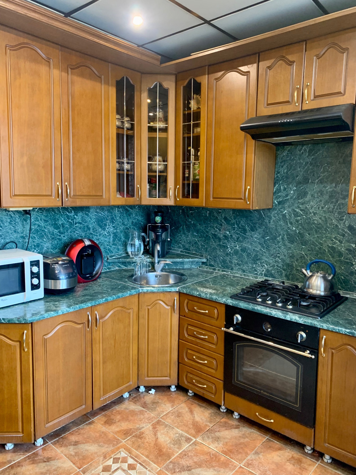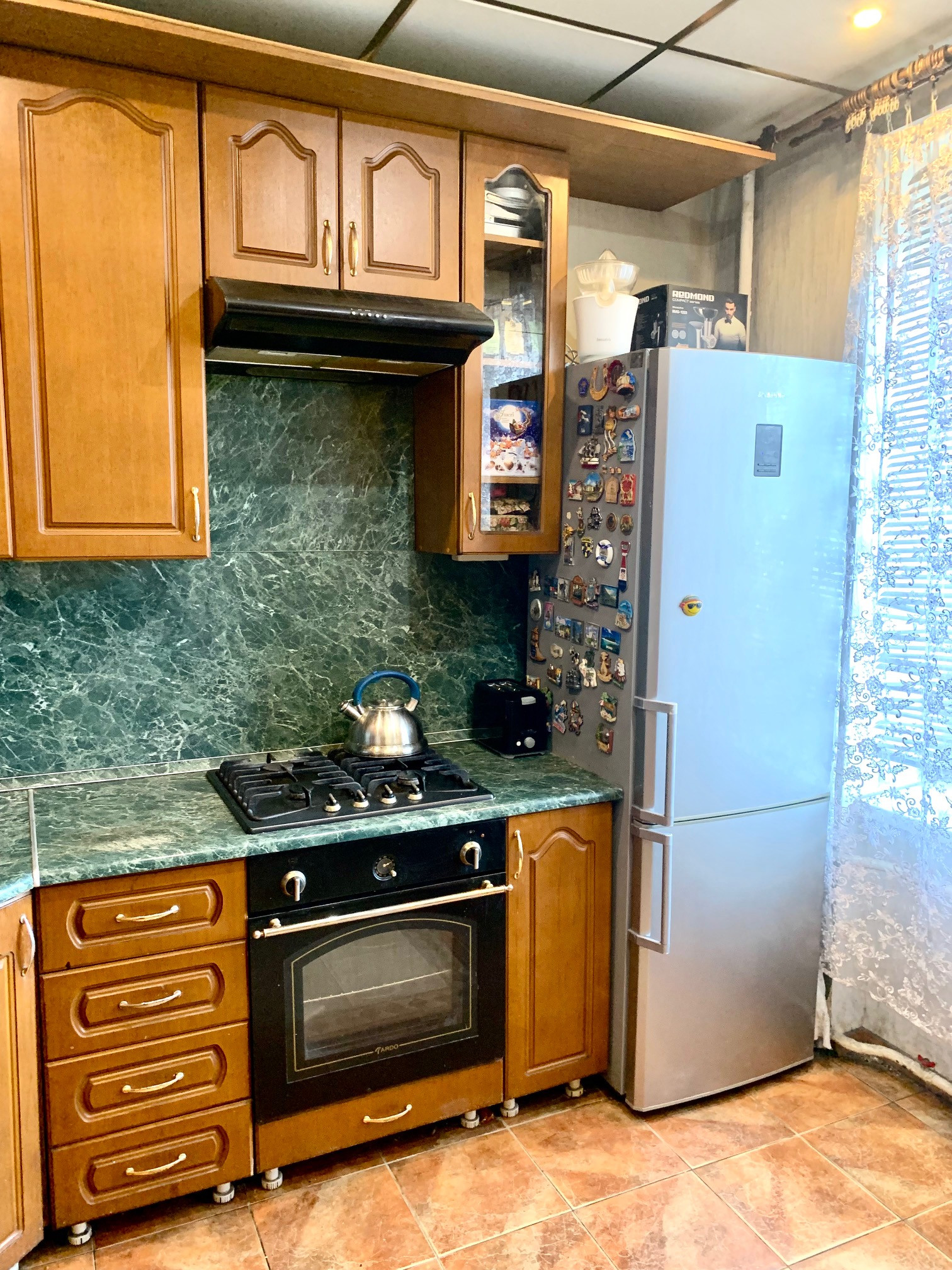 кухонный гарнитур, варочная поверхность, шкаф, стенка, диван.
