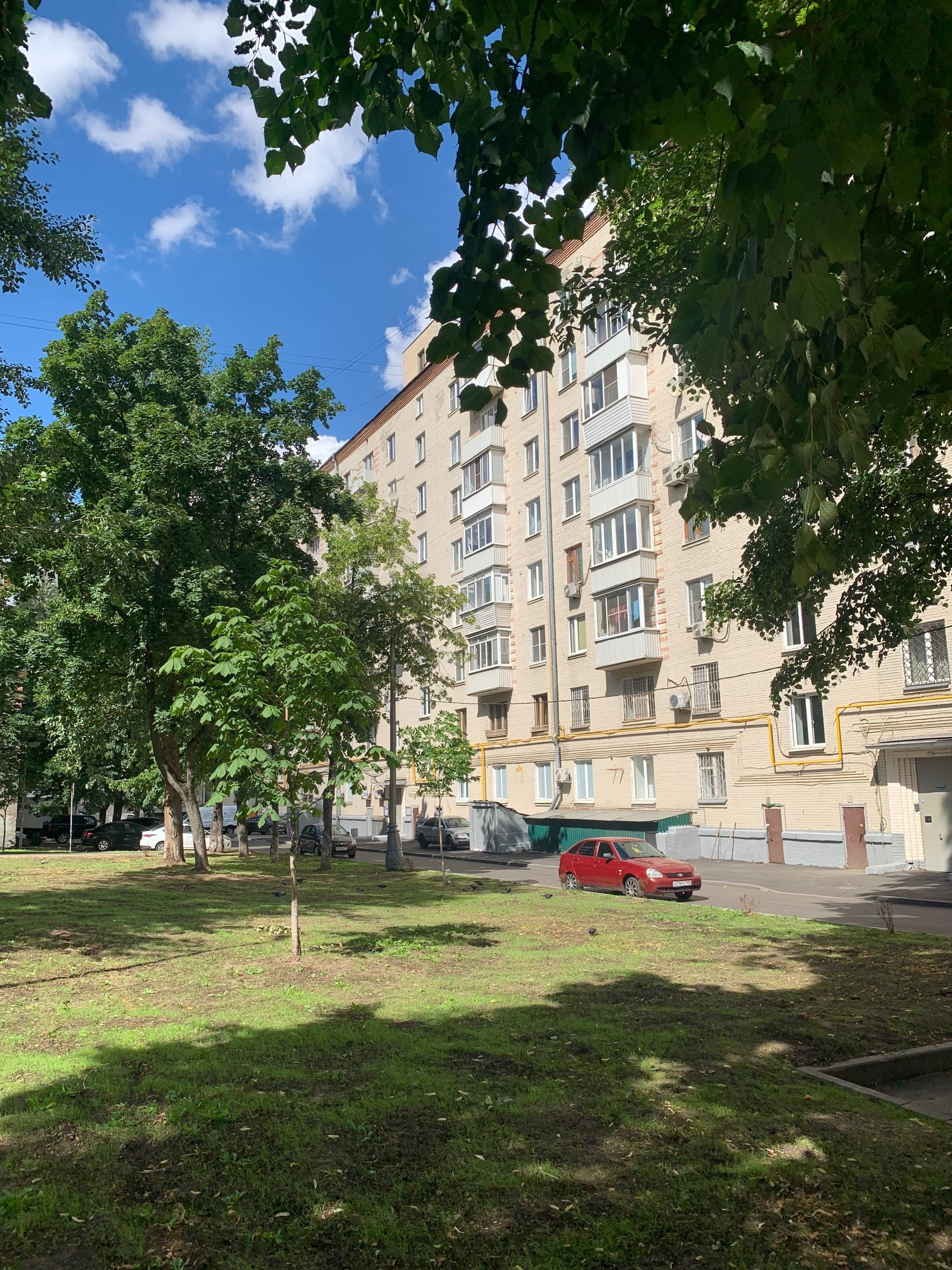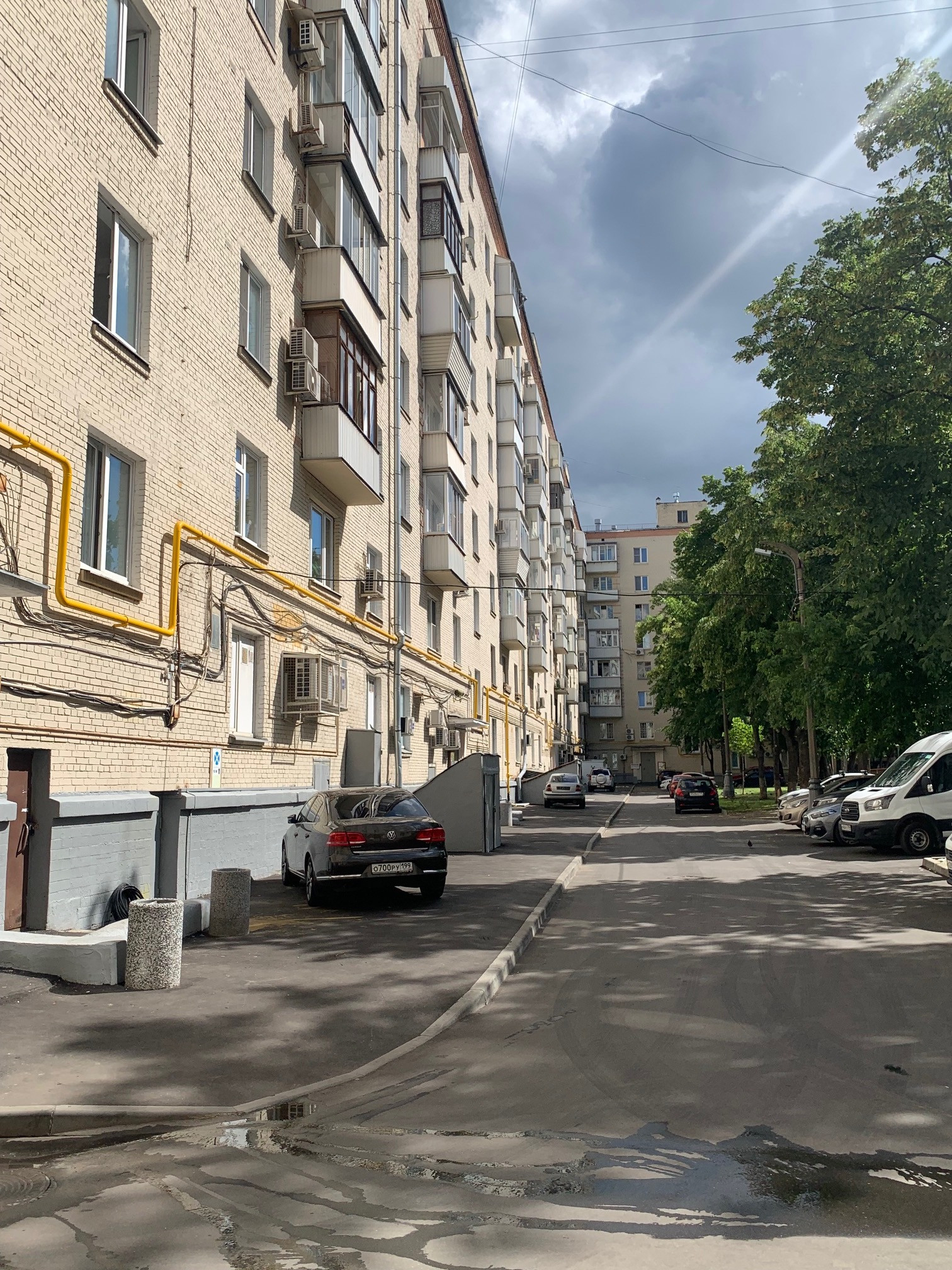 Во дворе дома несколько площадок для парковок личного транспорта.