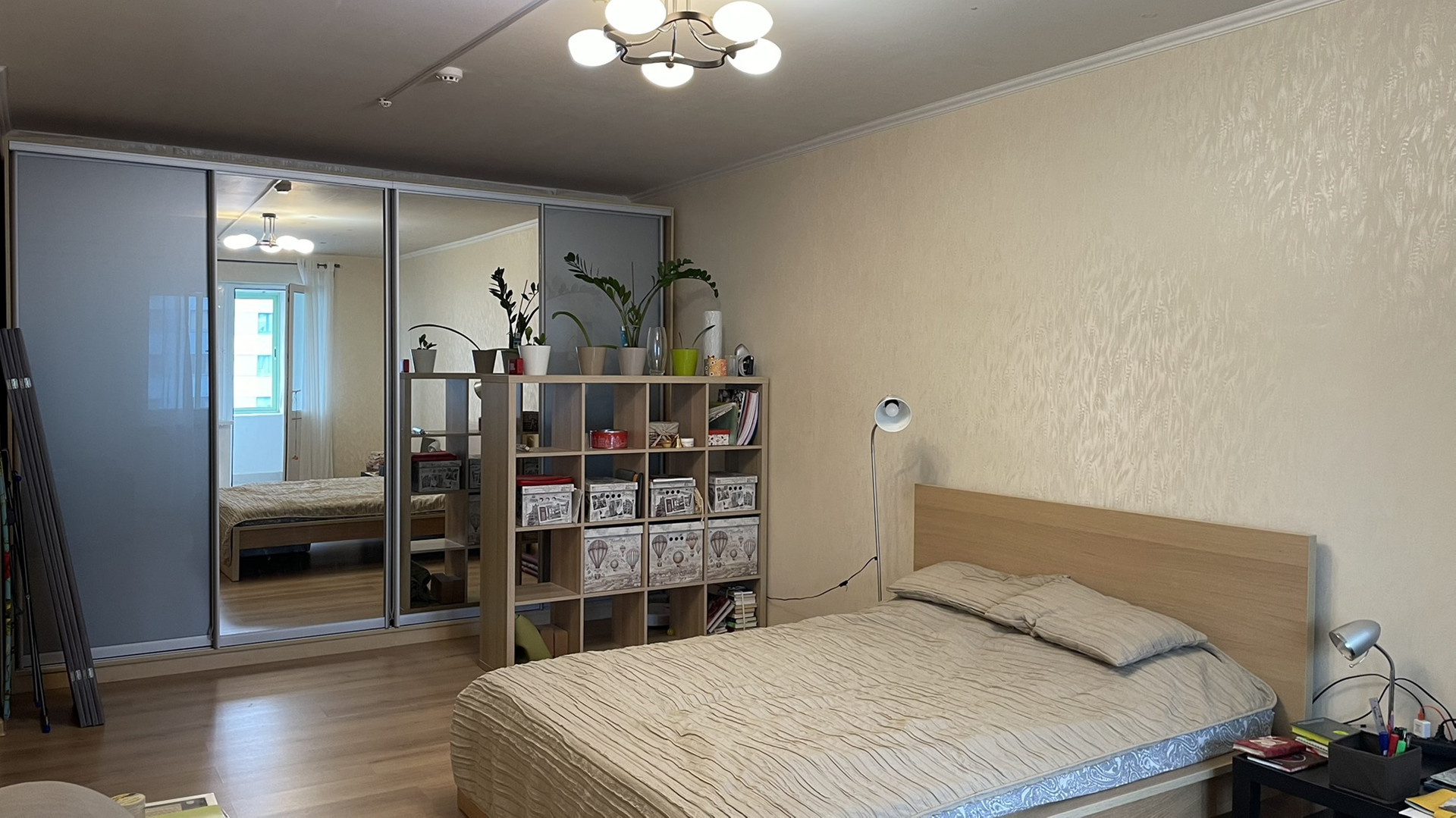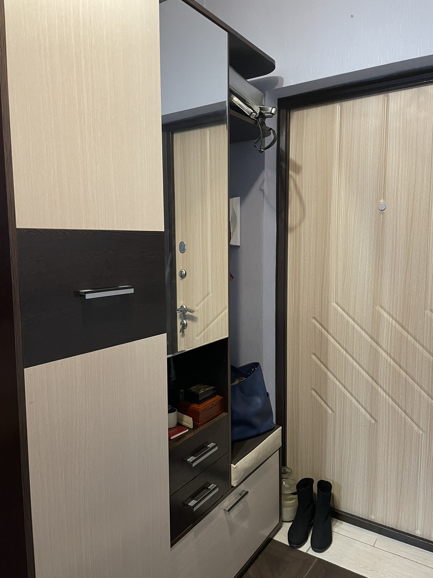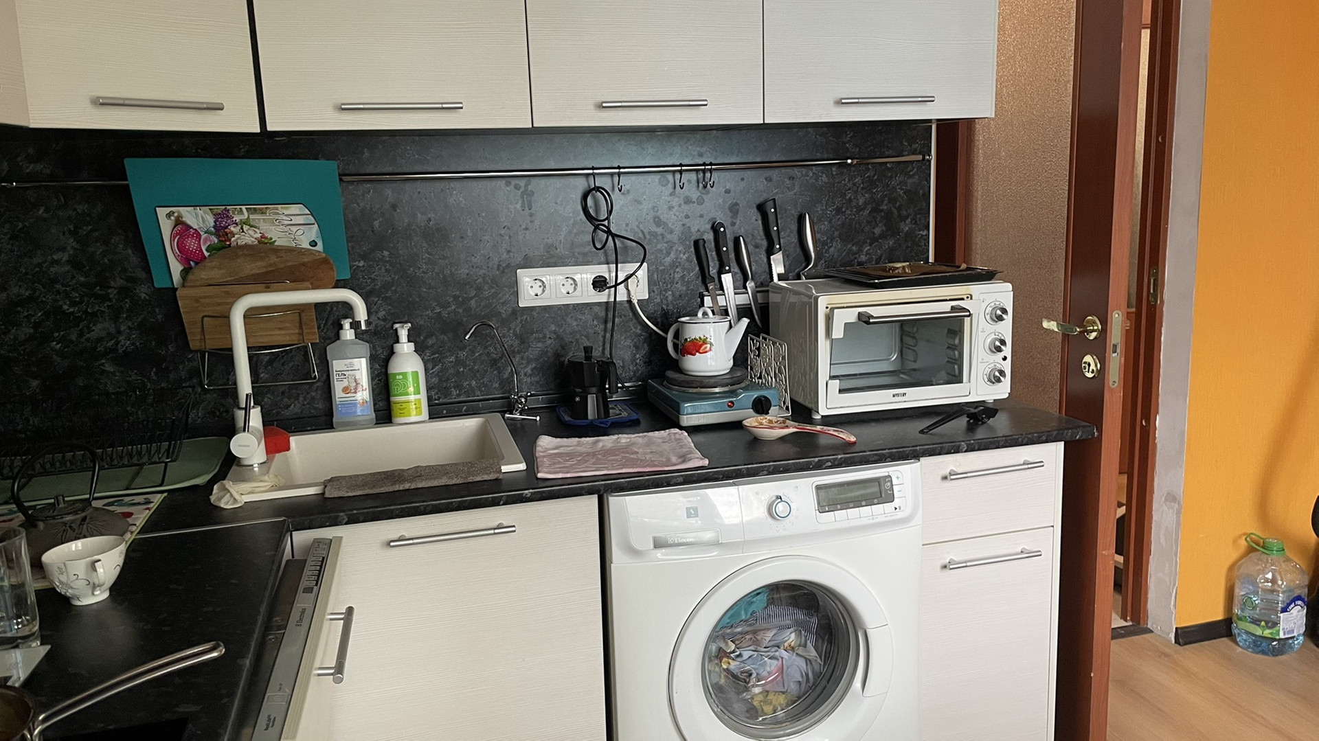 Мебель и техника, которые остаются: кухонный гарнитур, стиральная и посудомоечная машины, вместительный шкаф в коридоре, шкаф-купе в комнате, журнальный столик в комнате.