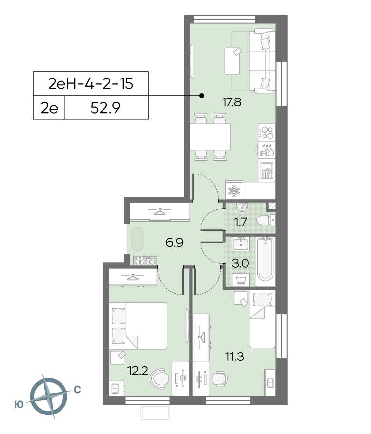 Общая площадь 52.9 м2