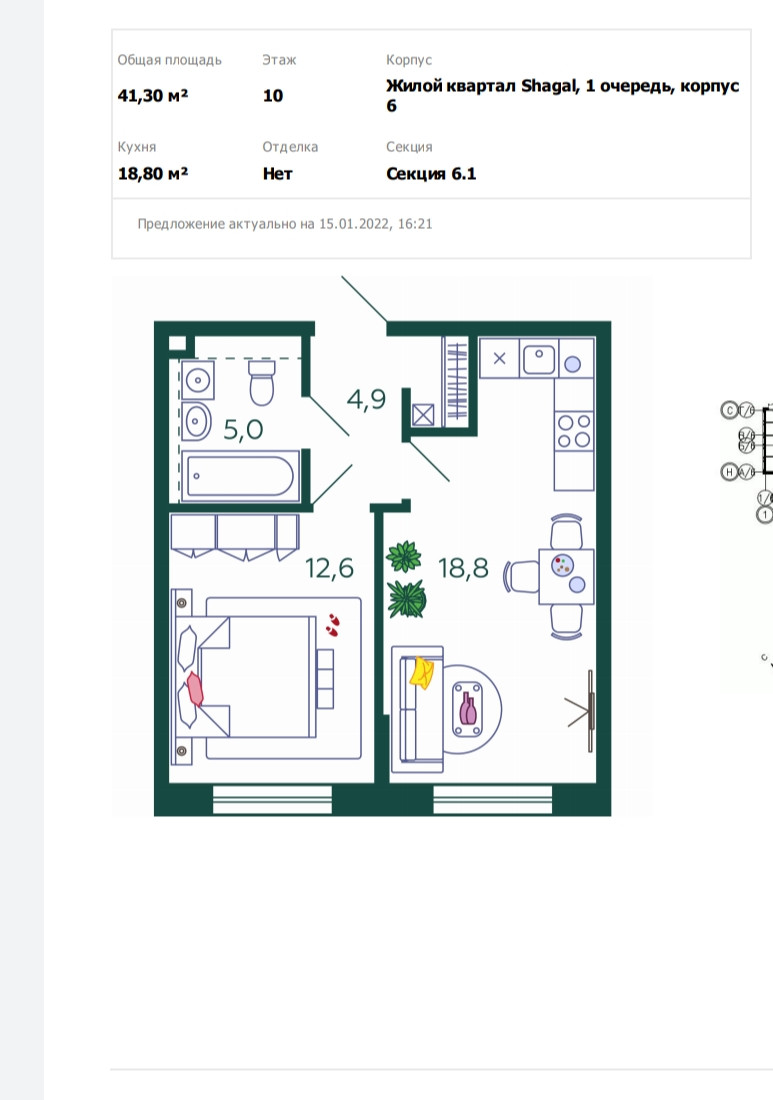 Общая площадь 41.3 м2