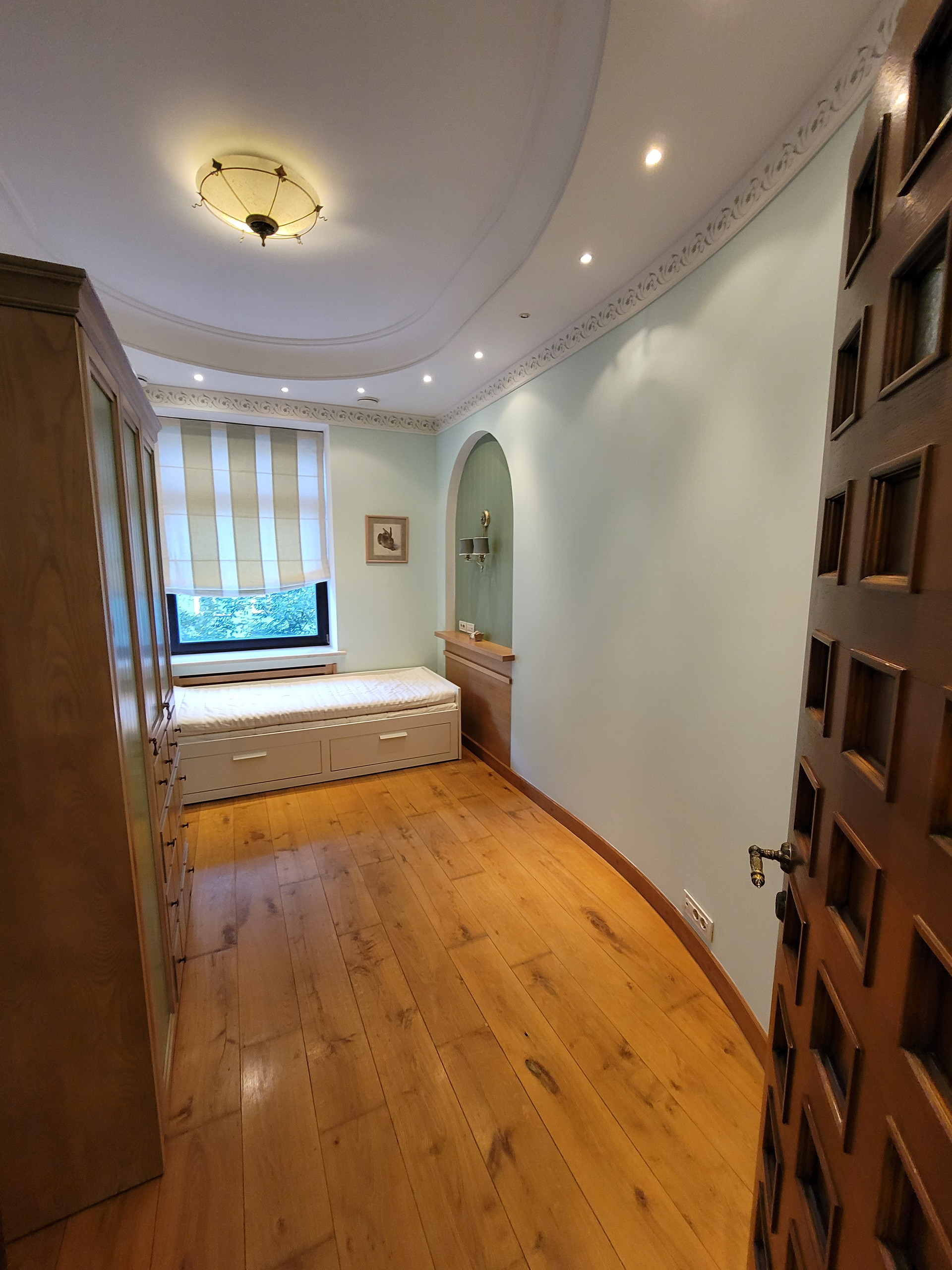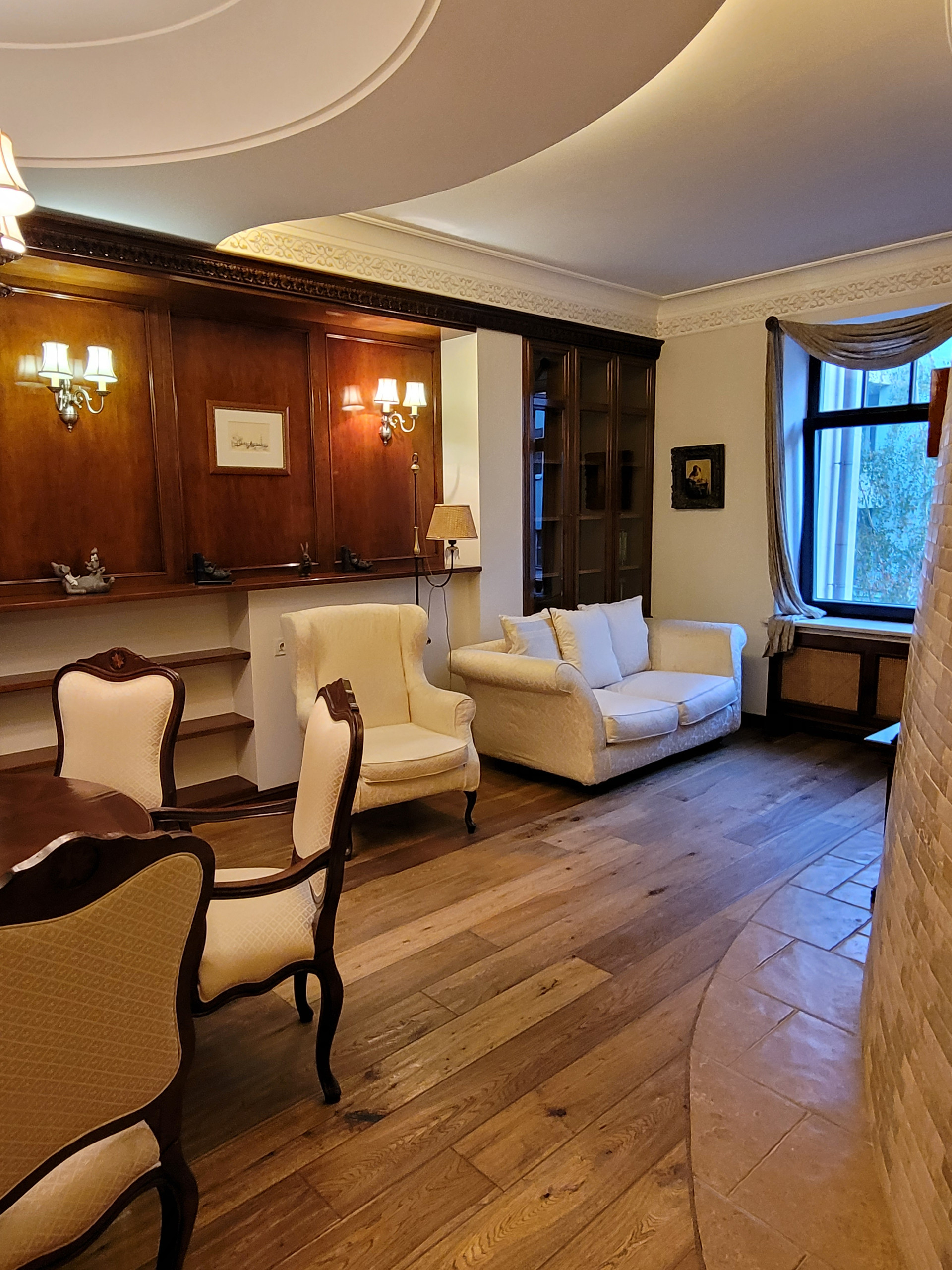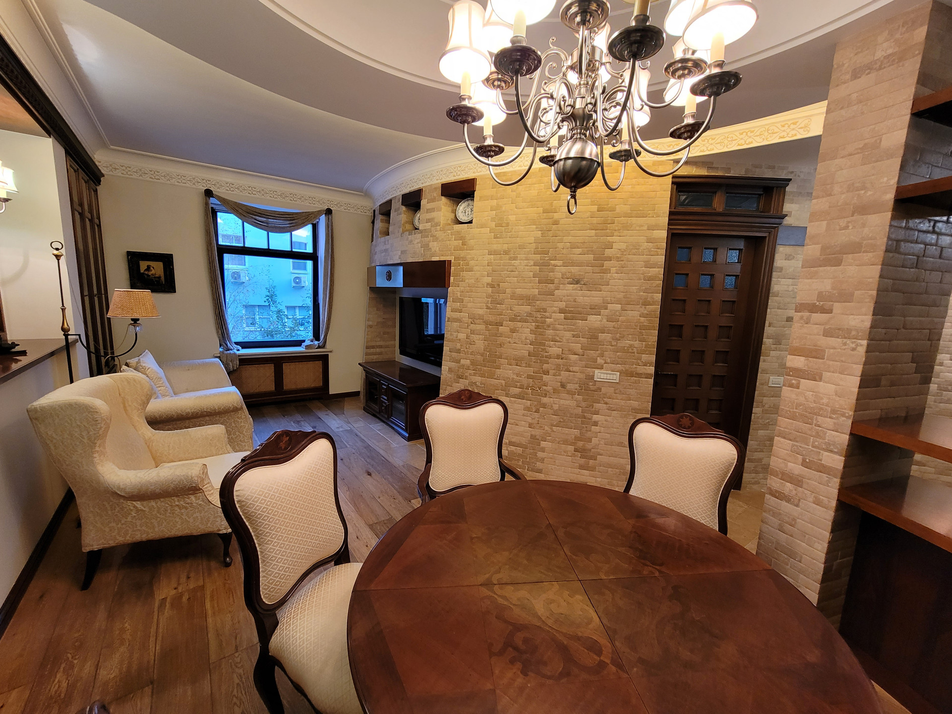 Это не просто квартира, это произведение искусств. Атмосфера творчества и воссозданного уюта европейских аристократов создают удивительное сочетание средневековья и современности. Тишина и переплетение стилей южноевропейского натурального камня с североевропейским натуральным деревом скрылись посреди гигантского мегаполиса, в одном шаге от скоростного метро, при этом даже во дворе сохранился покой в виде зеленой тени, создаваемой небольшим садом. Снаружи современный мир, а внутри - художественное произведение и настоящий уют.
