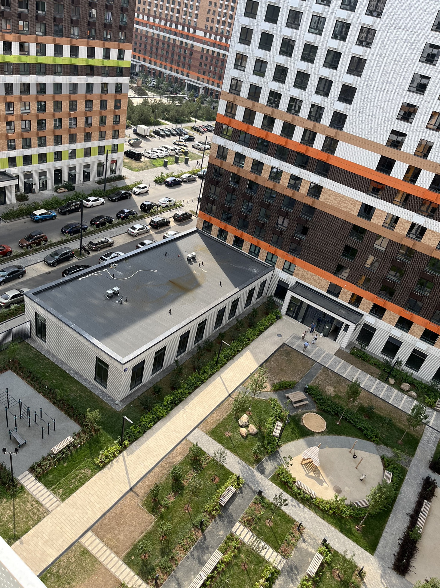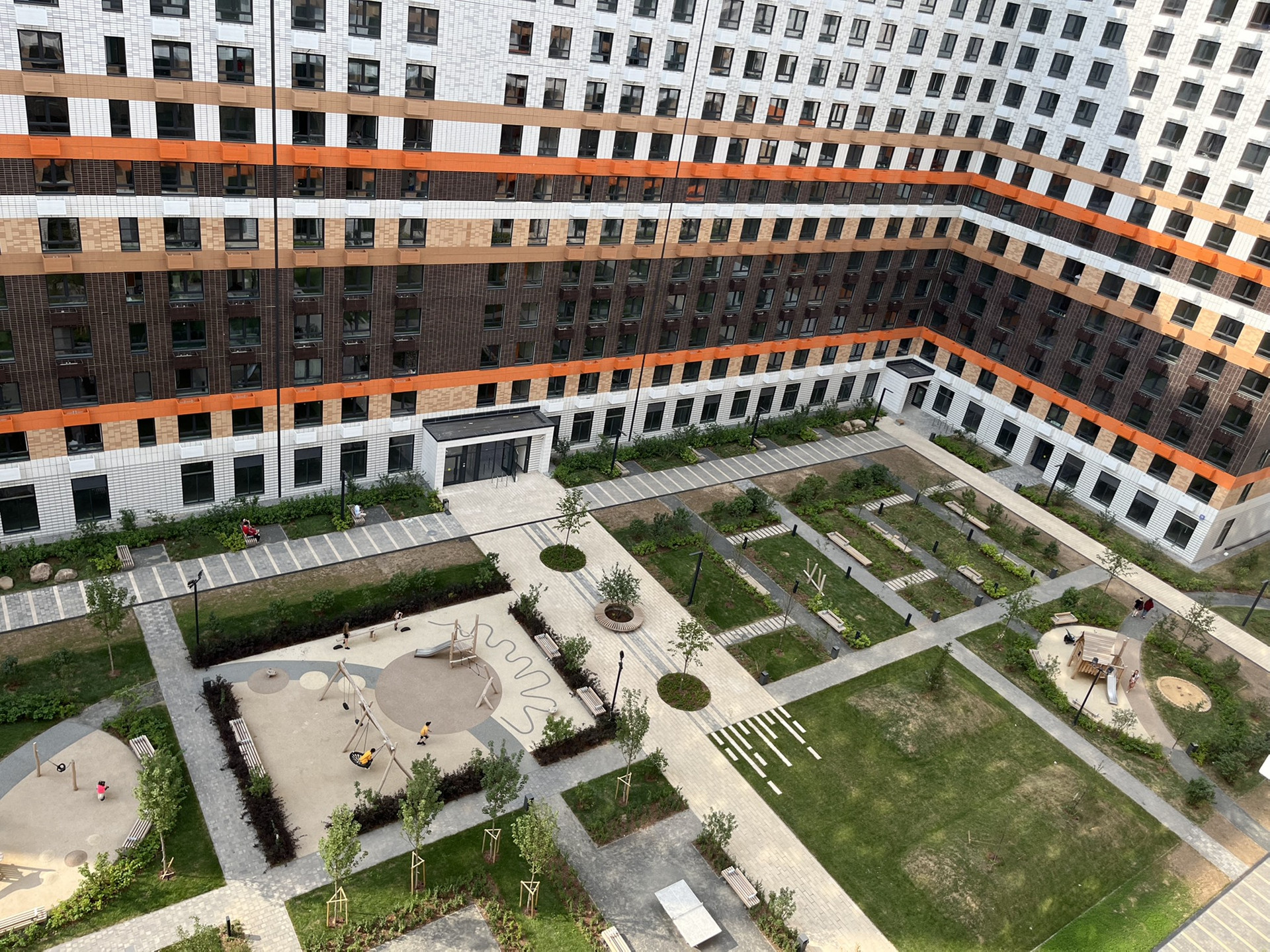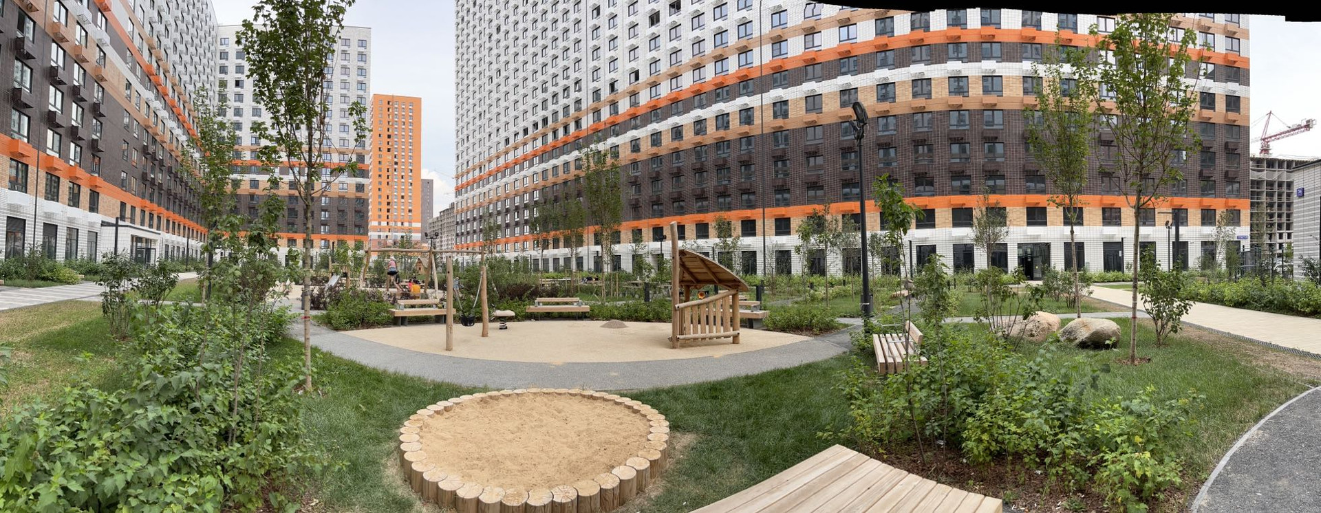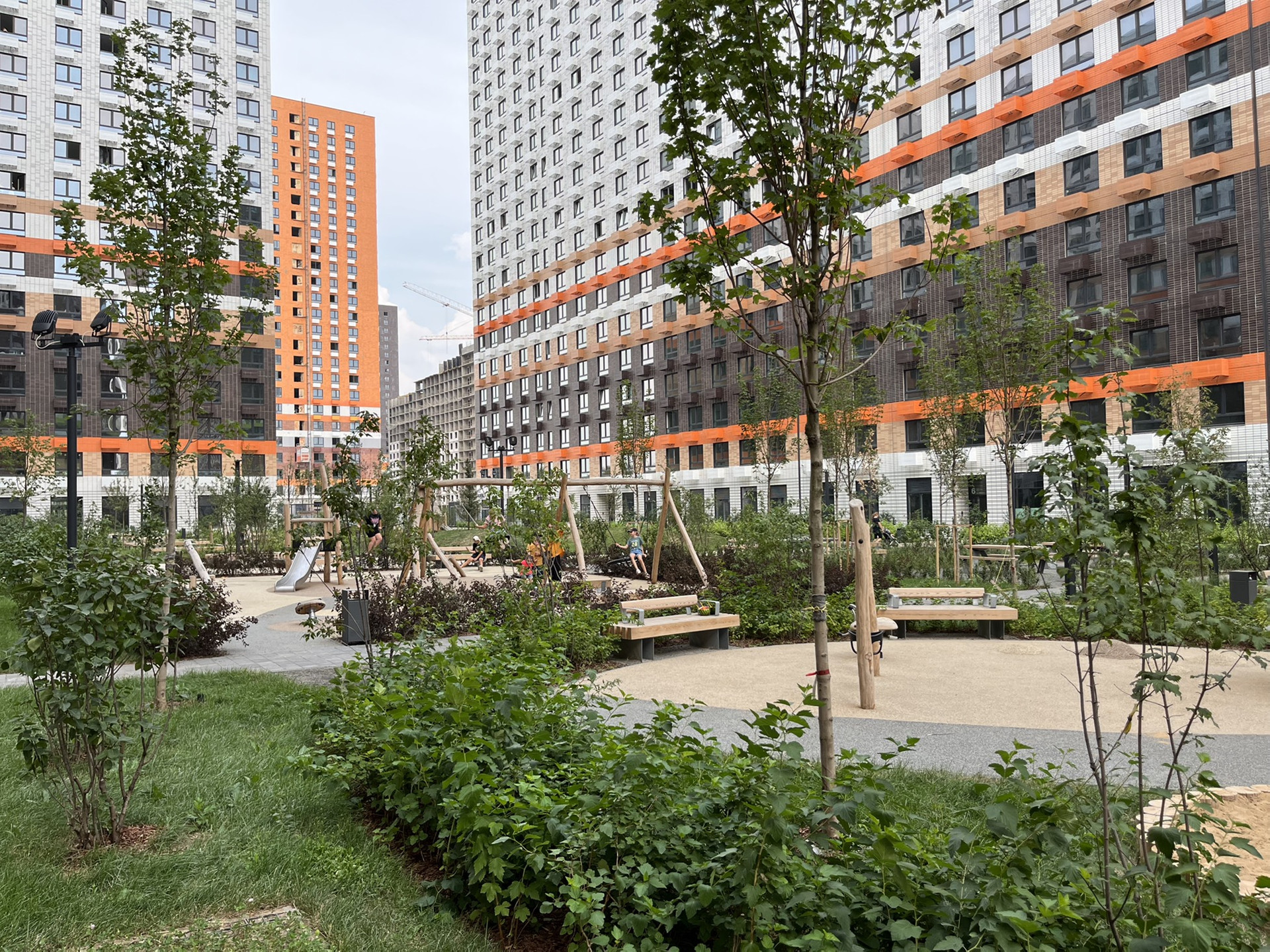 На первых этажах предусмотрены помещения для магазинов и сервисов услуг, а в подземной части  кладовые. Дворы-парки с детскими и спортивными площадками закрыты для проезда автомобилей. Специально для проекта разработан природный плейхаб "Остров". Это парк с холмами, цветущими склонами, башнями и ручьём, возле которого парят гейзеры. И такой ландшафт помогает разнообразить детские игры.