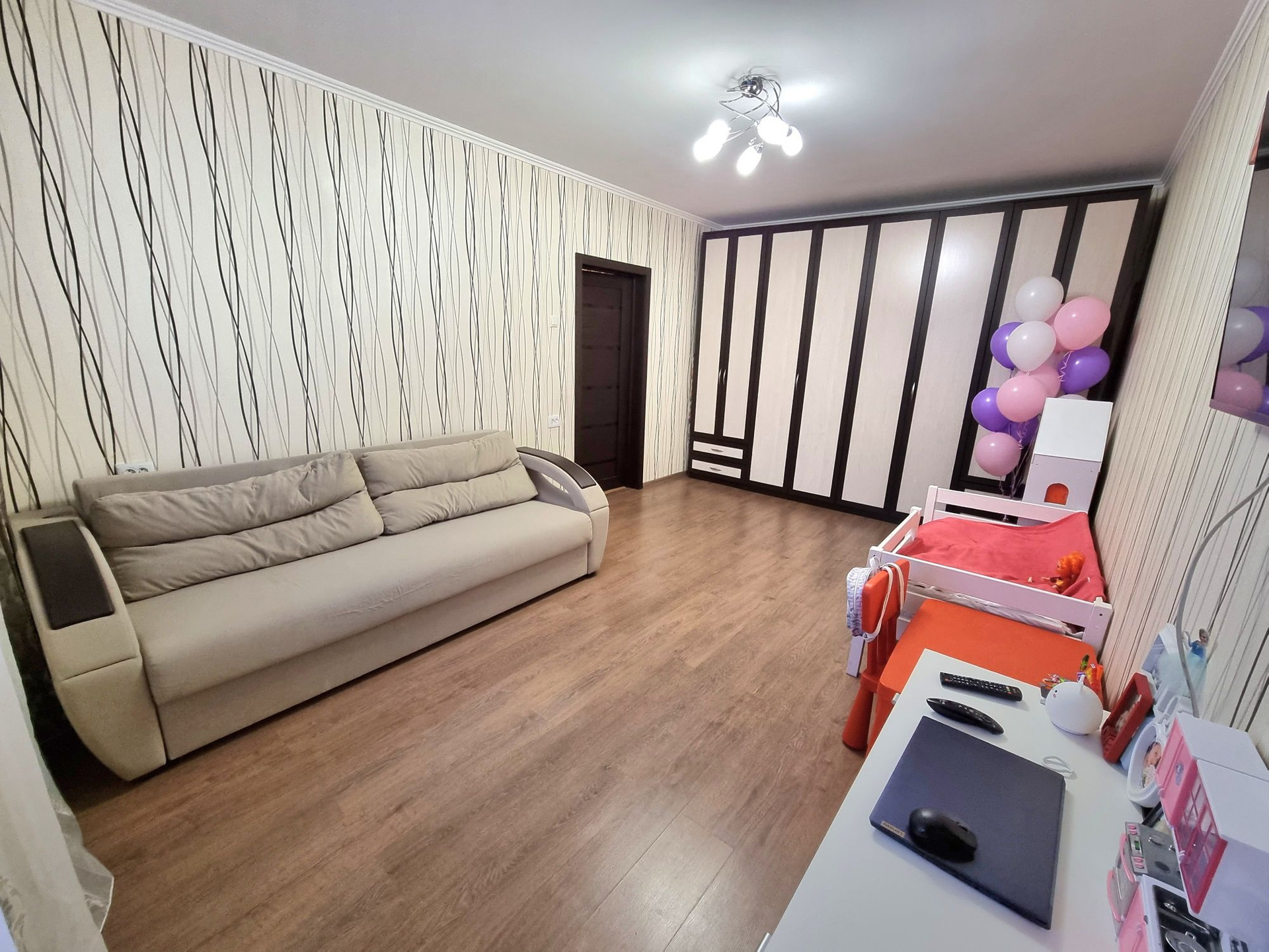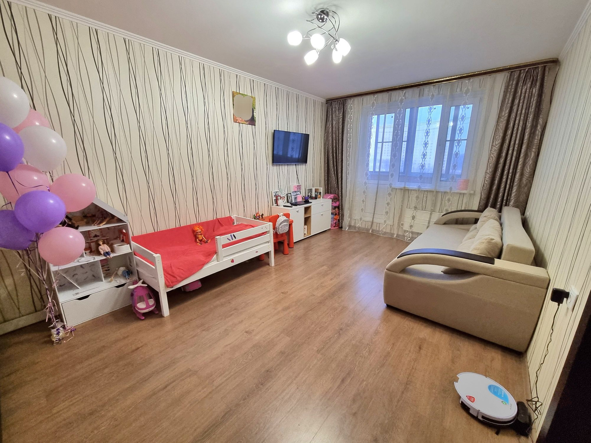 Продаётся хорошая светлая 1-комн. квартира с ремонтом общей площадью 38,7 кв.м. на комфортном 5м этаже, в квартире сделан качественный ремонт с выравниванием стен, пола и потолка, хорошая планировка: 19 м2 комната с застекленной лоджией, кухня 8кв.м., вместительная прихожая, на полу в комнате ламинат, в кухне, коридоре и с/у плитка, окна ПВХ, остается встроенный кухонный гарнитур, шкаф в комнате с раскладной кроватью. Хороший вид из окон на детский сад. Закрытый тамбур на 4 квартиры позволит хранить на этаже велосипед, самокат или коляску, что очень удобно! Тихие соседи рядом, чистый подъезд.