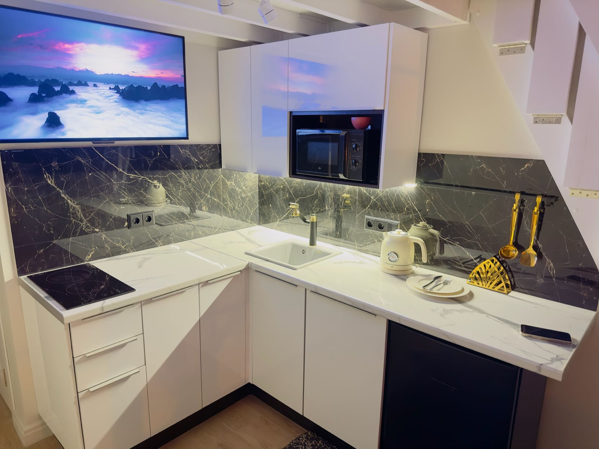 Кухня со всем необходимым: посудомойка, холодильник, стиральная машина, тв с ядексом, и прочая техника. Все НОВОЕ! Никто не жил.