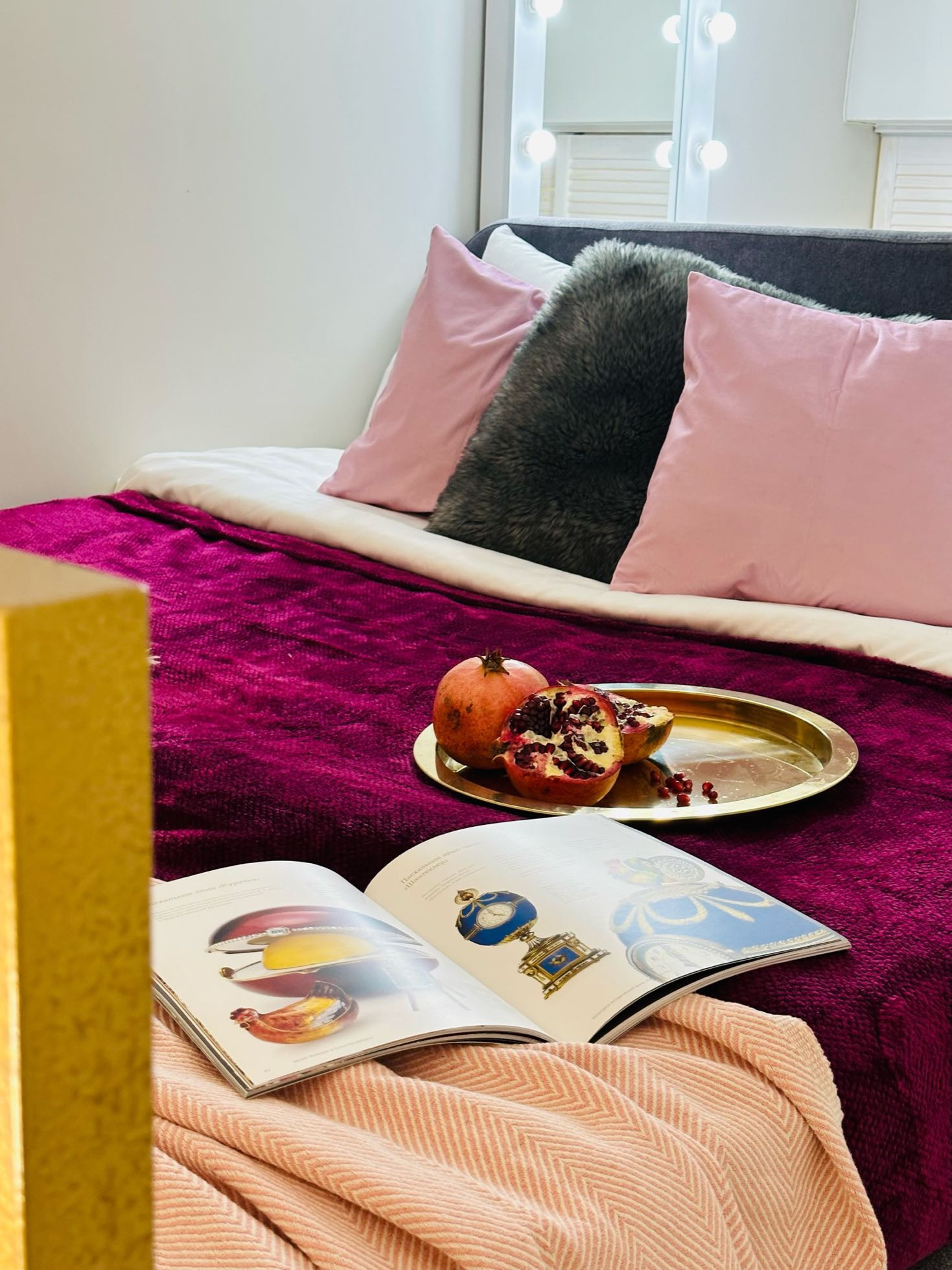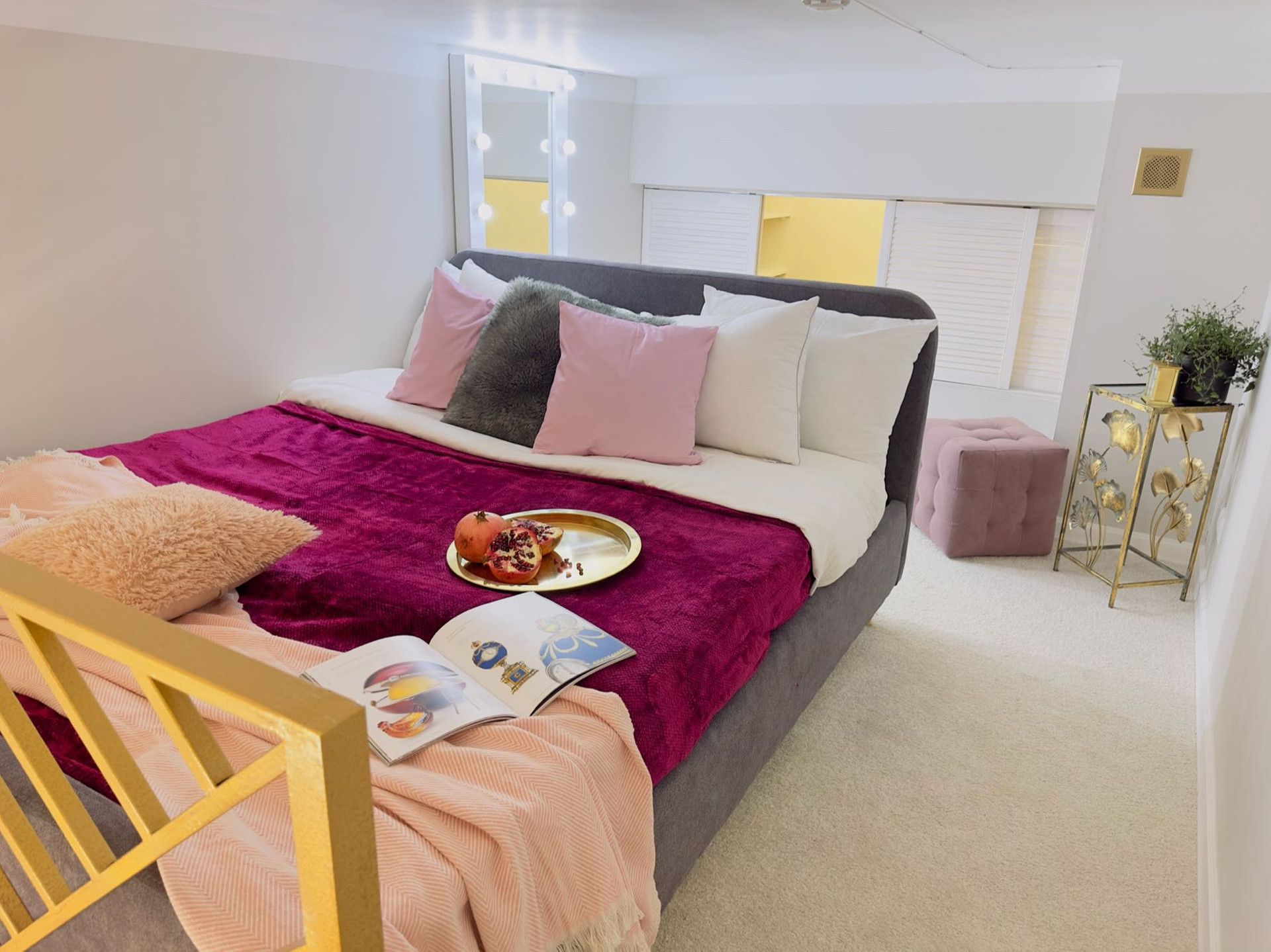 На втором этаже двухспальная кровать и гардеробная. Гримерное зеркало.