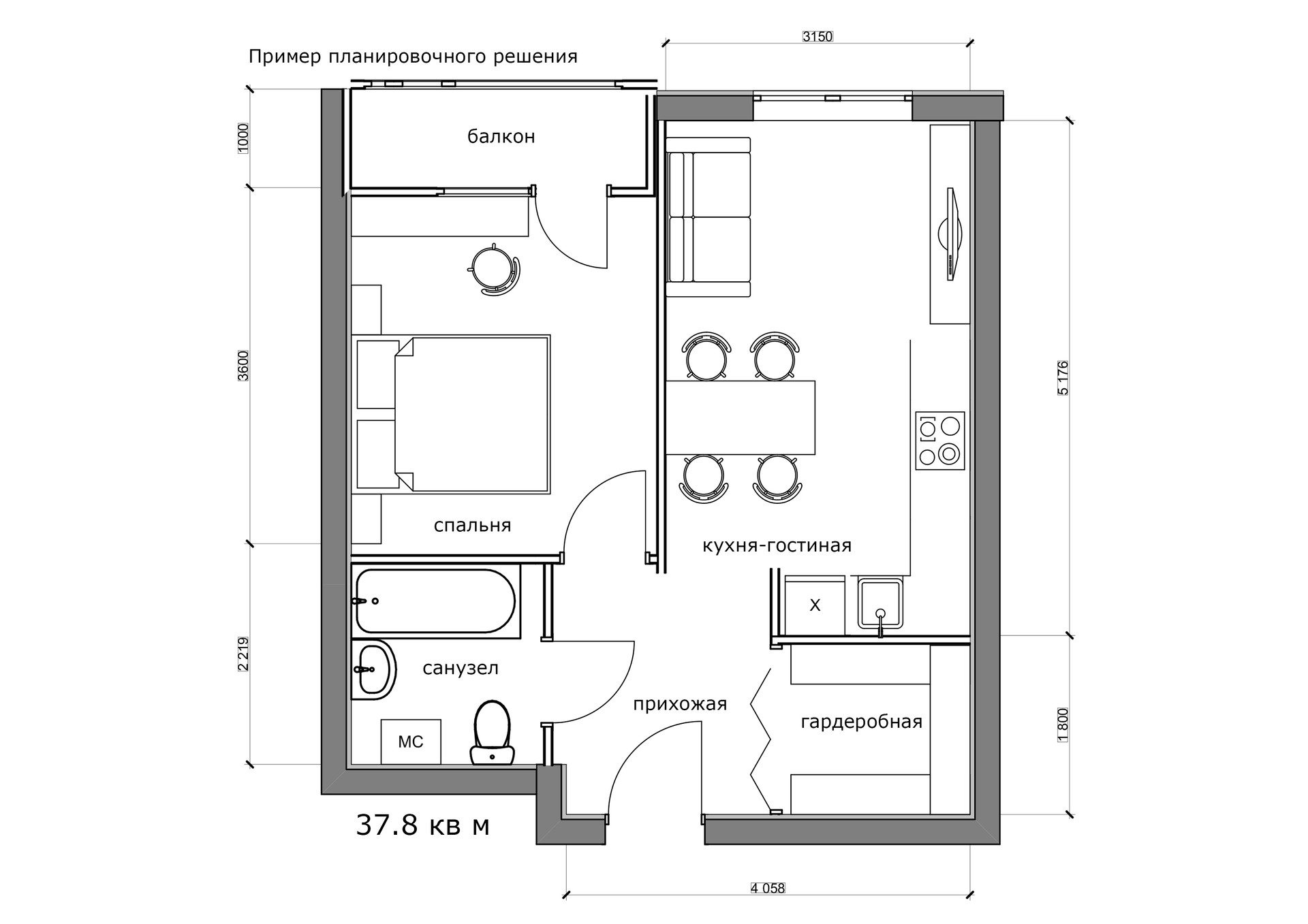 Общая площадь 38 м2