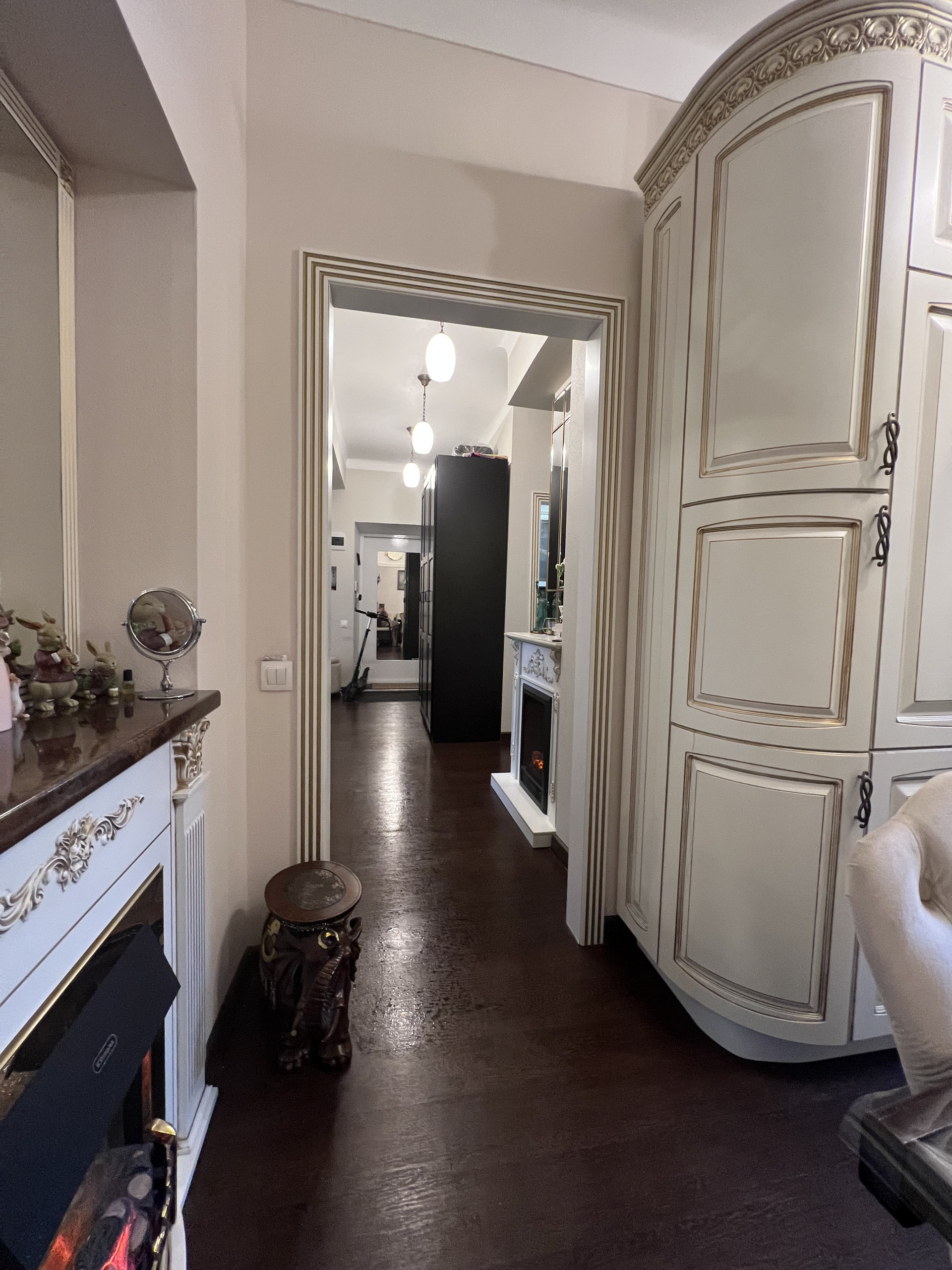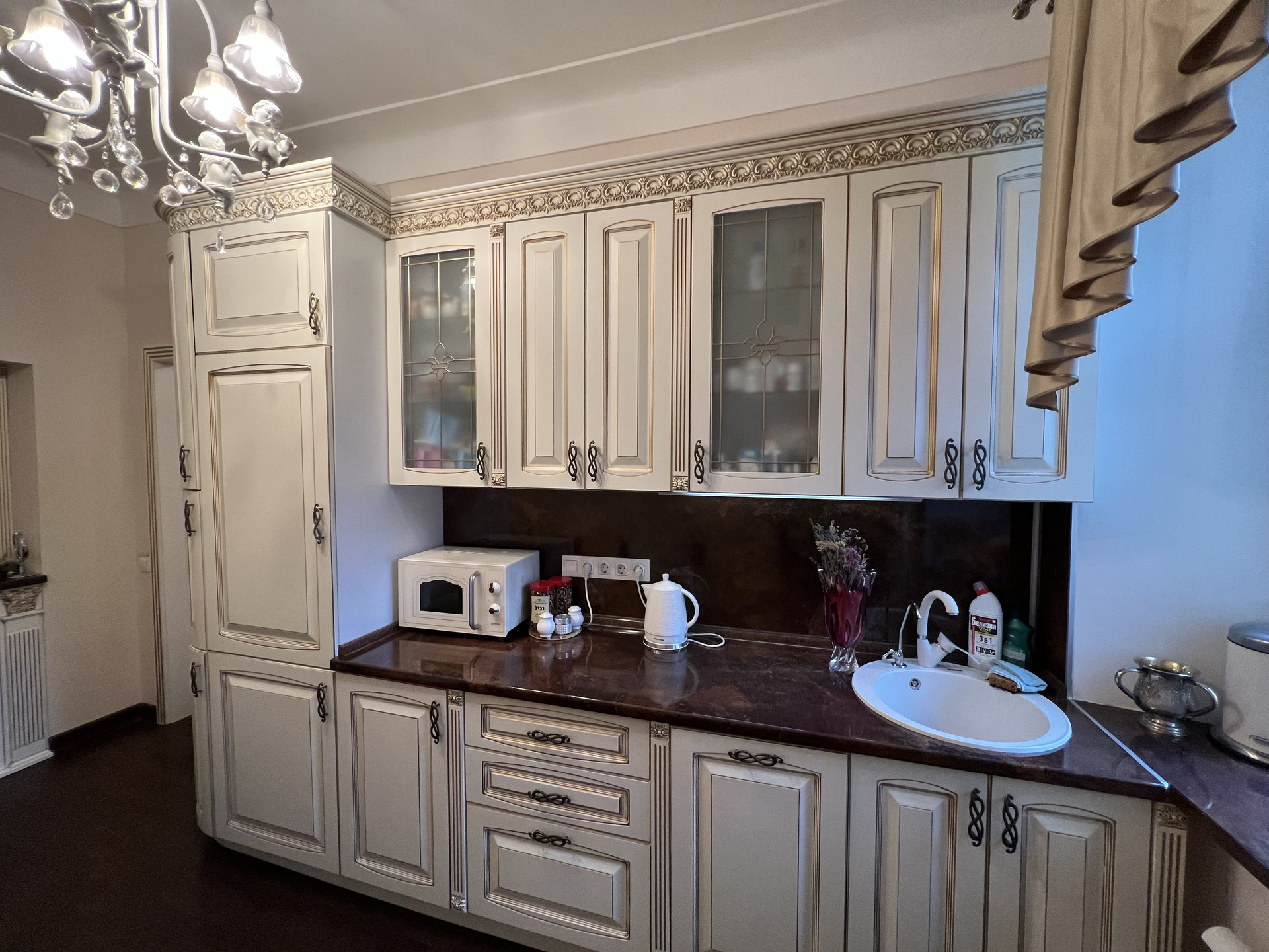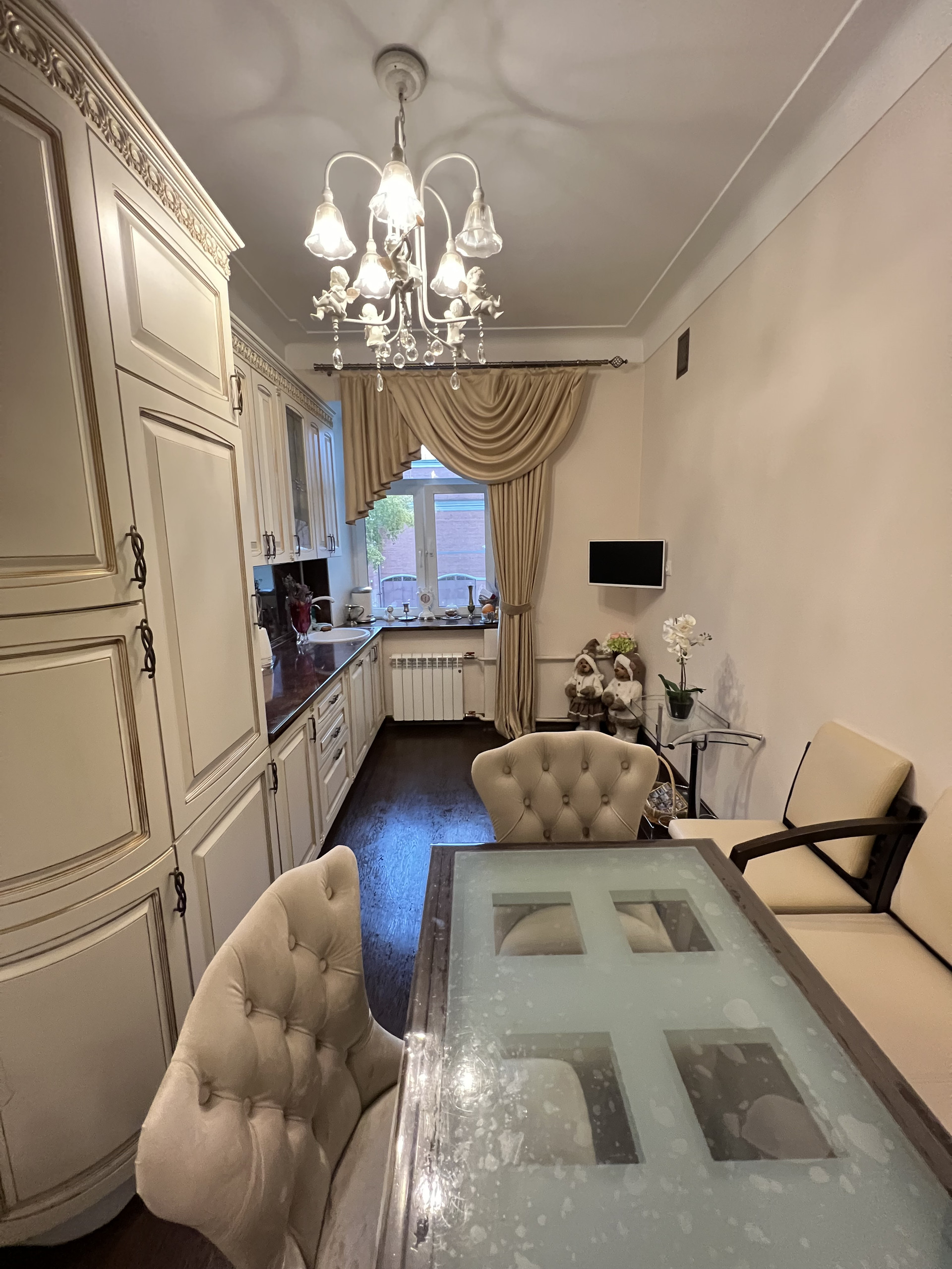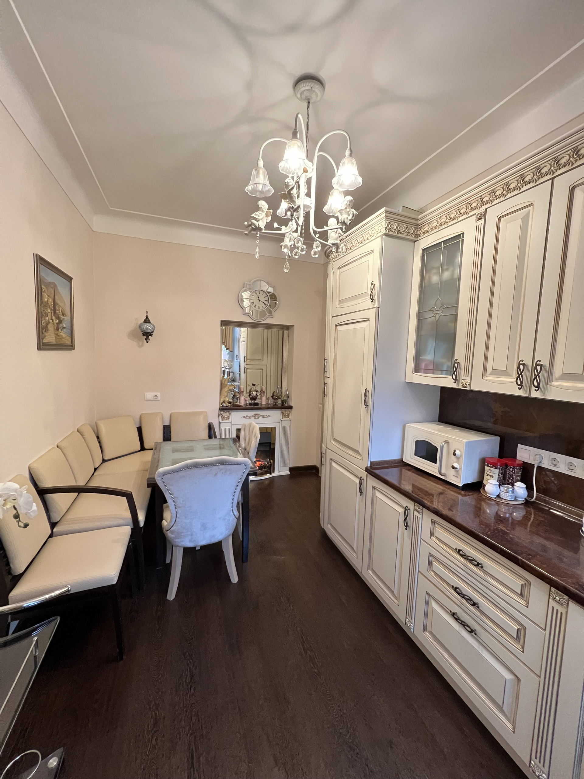 Квартира продается со встроенной мебелью и техникой Bosh (посудомойка, 2 холодильника, стиральная машинка, духовка, варочная панель, вытяжка), водонагреватель, кондиционеры. В квартире 2 камина, дизайнерский ремонт, классический стиль.