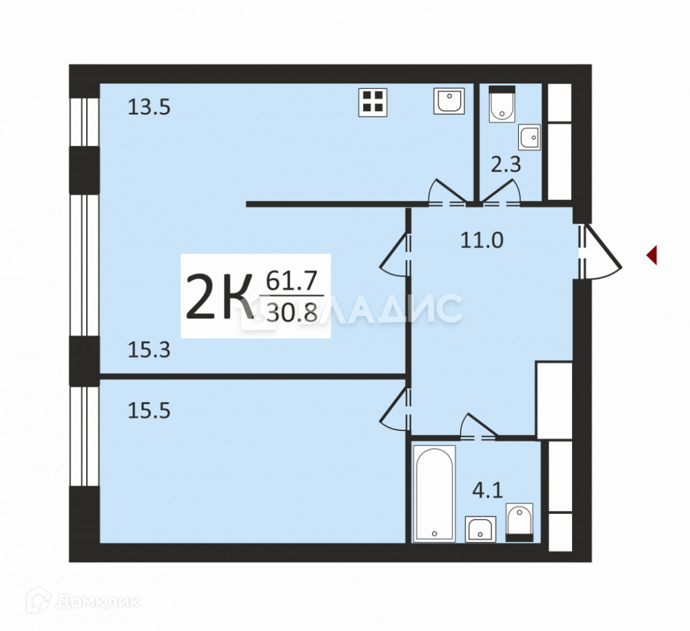 Санузел: 1 совмещенный и 1 раздельный.