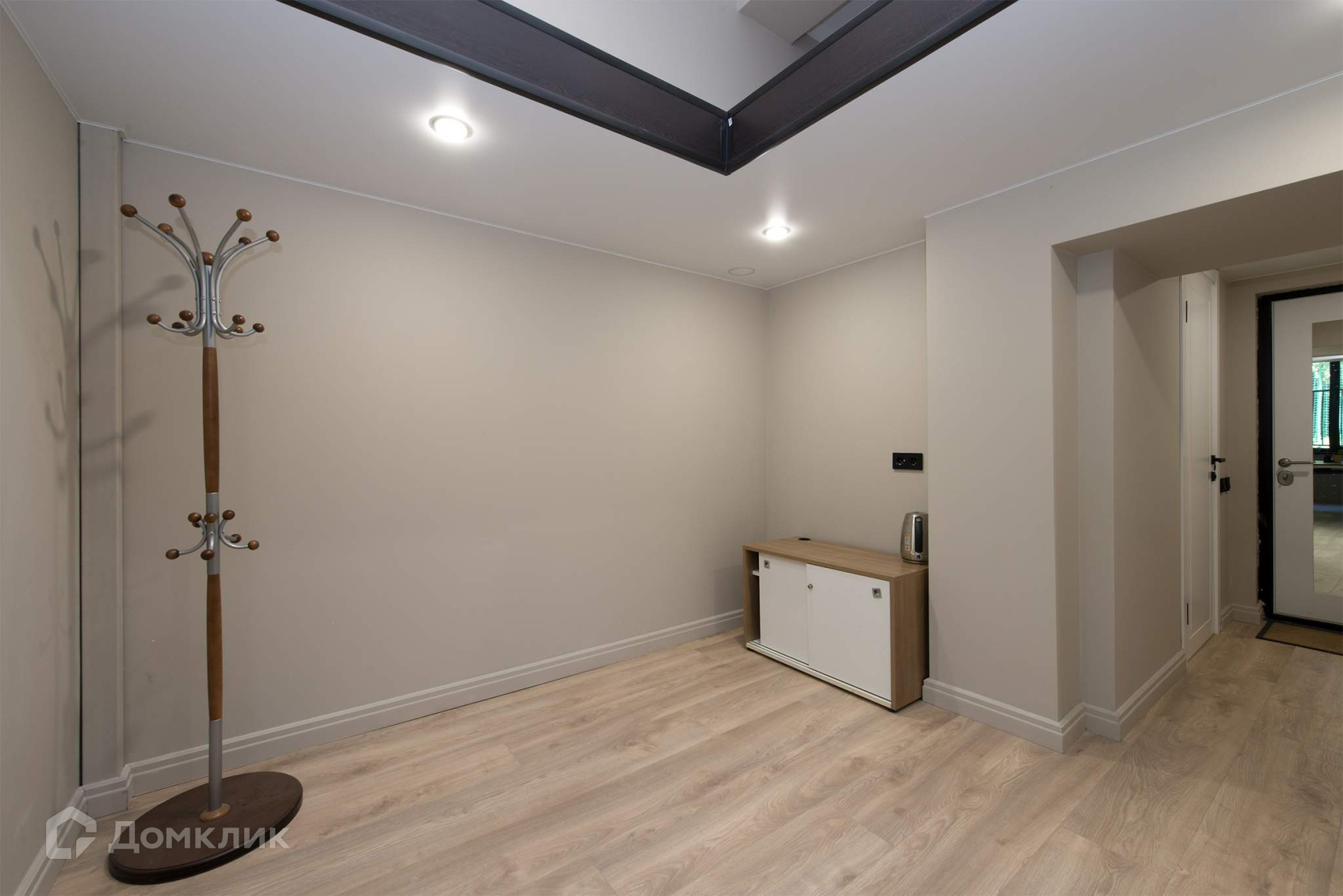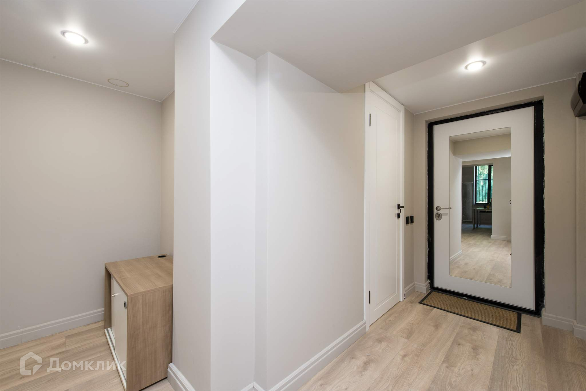 Евроотделка - пол ламинат, стены окрашены, навесной потолок со встроенными светильниками. Выделенная кухонная зона с проведены коммуникации для кухонного гарнитура
