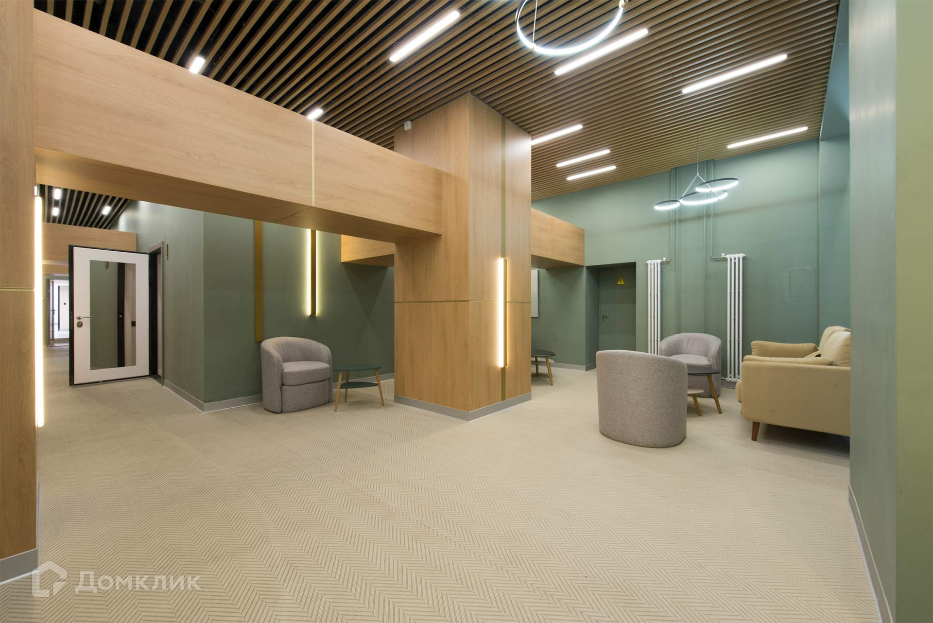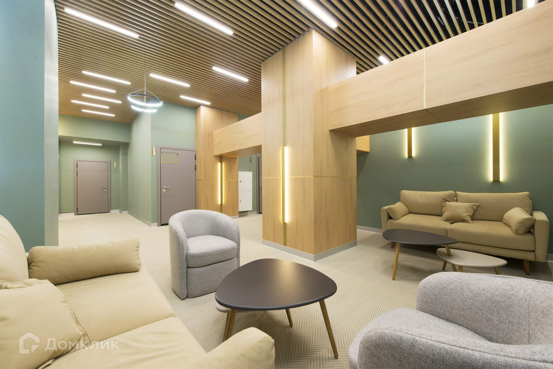 Дизайнерское лобби с современной отделкой, где расположена уютная зона отдыха для резидентов комплекса и гостей.