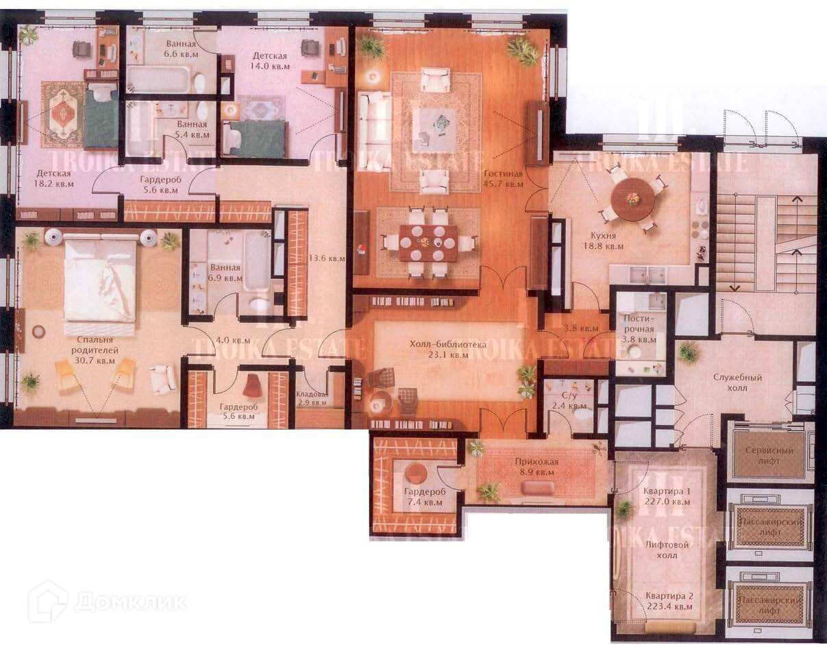 с ванными комнатами, кухню-столовую, просторный холл-библиотеку, постирочную, гардеробную при входе, гостевой с/у. Предусмотрено 2