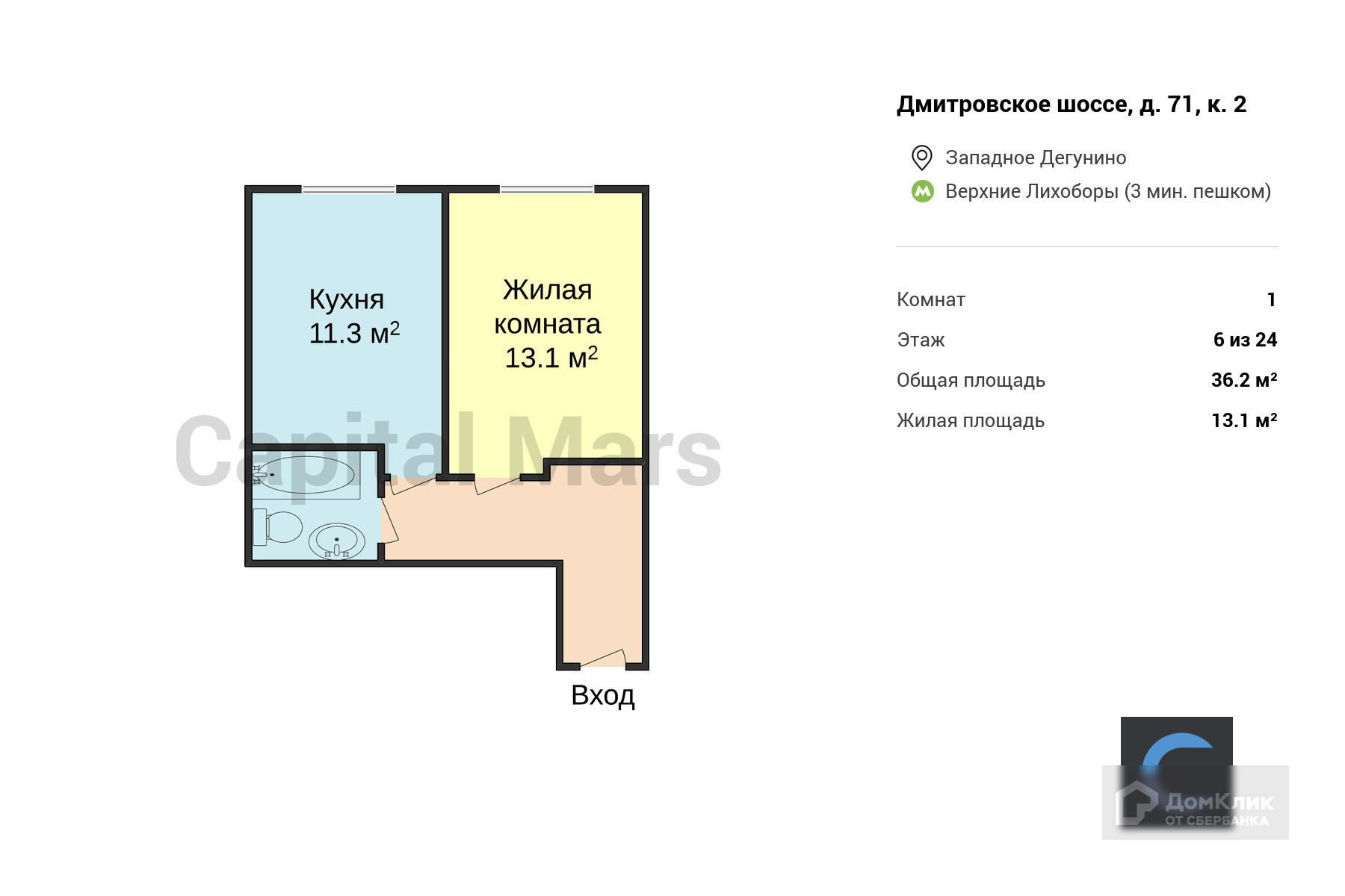 1-комнатная квартира, 36.2 м2, этаж 6 / 24, на продажу в Москве, Дмитровское шоссе, 71А
