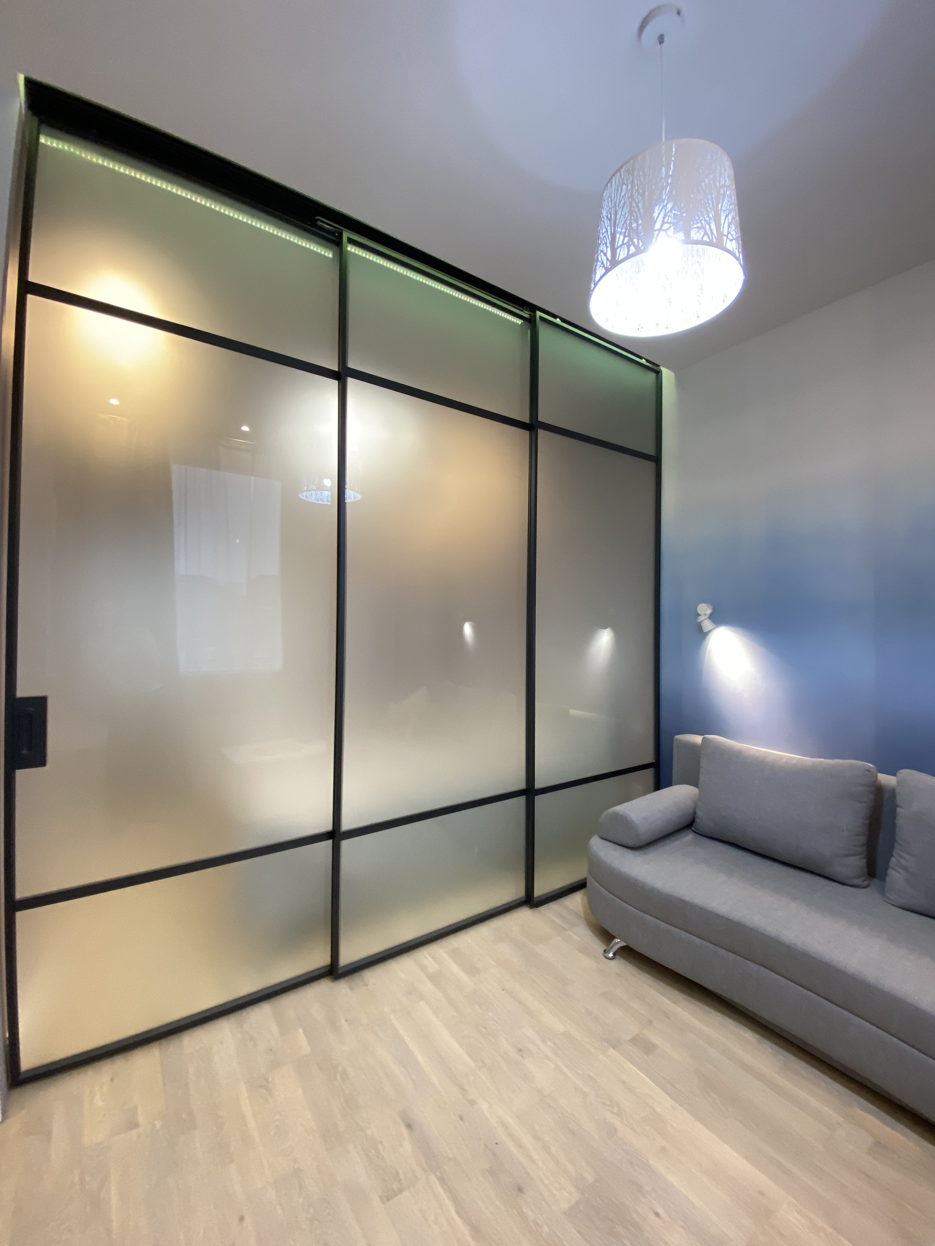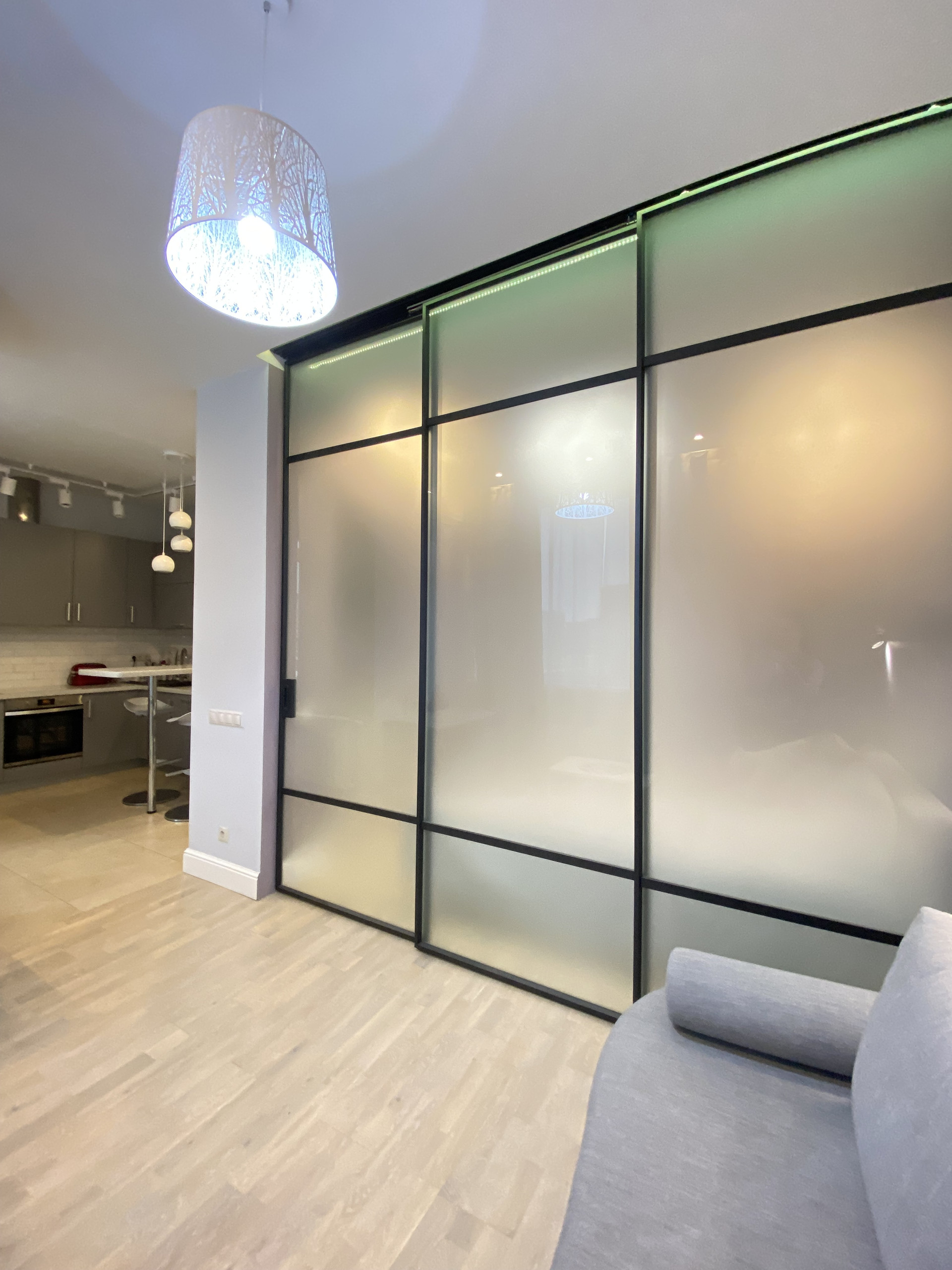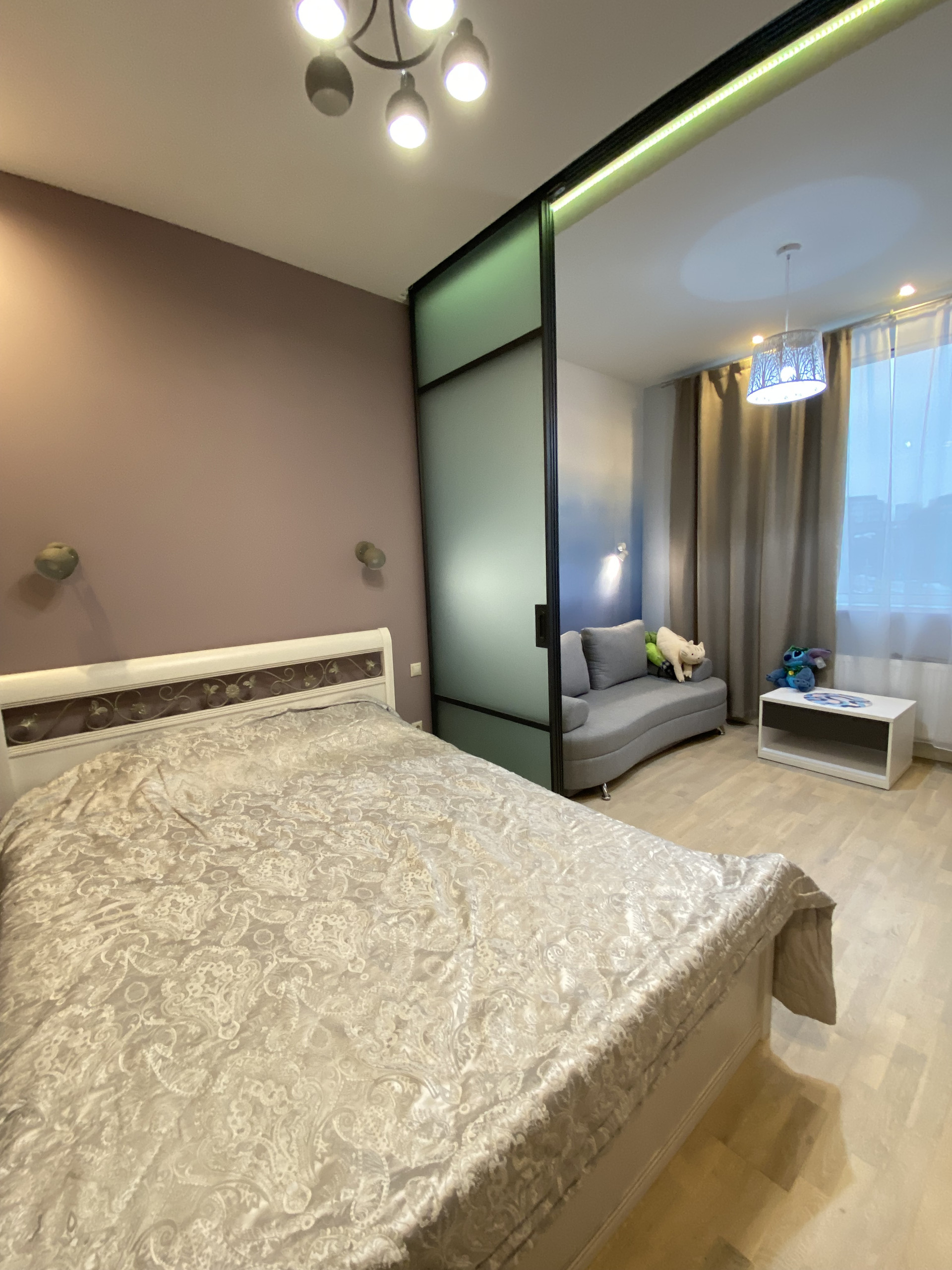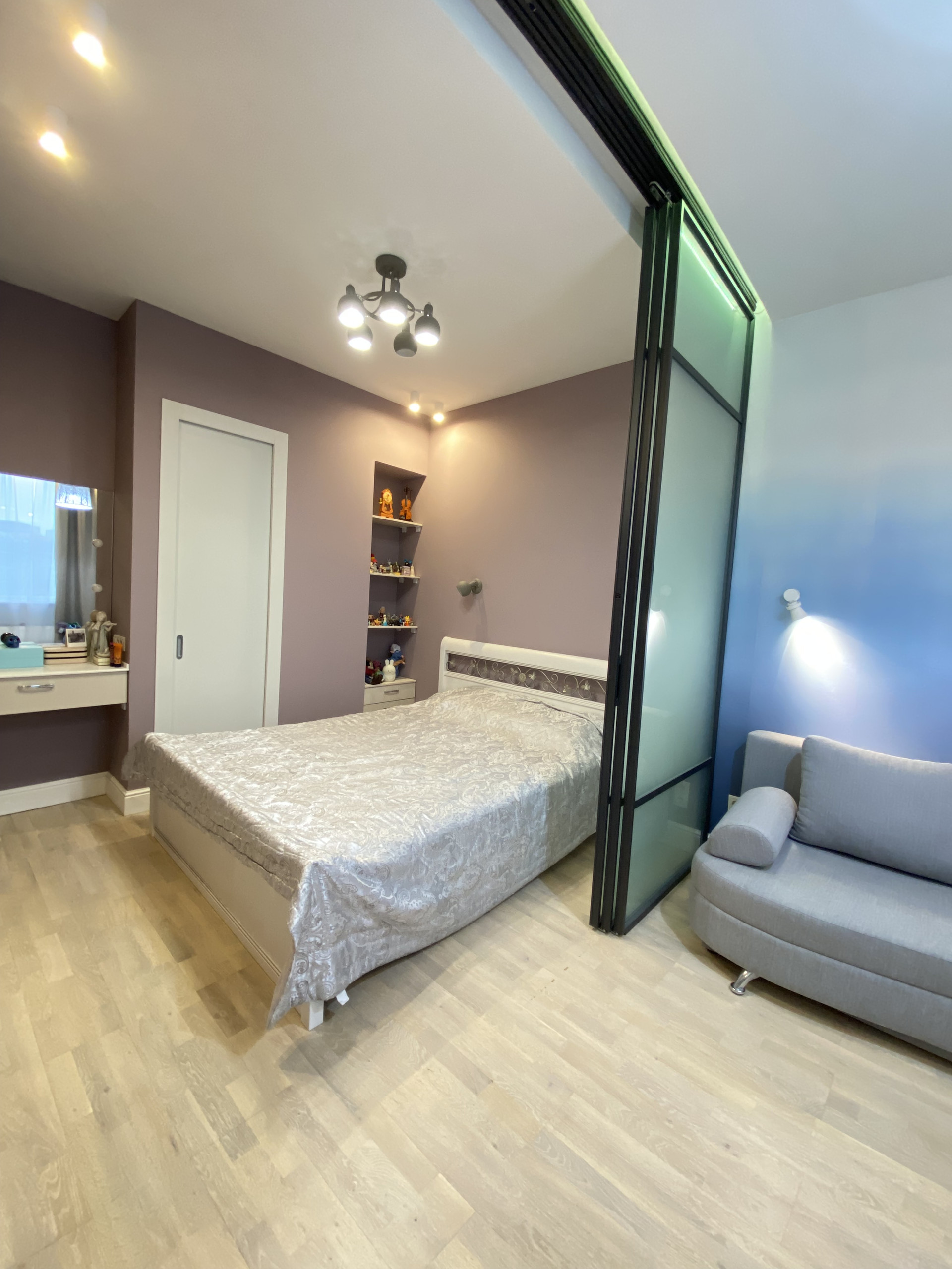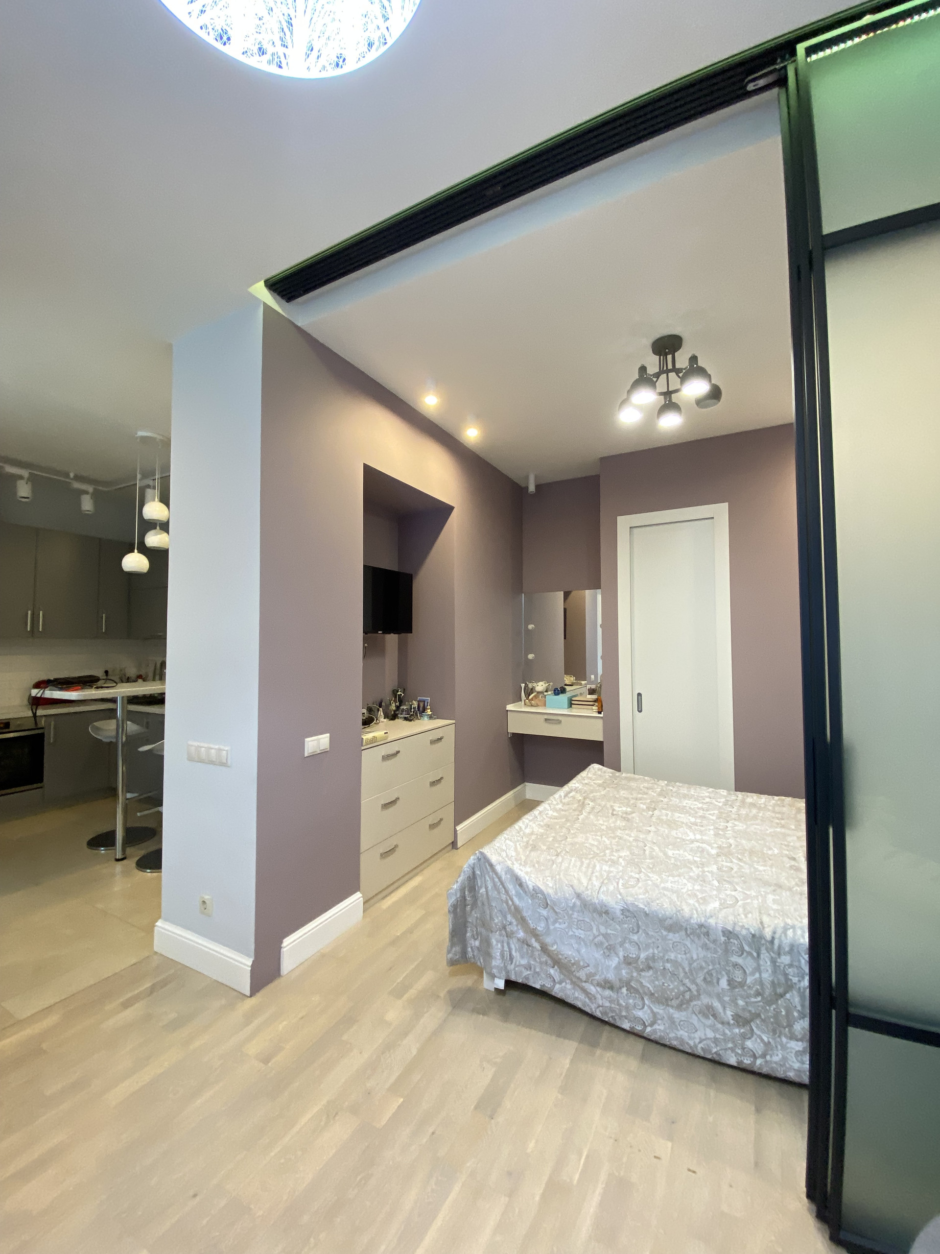 Зона спальни отделена от основного пространства раздвижной дверью-перегородкой.