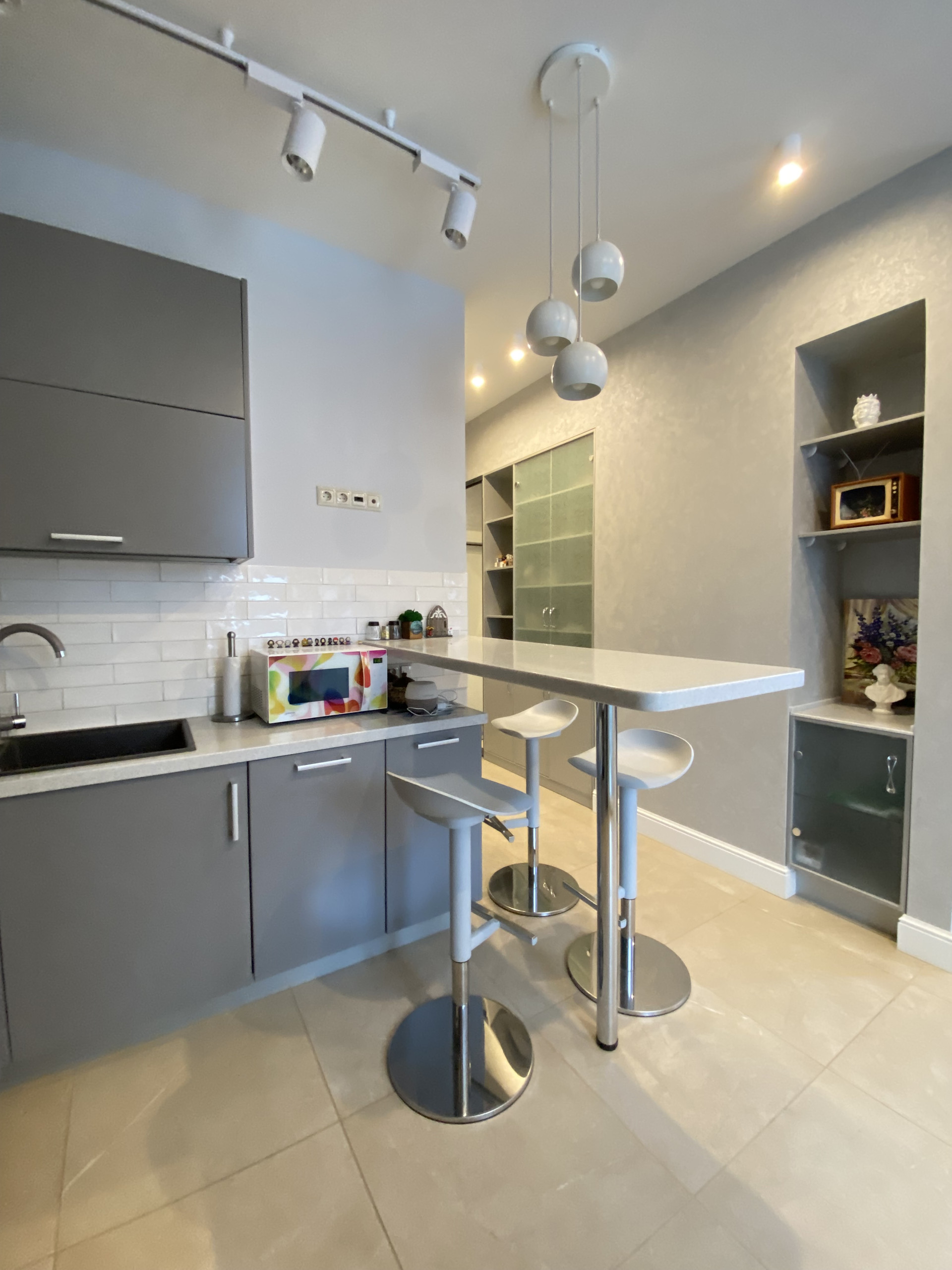 Просторная кухня-студия с выходом на застекленную лоджию.