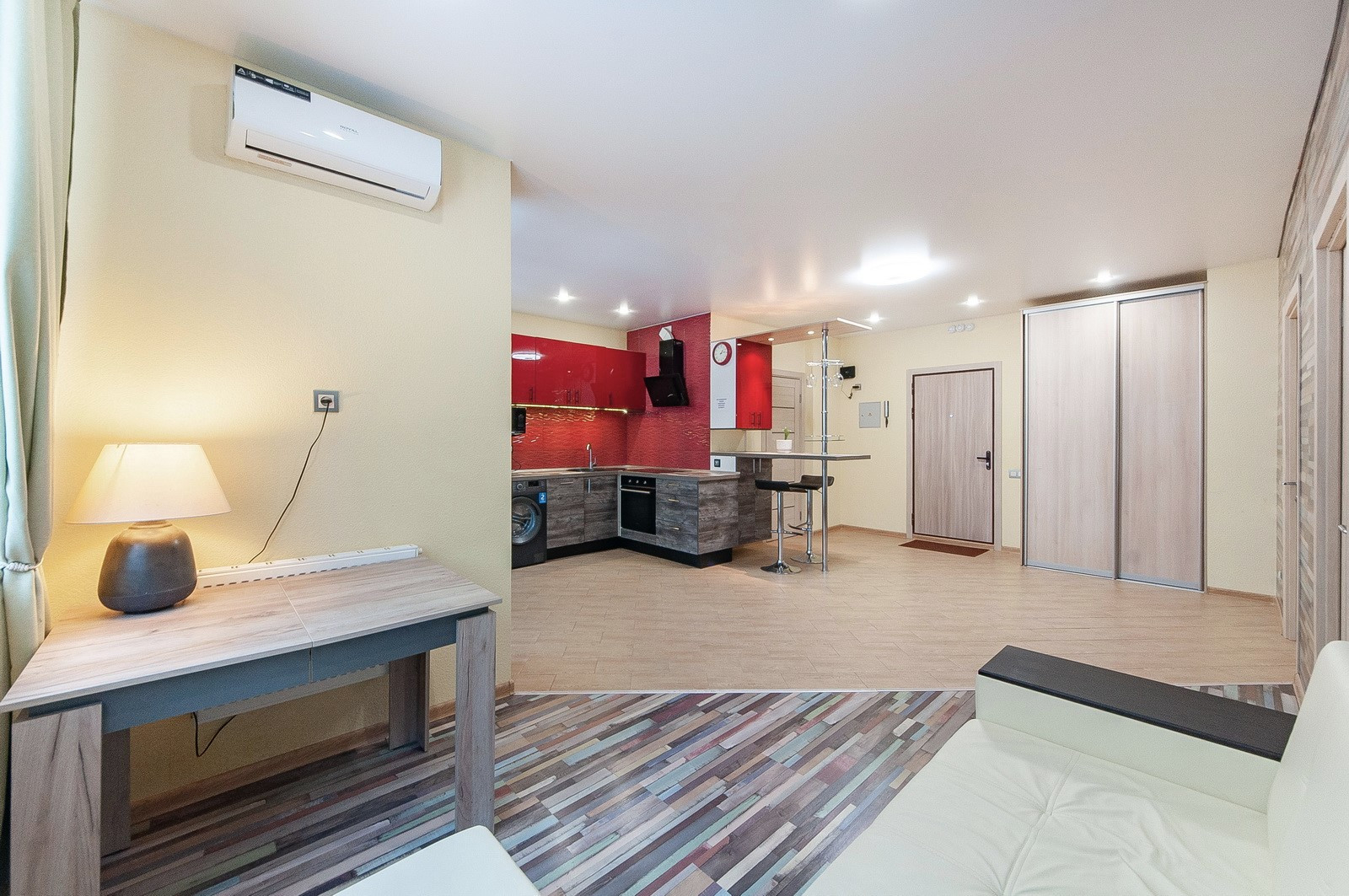 Пространство квартиры эффективно зонировано на просторную кухню-гостиную, лоджию с панорамными окнами, уютную спальню, совмещенный санузел с джакузи и небольшую гардеробную комнату (ее возможно переоборудовать в гостевой санузел). Площадь квартиры без лоджии 50.1 м2, площадь лоджии 3.09 м2.