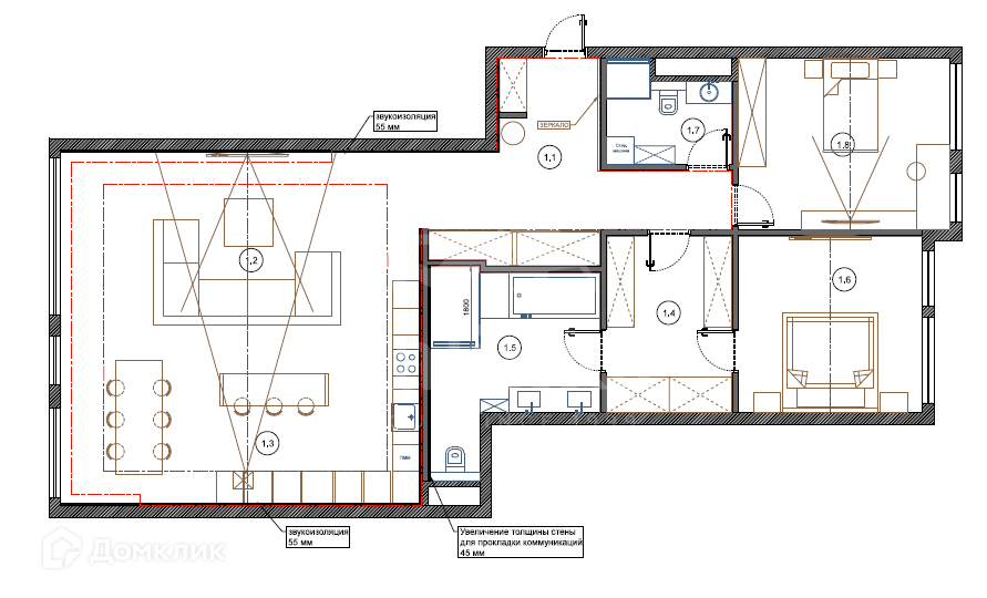 Планировочное решение: просторная зона кухни-гостиной, 2 изолированные спальни со своими гардеробными, 2 санузла.