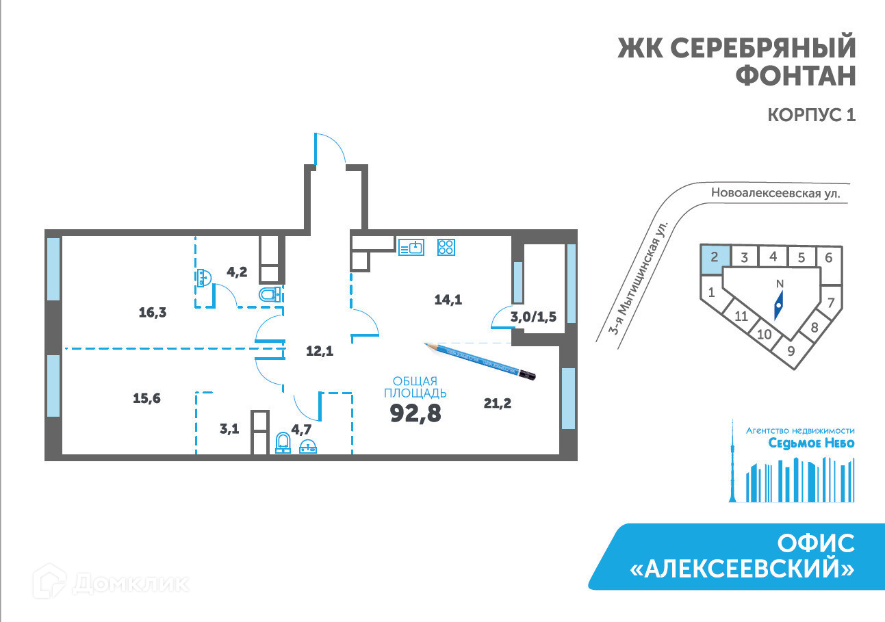 3-комнатная квартира, 92.8 м2, этаж 8 / 19, на продажу в Москве, 3-я Мытищинская улица, 16с52