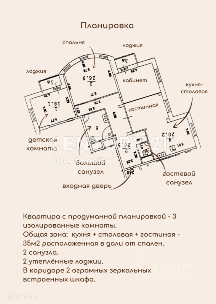 Функциональной планировкой предусмотрены: три изолированные спальни; кухня, объединенная с гостиной, два санузла (ванная и душевая кабина), две утепленные лоджии. В квартире предусмотрены множество мест для хранения/встроенные шкафы.