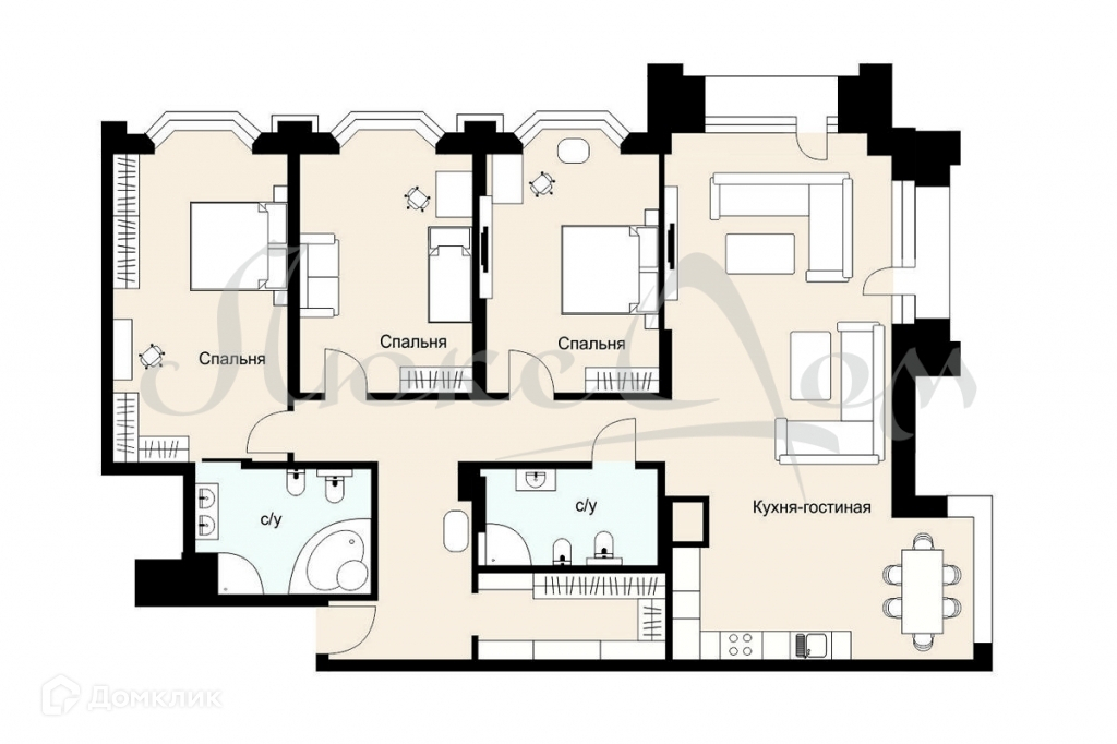 Планировка: мастер спальня с с\у, 2 спальни (детские), просторная кухня-гостиная с 2-мя балконами, гардеробная и с\у.