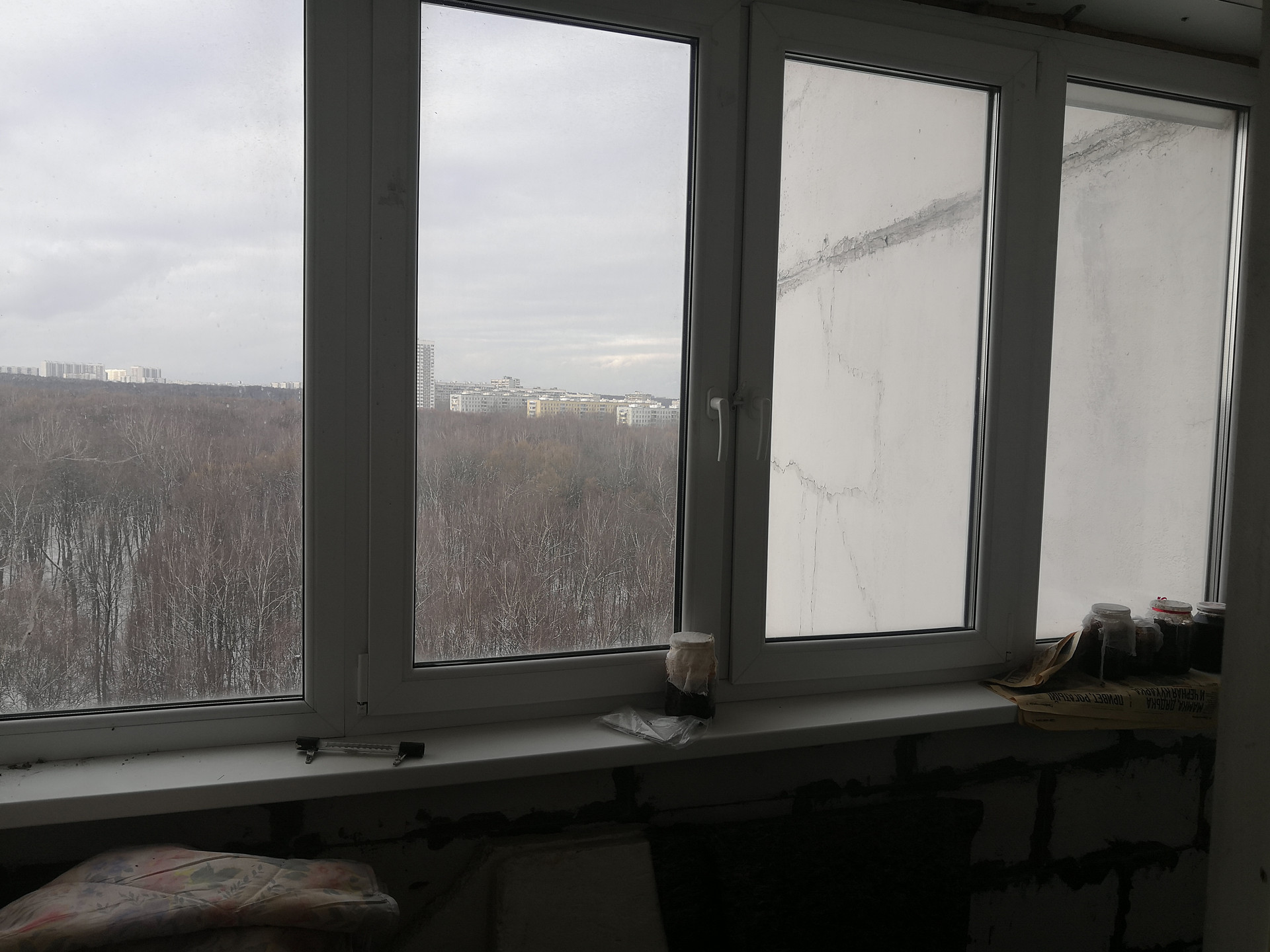 Вид из окон на лесопарк (кухня, большая комната, спальня) и внутренний двор (третья комната).