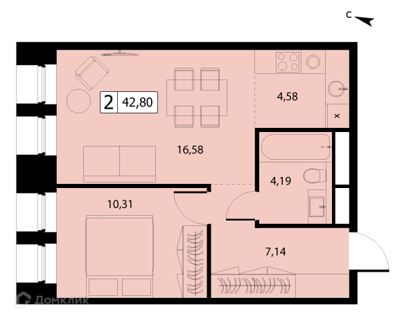 Общая площадь 42.8 м2