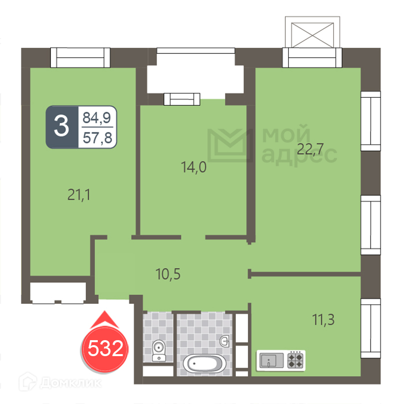 Общая площадь 84.9 м2