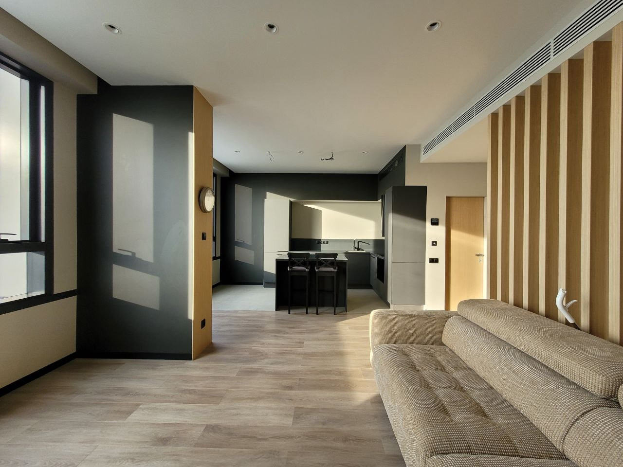 Удачное планировочное решение: 2 изолированные комнаты, просторная гостиная-кухонная - 30 метров, с 2мя панорамными окнами, гардеробная, 2 с/у.