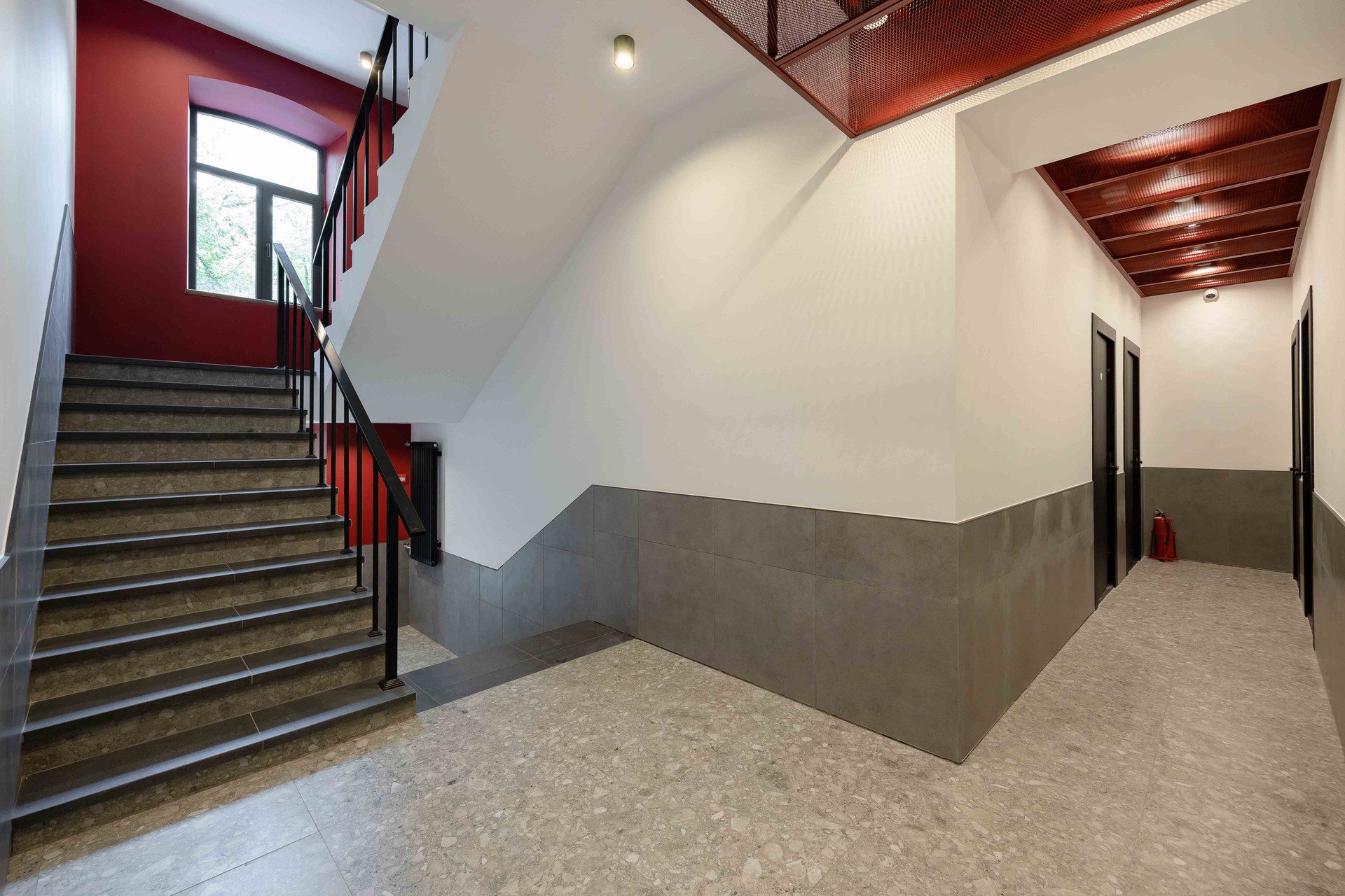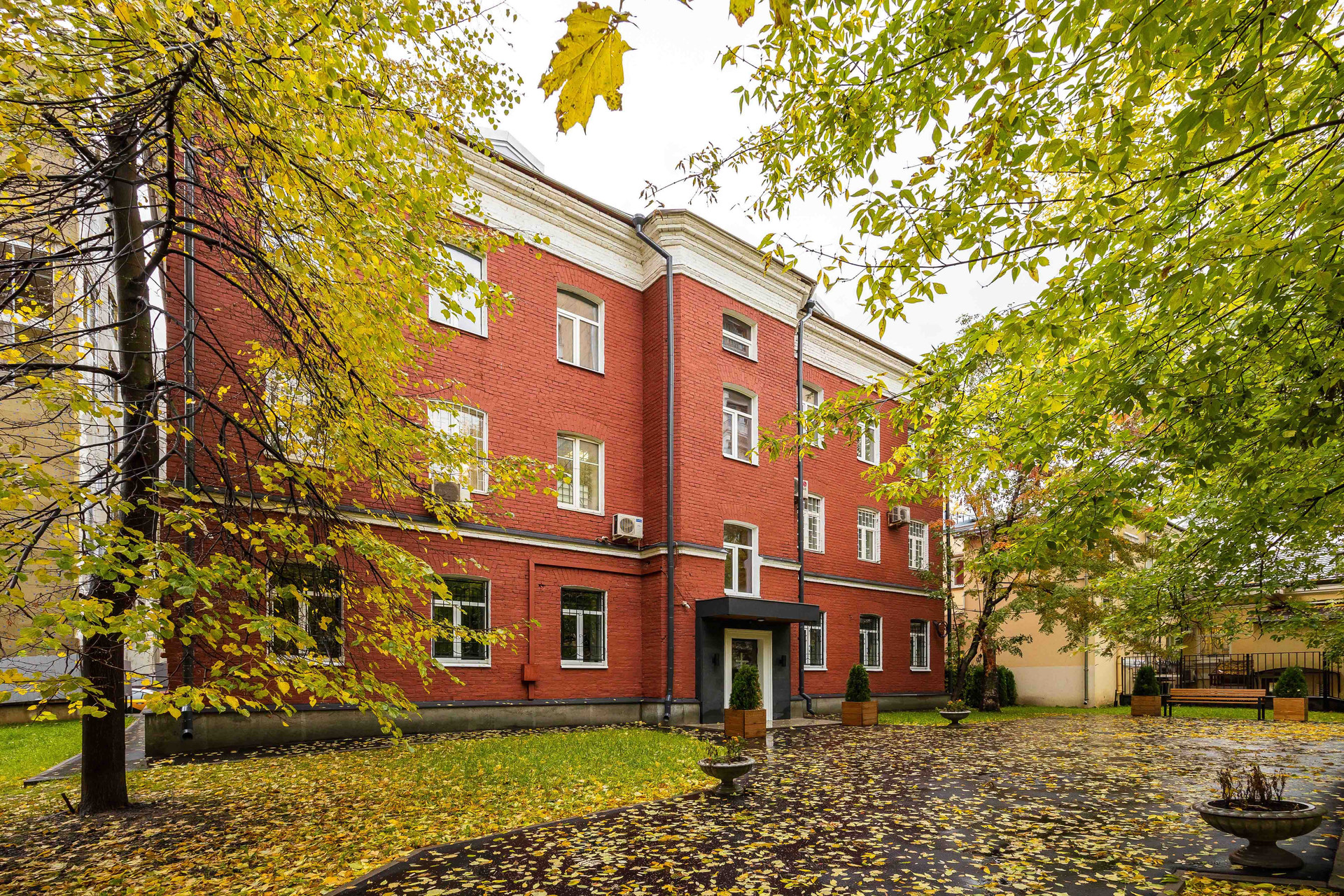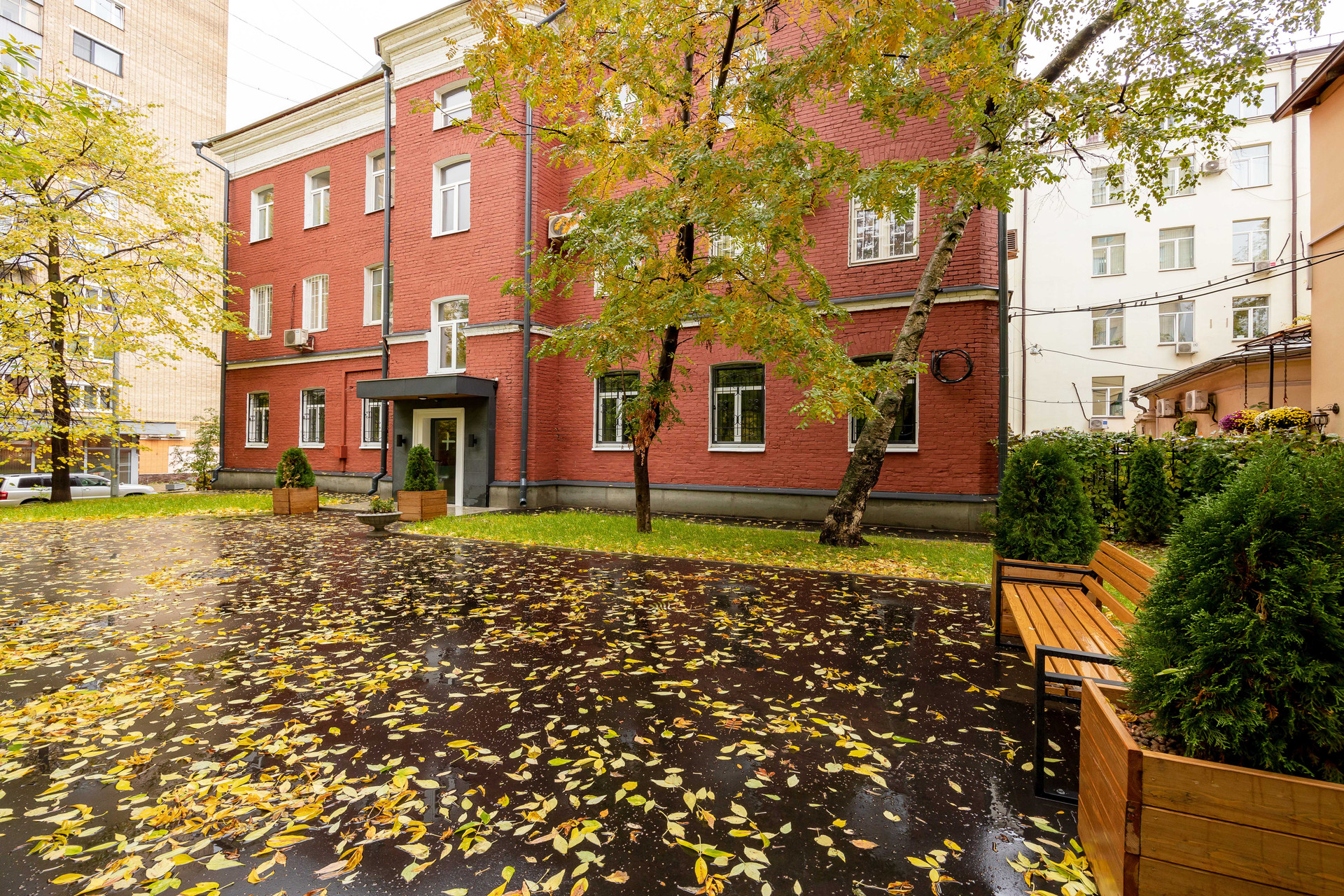 В здании входная  группа  в стиле минимализма, остекление, выполнен монтаж новых инженерных систем. Прилегающая территория благоустроена, имеется парковка.