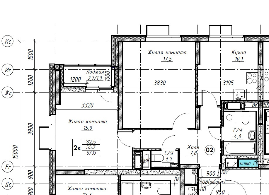 Жилая площадь 32.5 м2