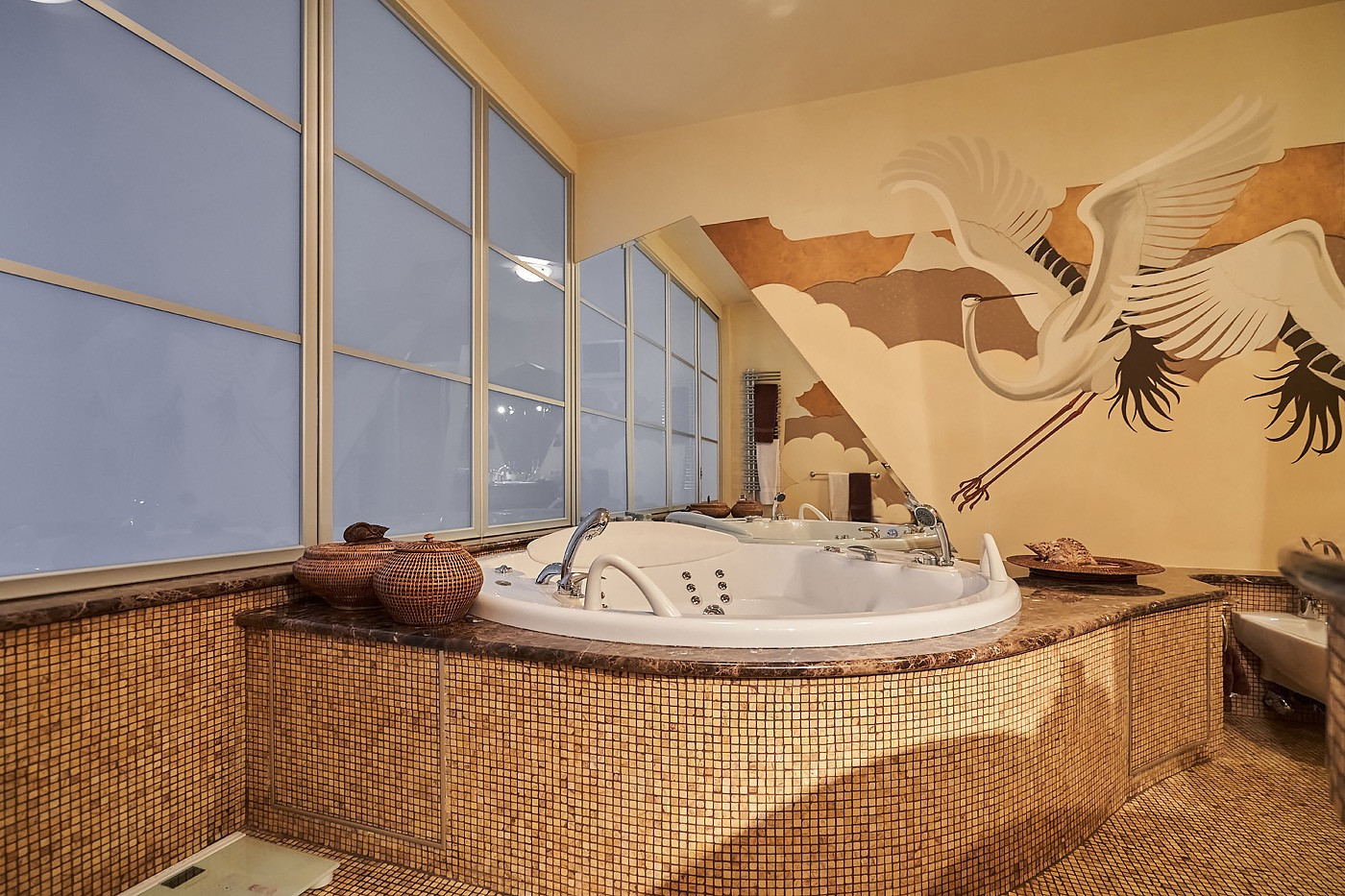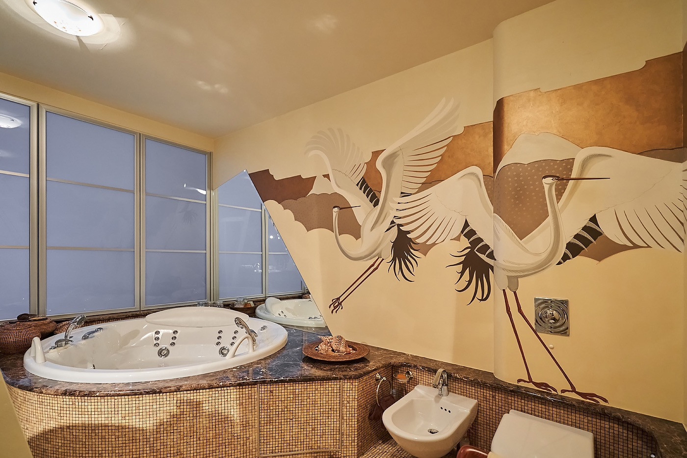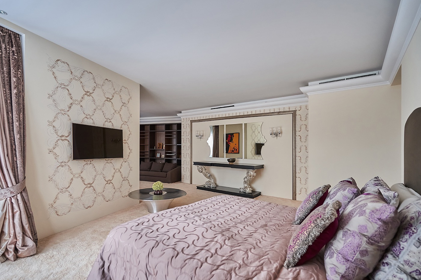 В квартире детская комната с своим сан узлом, большая кухня-гостинная 65 кв,м, с панорамным остеклением в пол с потрясающими видами с гостевым сан узлом и кладовой комнатой, массажный кабинет, рабочий кабинет, 3 просторные гардеробные комнаты, хозяйская мастер-спальня с гардеробной комнатой и большим сан узлом с джакузи и душевой, разделенная на зону отдыха и зону с библиотеки, где также можно устроить зону просмотра кино.