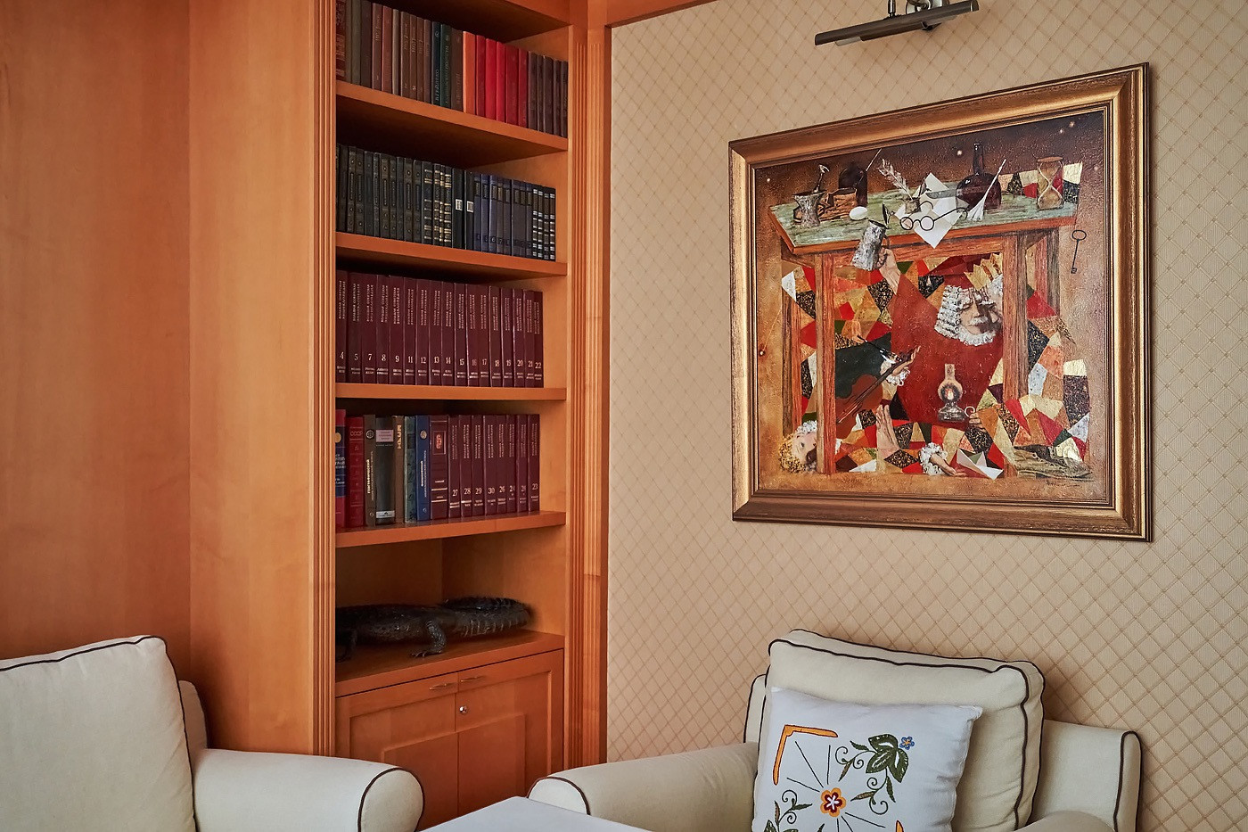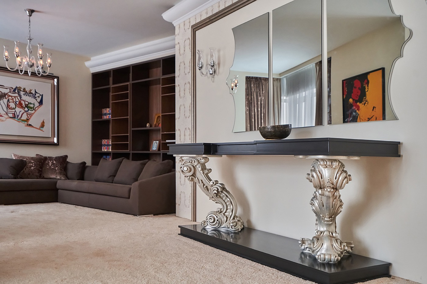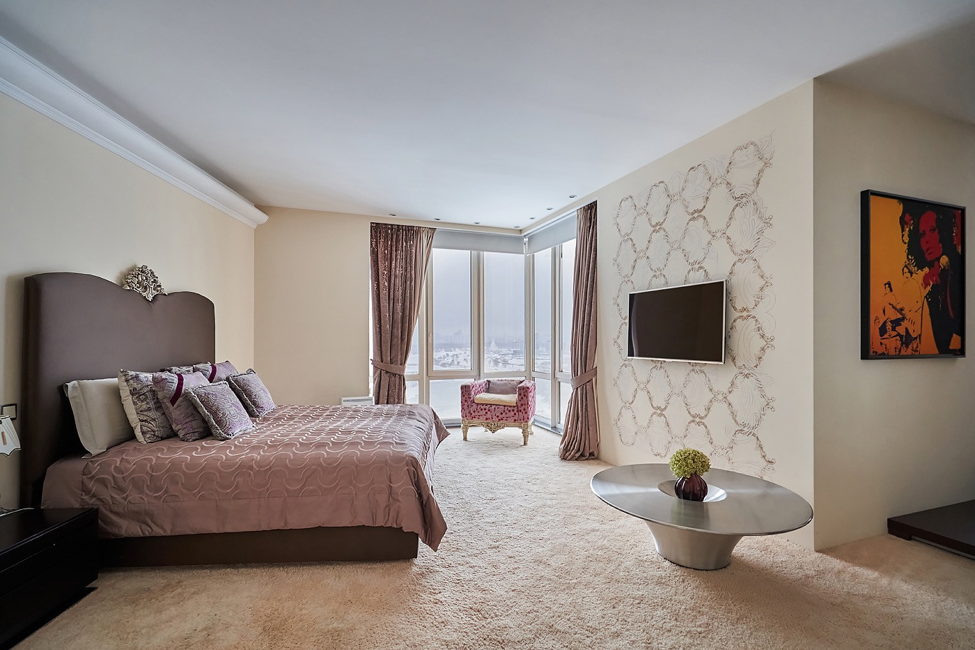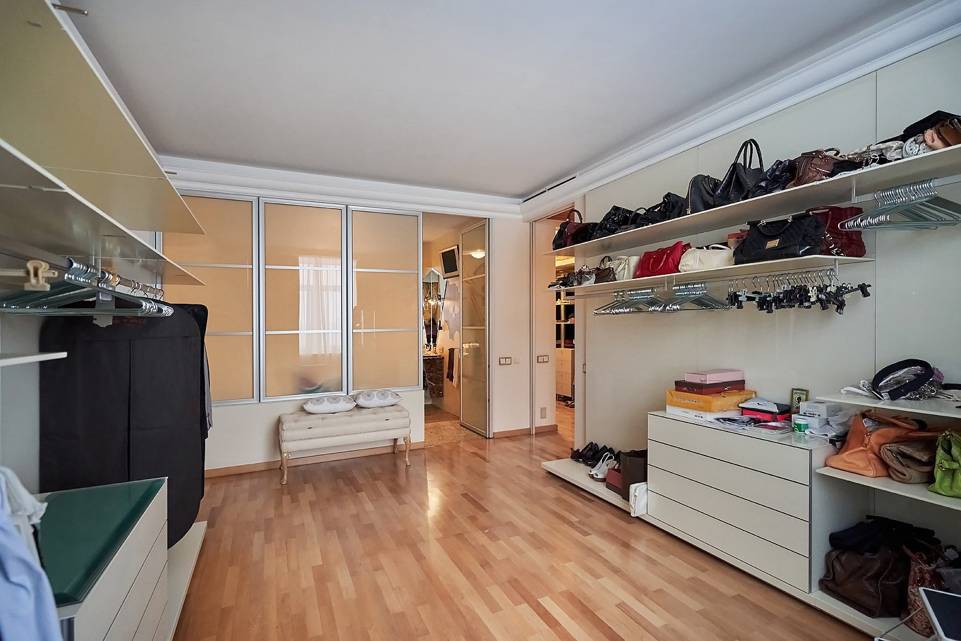 В квартире детская комната с своим сан узлом, большая кухня-гостинная 65 кв,м, с панорамным остеклением в пол с потрясающими видами с гостевым сан узлом и кладовой комнатой, массажный кабинет, рабочий кабинет, 3 просторные гардеробные комнаты, хозяйская мастер-спальня с гардеробной комнатой и большим сан узлом с джакузи и душевой, разделенная на зону отдыха и зону с библиотеки, где также можно устроить зону просмотра кино.
