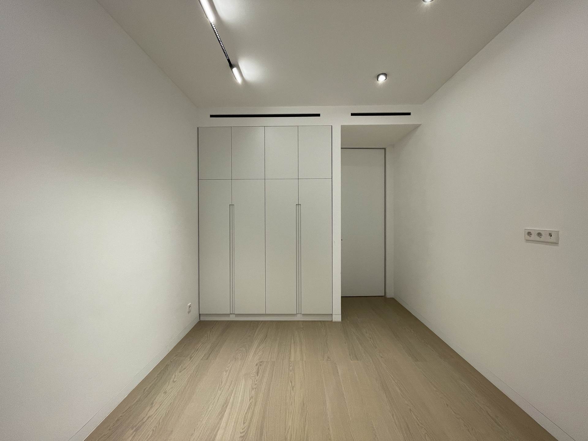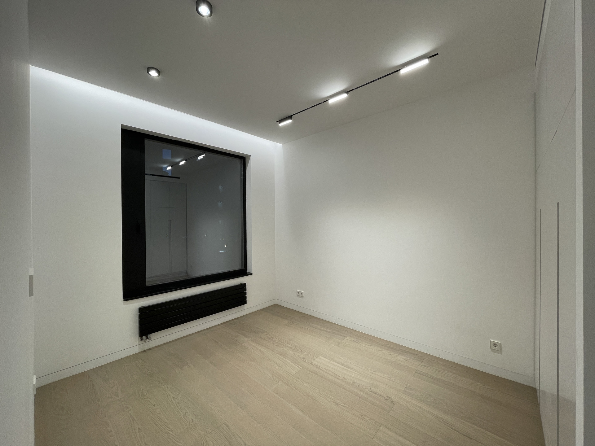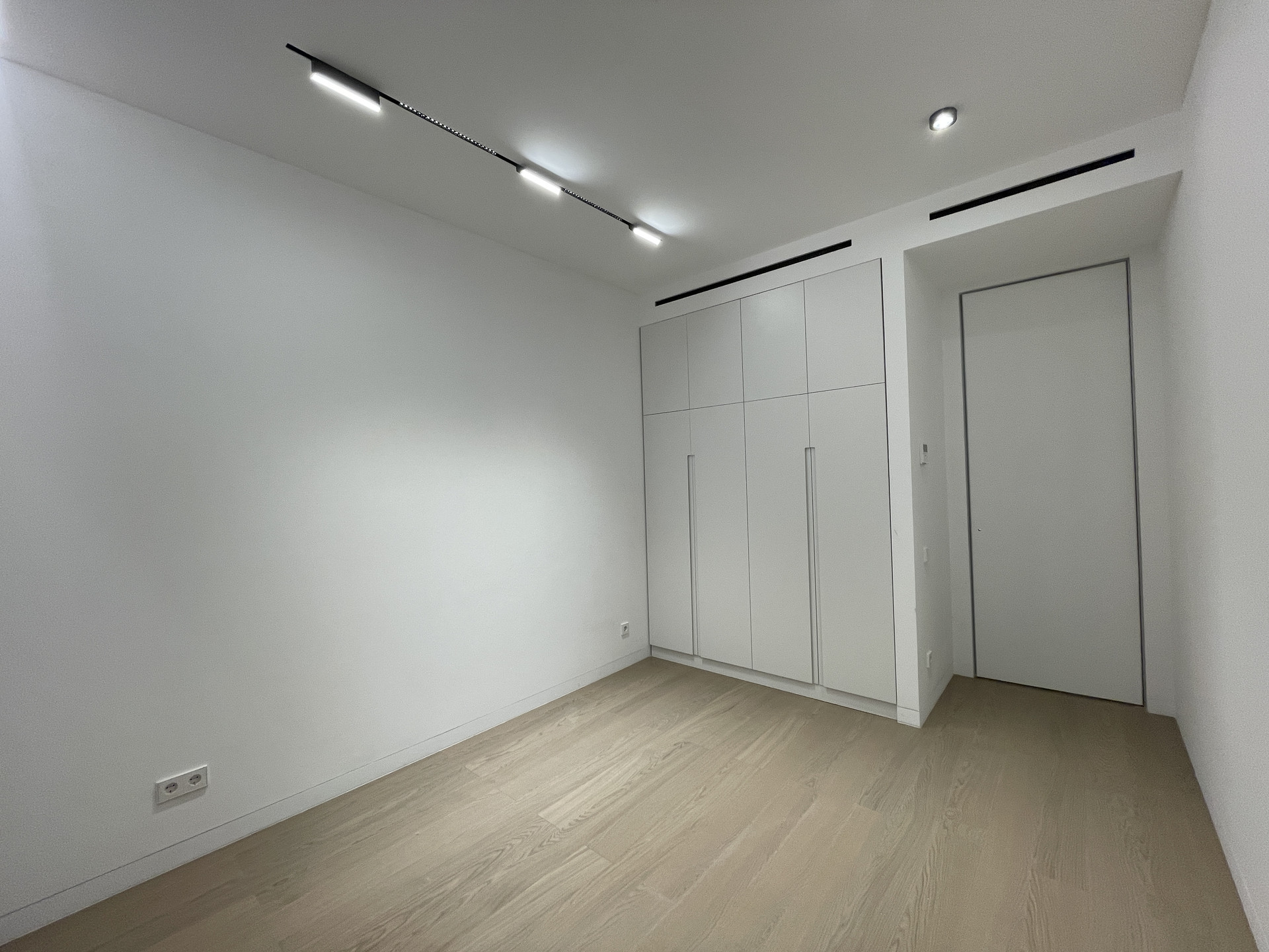 Скрытые межкомнатные двери 2,6 метра высотой, скрытые плинтусы, скрытые трековые светильники. Селективная паркетная доска из дуба, без сучков и заболони. Трехметровые потолки.