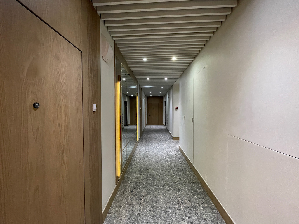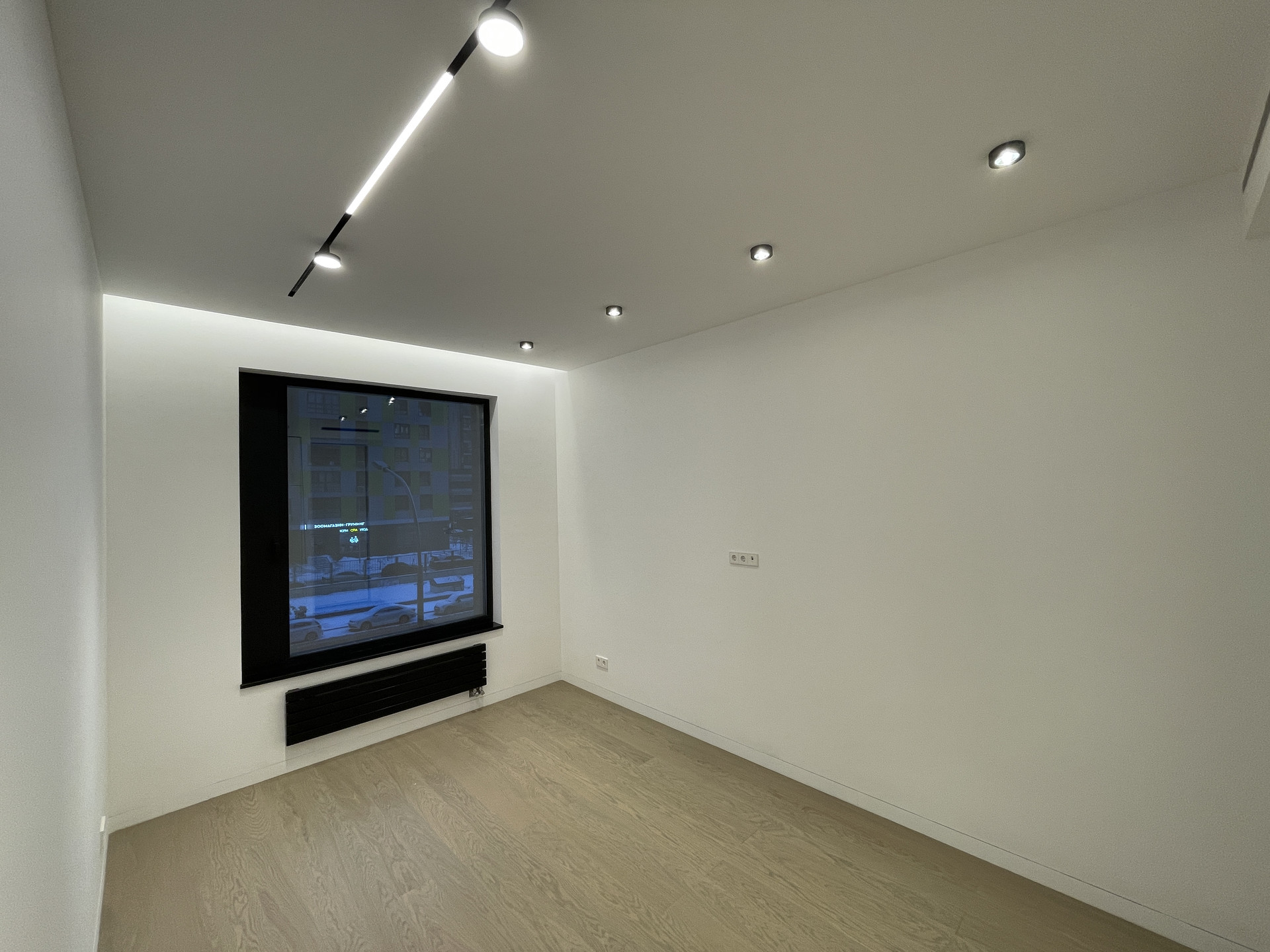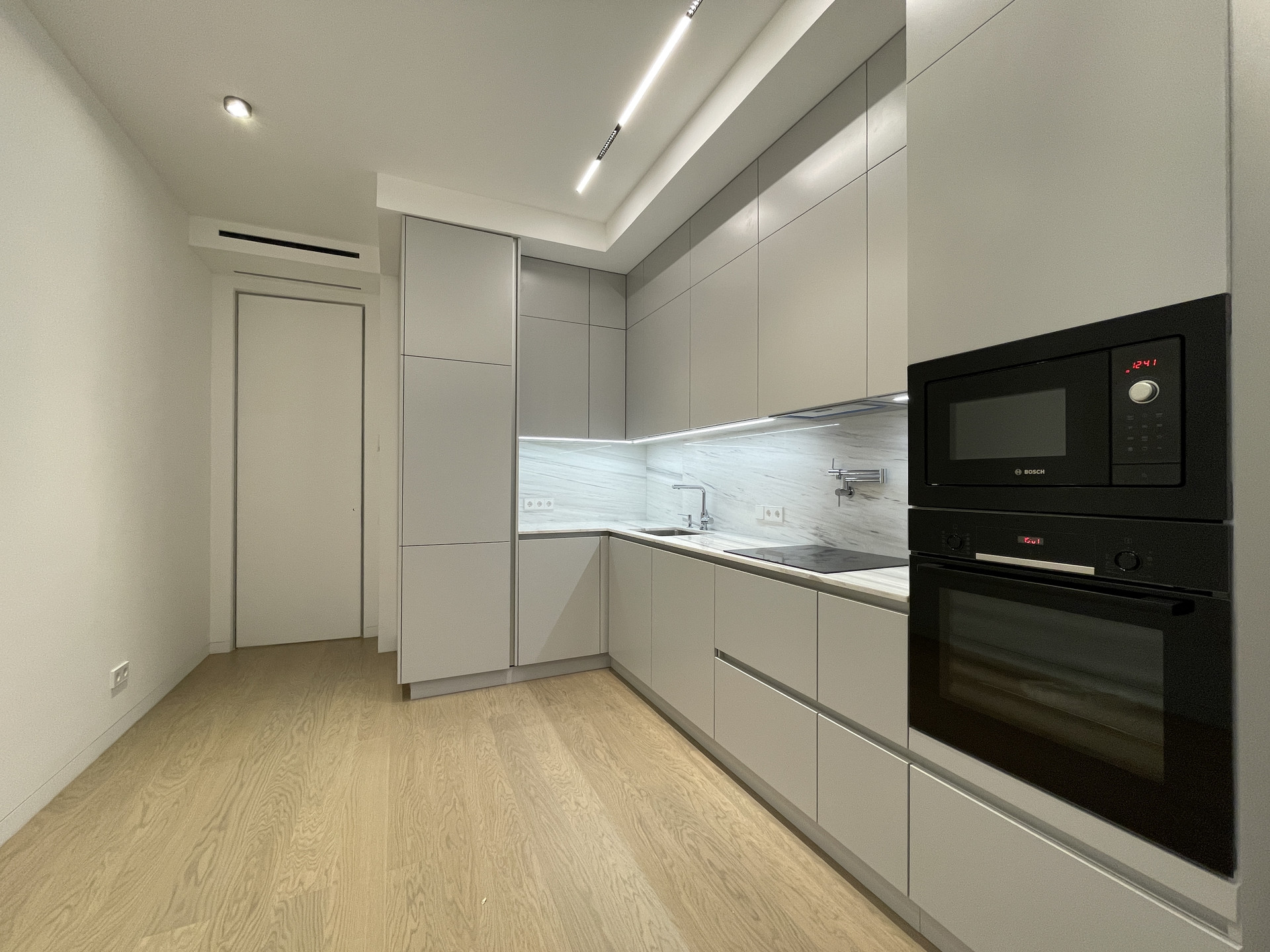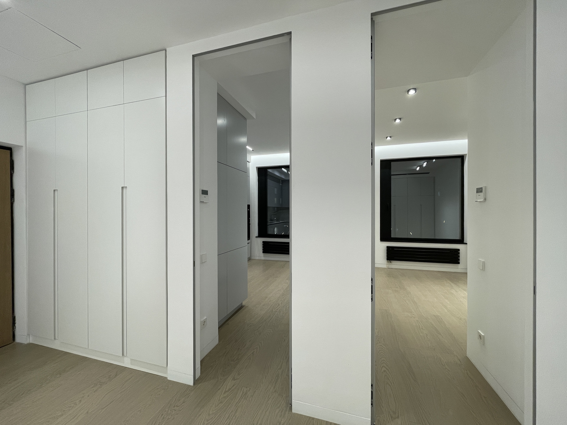 Скрытые межкомнатные двери 2,6 метра высотой, скрытые плинтусы, скрытые трековые светильники. Селективная паркетная доска из дуба, без сучков и заболони. Трехметровые потолки.