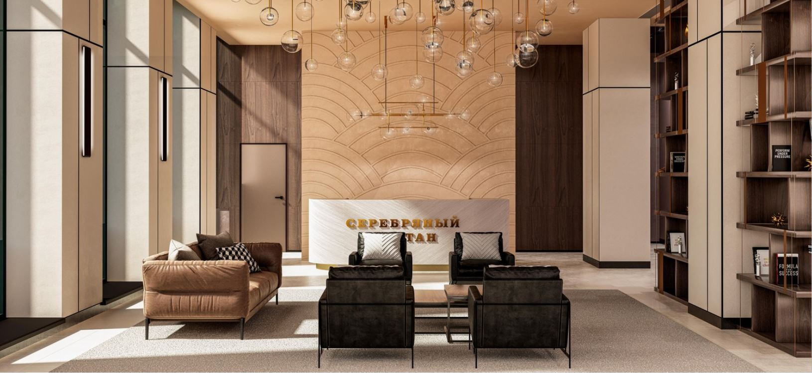 Достойная входная группа ЖК: выполнена изящная дорогостоящая отделка в стиле ар-деко с историческими отсылками к прошлому. Благодаря панорамным окнам и потолкам высотой 4.7 метра лобби просто залиты светом, а обустроенные мягкие зоны ожидания для гостей, лапомойки для питомцев, санузлы и помещения для хранения колясок демонстрируют, что застройщик позаботился обо всех и каждом.
