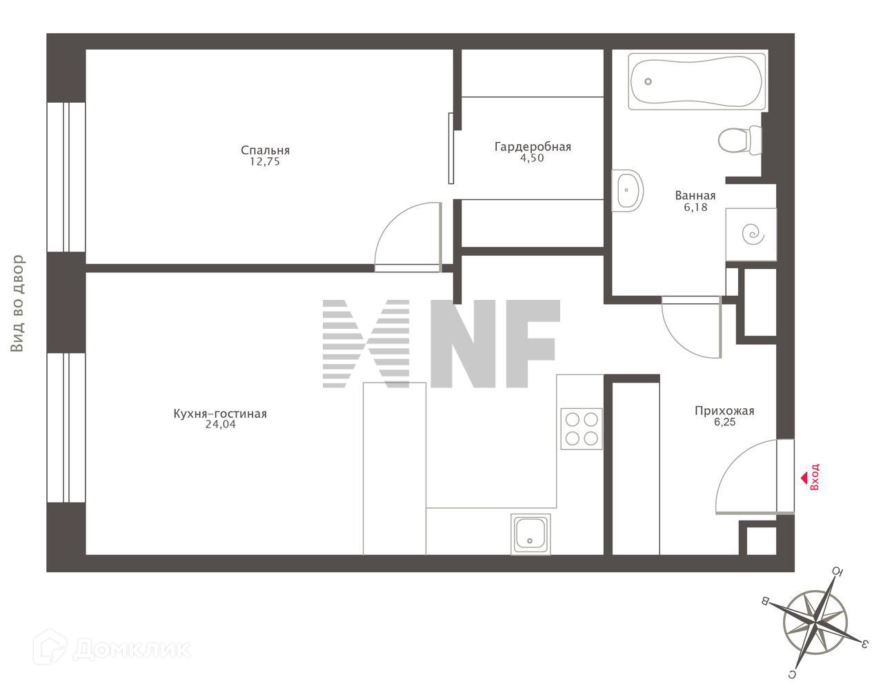 Планировка: гостиная-кухня, изолированная спальня, ванная комната, гардеробная.