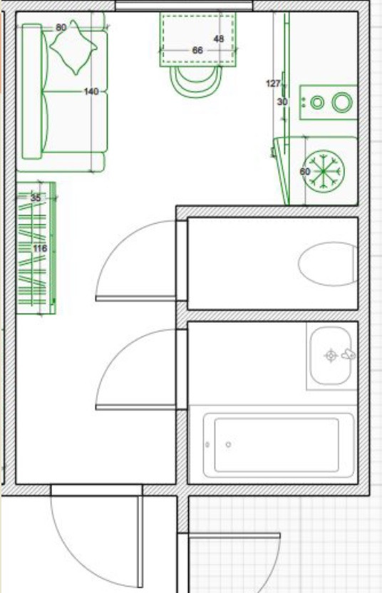 Студия прямоугольной формы, что позволяет удобно разместить кухонную и спальную зону.