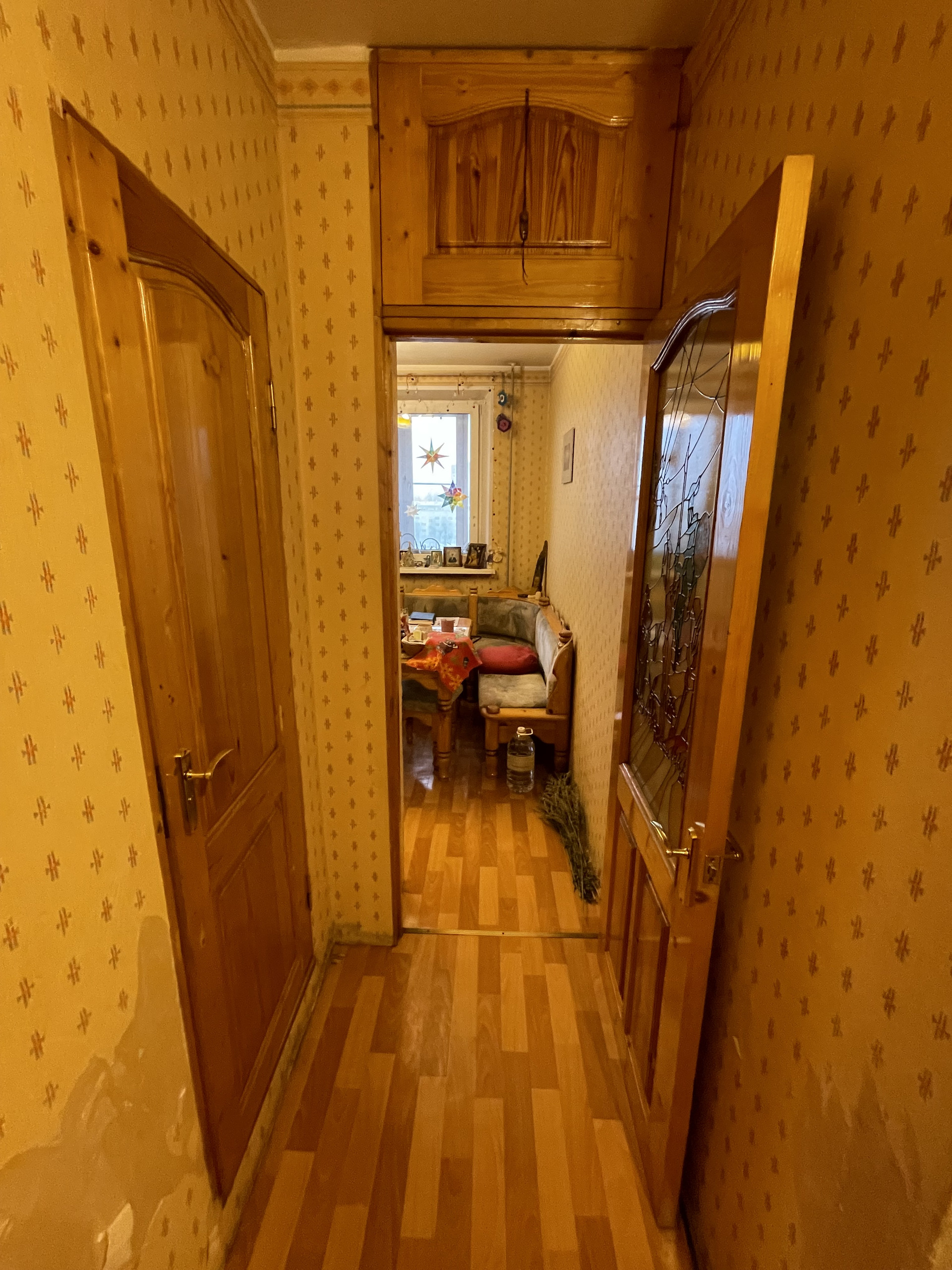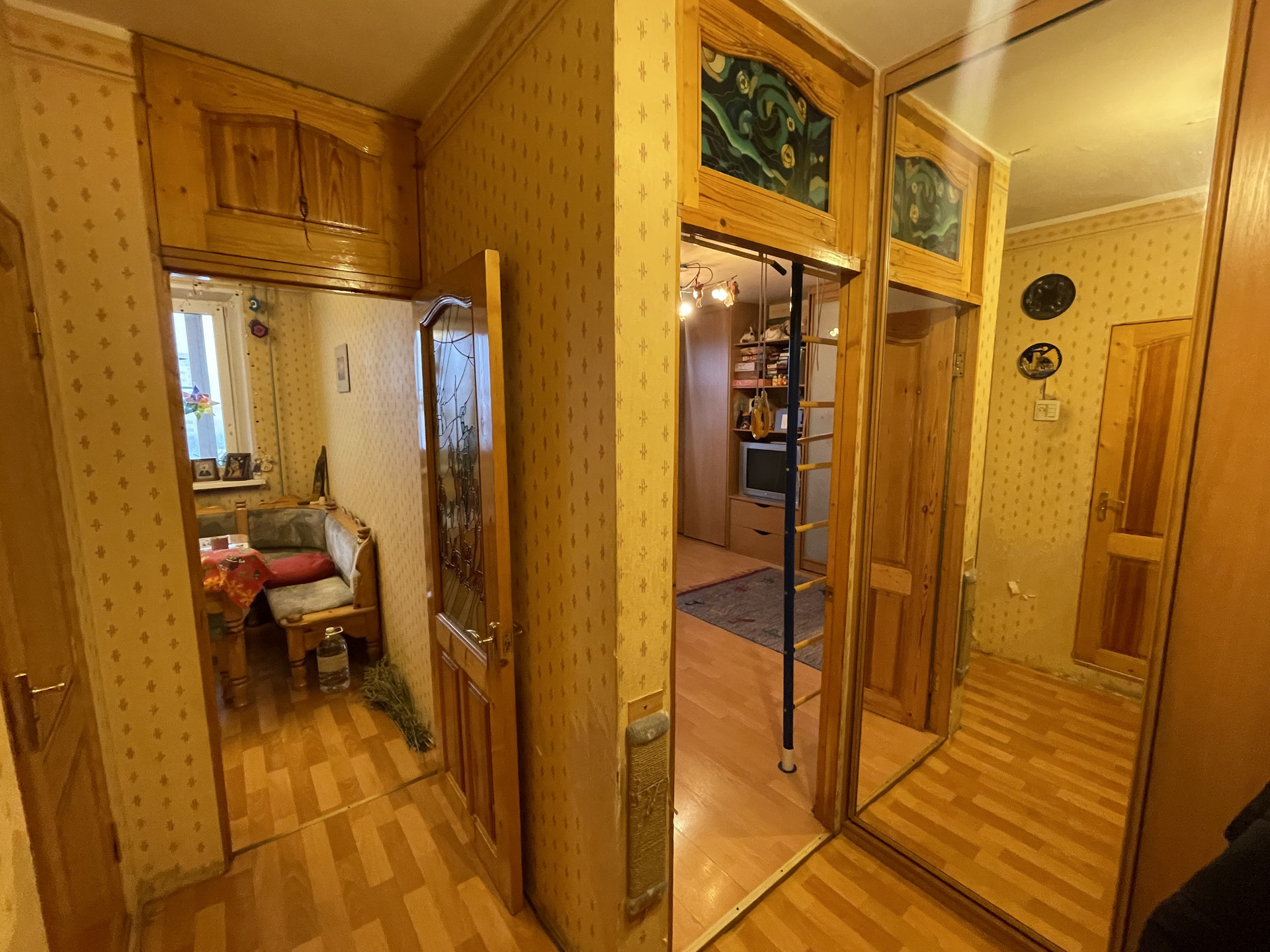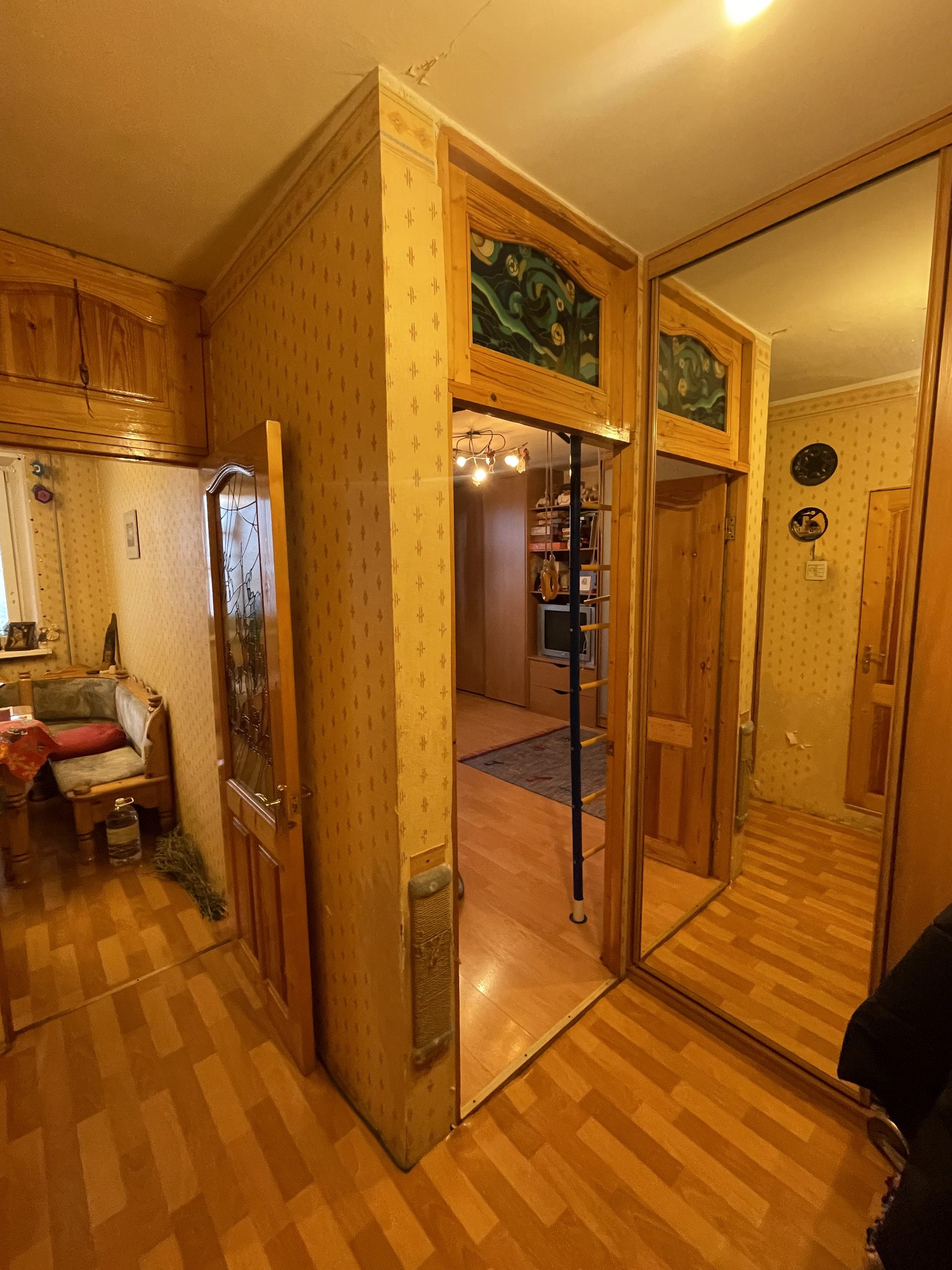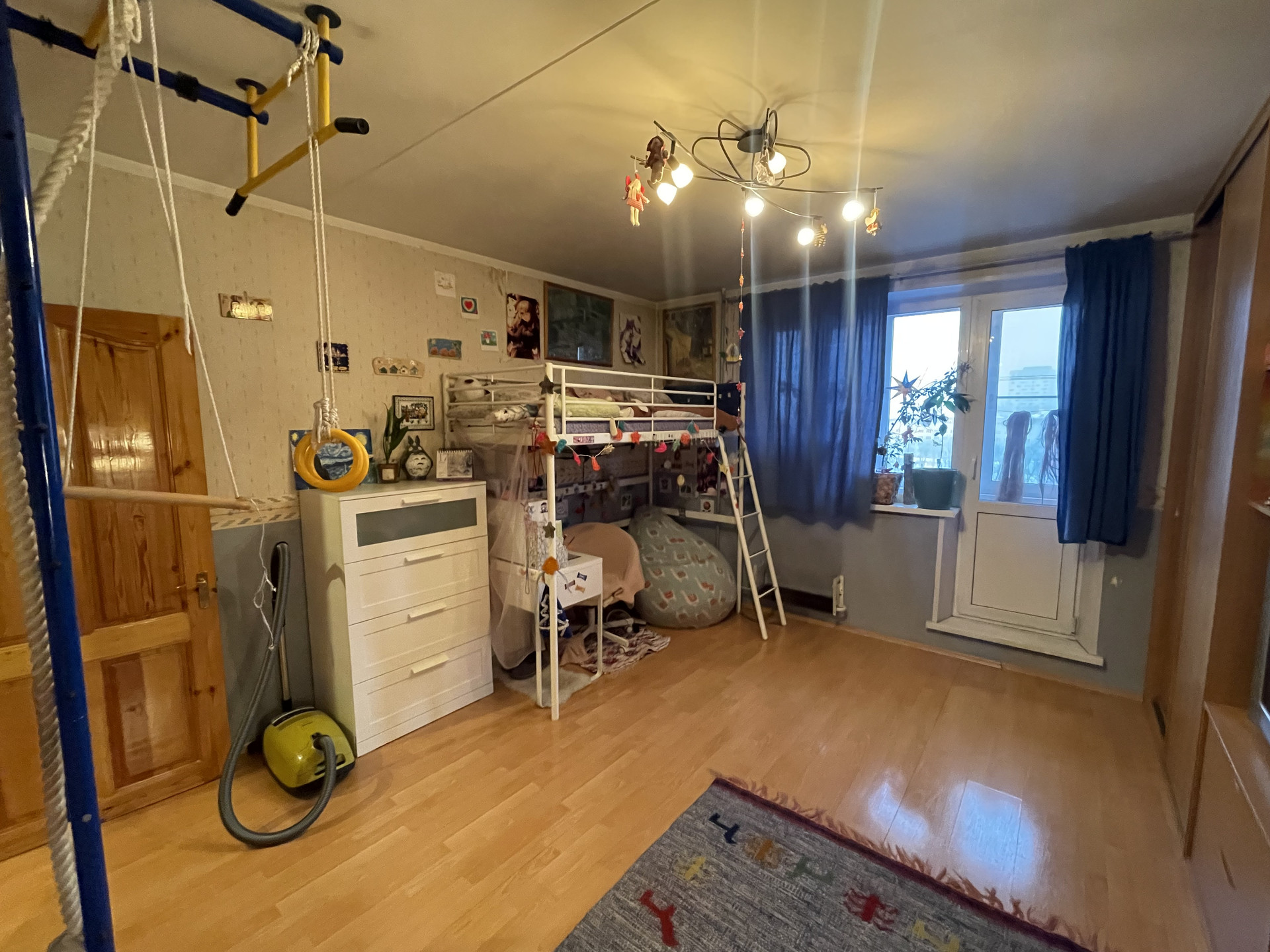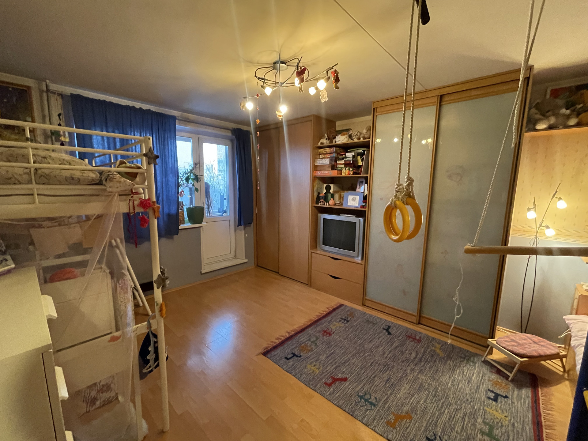 Квартира в хорошем жилом состоянии, без перепланировок, с адекватными соседями. Можно жить, можно сдавать. 2 застекленные лоджии, вид из окна на бульвар, закаты и салюты. В квартире встроенная мебель: прихожая (вешалки, шкаф с зеркалом), шкаф в комнате (книги, одежда), кровать-подиум и стеллаж.