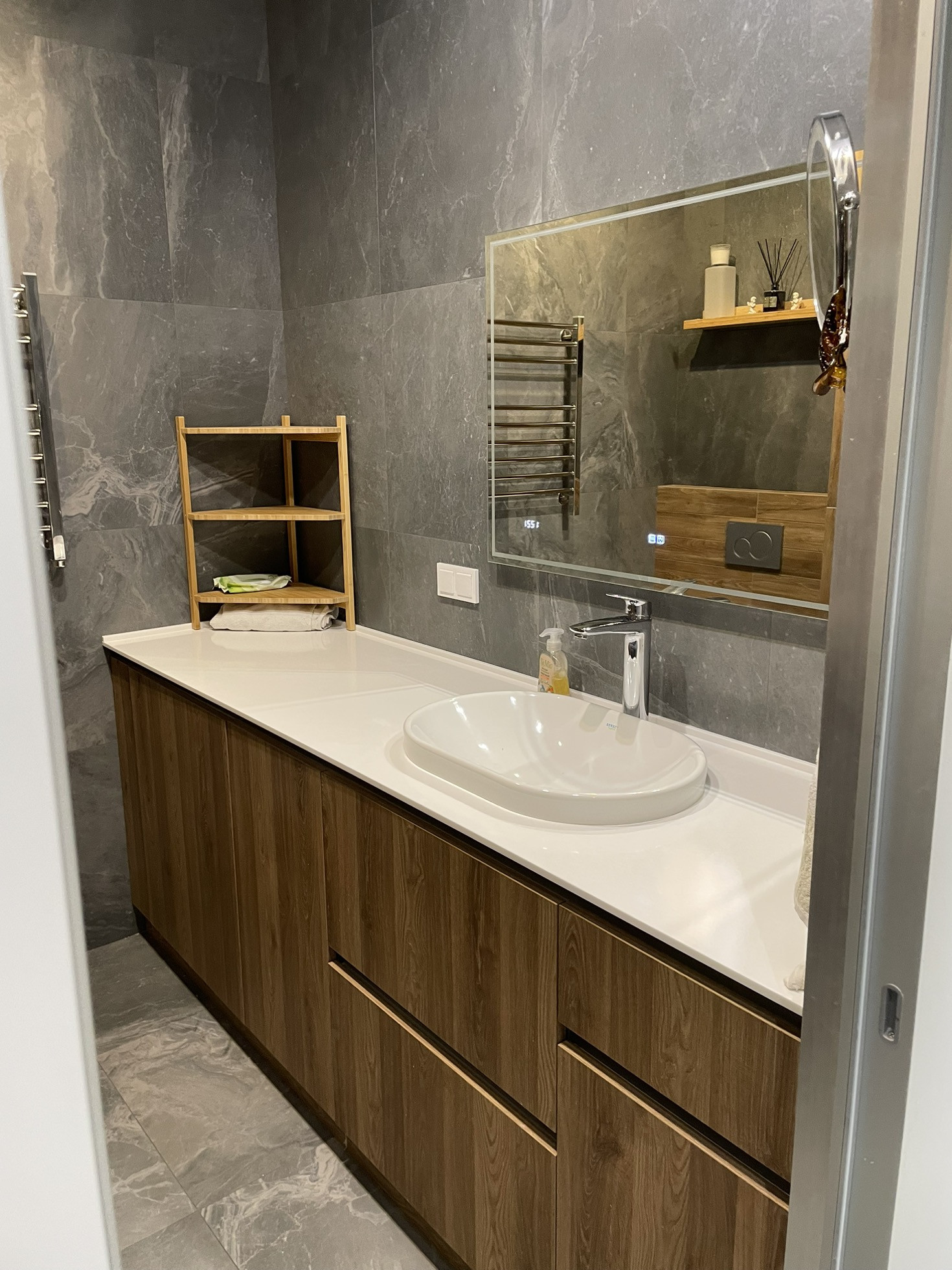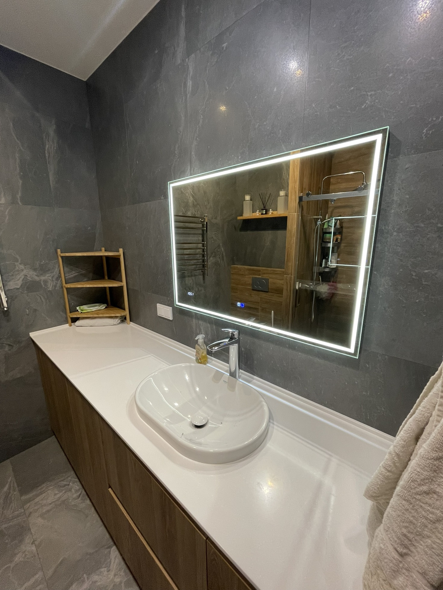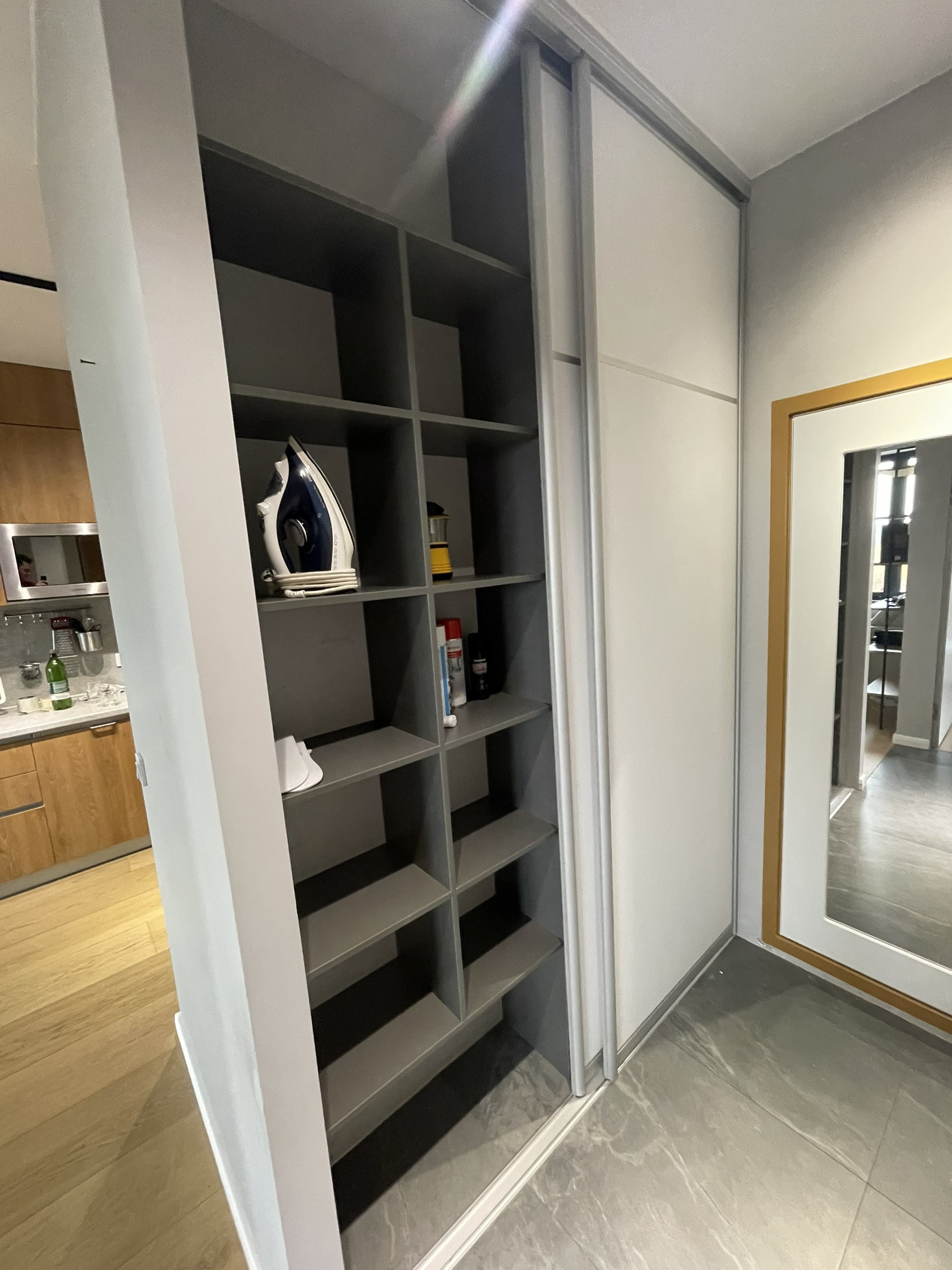Установлена мультисплит система кондиционирования, кондиционер в каждой комнате с отдельным пультом. Ванная реализовывалась как в отеле, встроенная стиральная машина с сушкой (сушит хорошо), корзина для белья, отдельная бутылочница под химию и несколько ящиков. Большущая душевая с термостатом (112х90). В квартире очень много места для хранения: шкаф в спальне, шкаф в коридоре с отдельным пространством для обуви, высокие шкафы в кухне (под потолок).